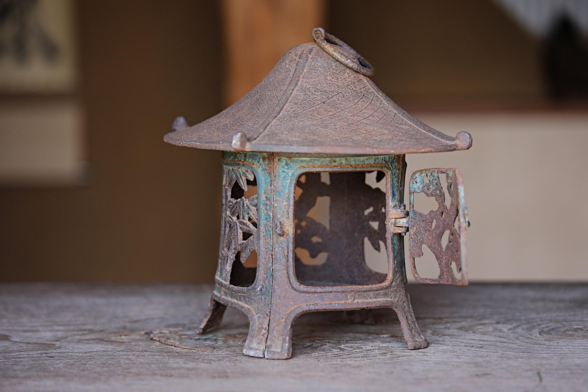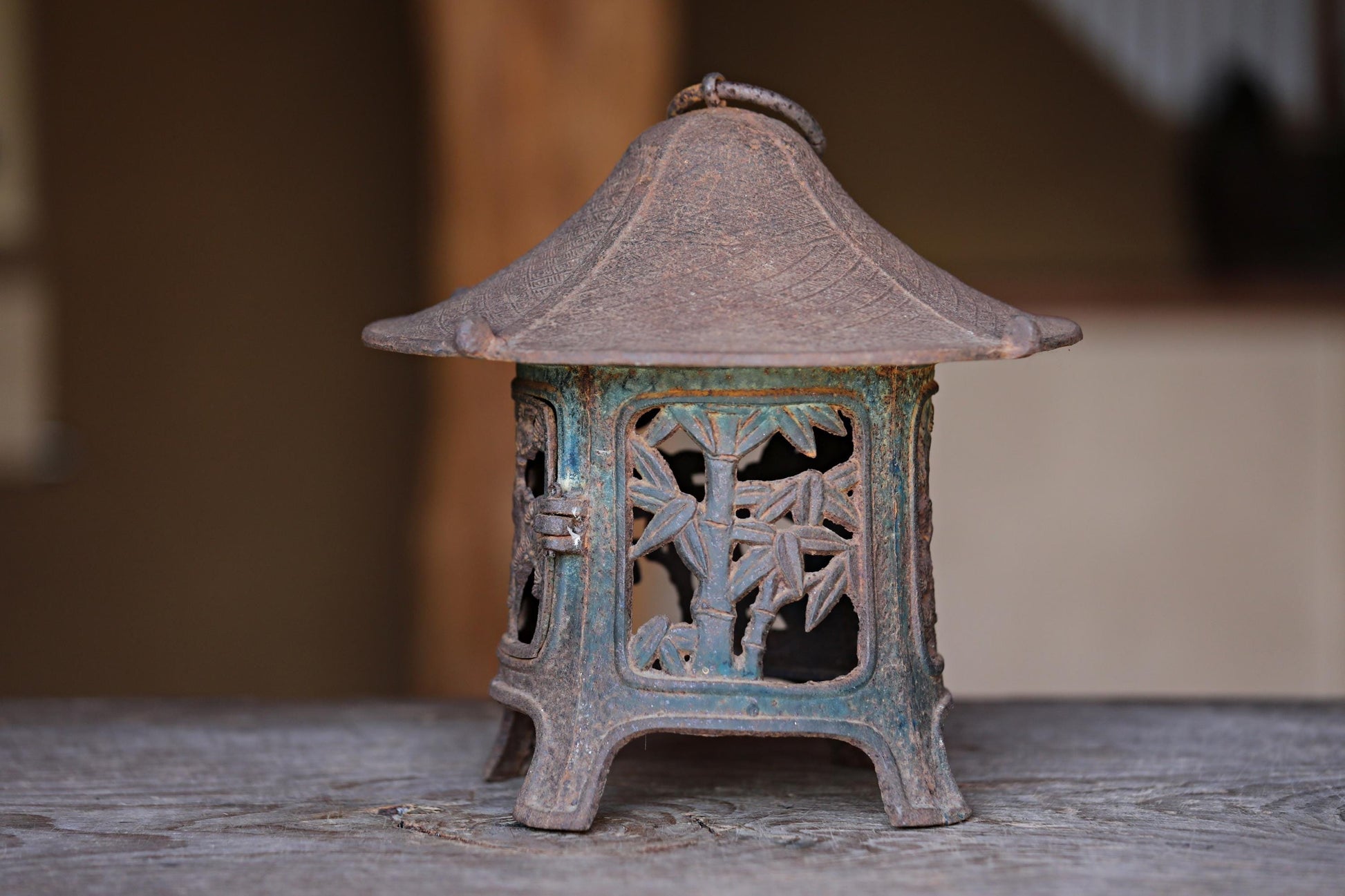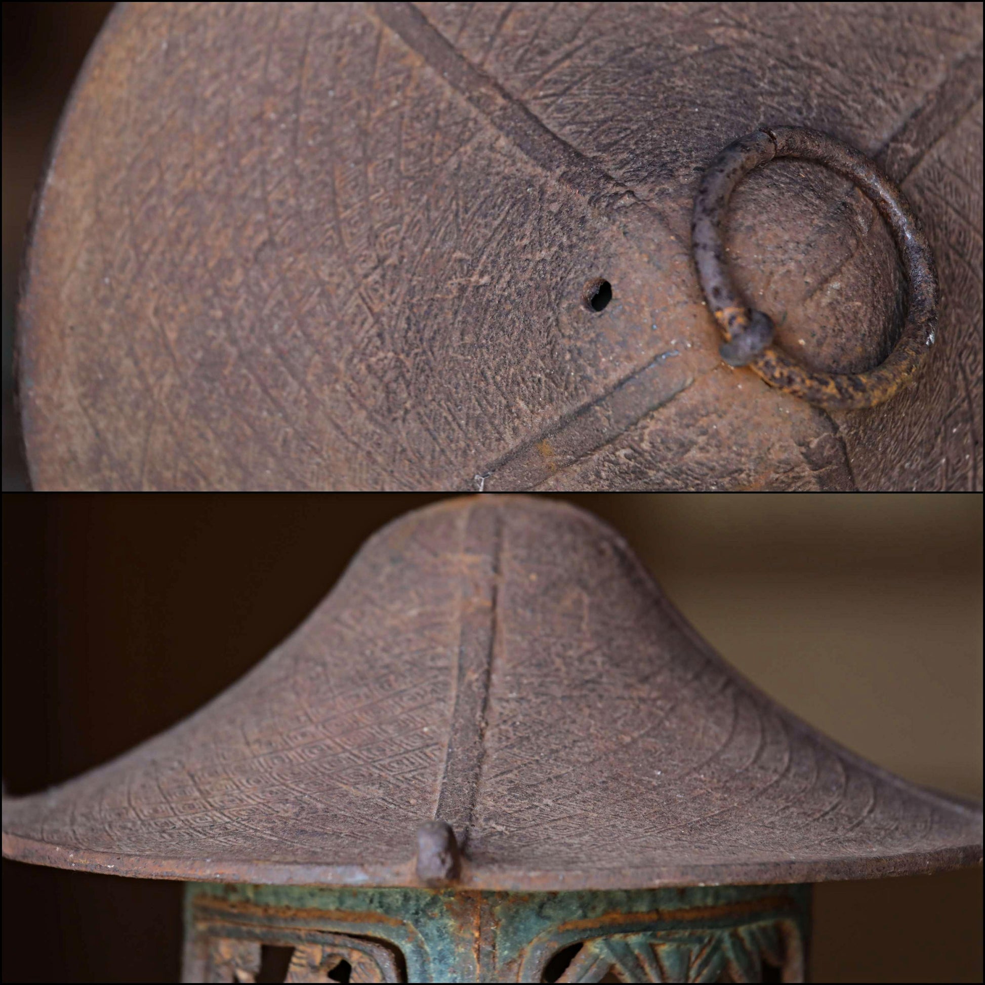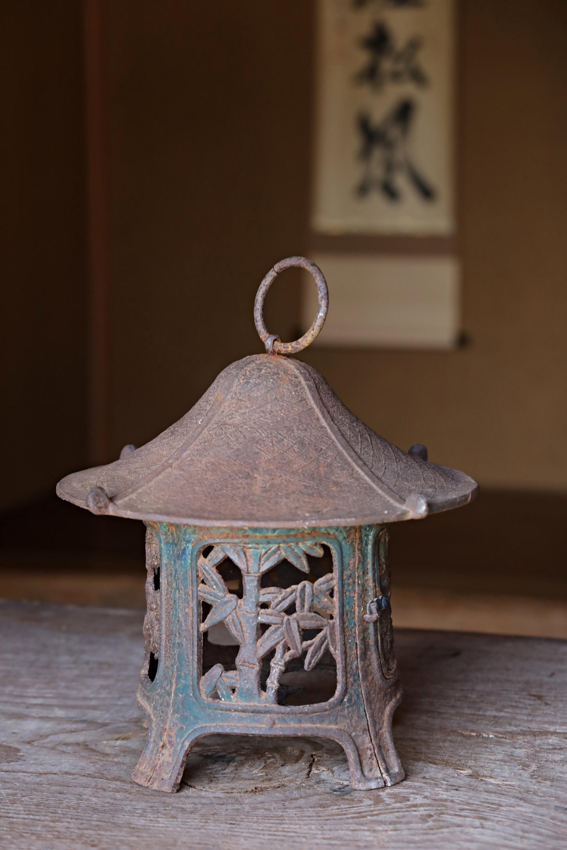 Japanese vintage cast iron metal Lantern, garden lamp, Buddhist Hanging Lantern furniture Tsuridoro Andon with Pine Bamboo fretwork H10.2in/H26cm.