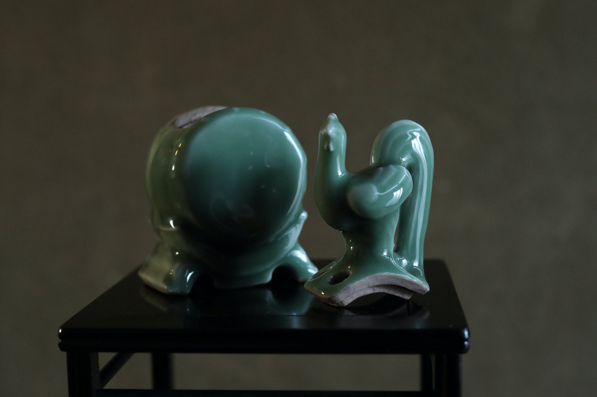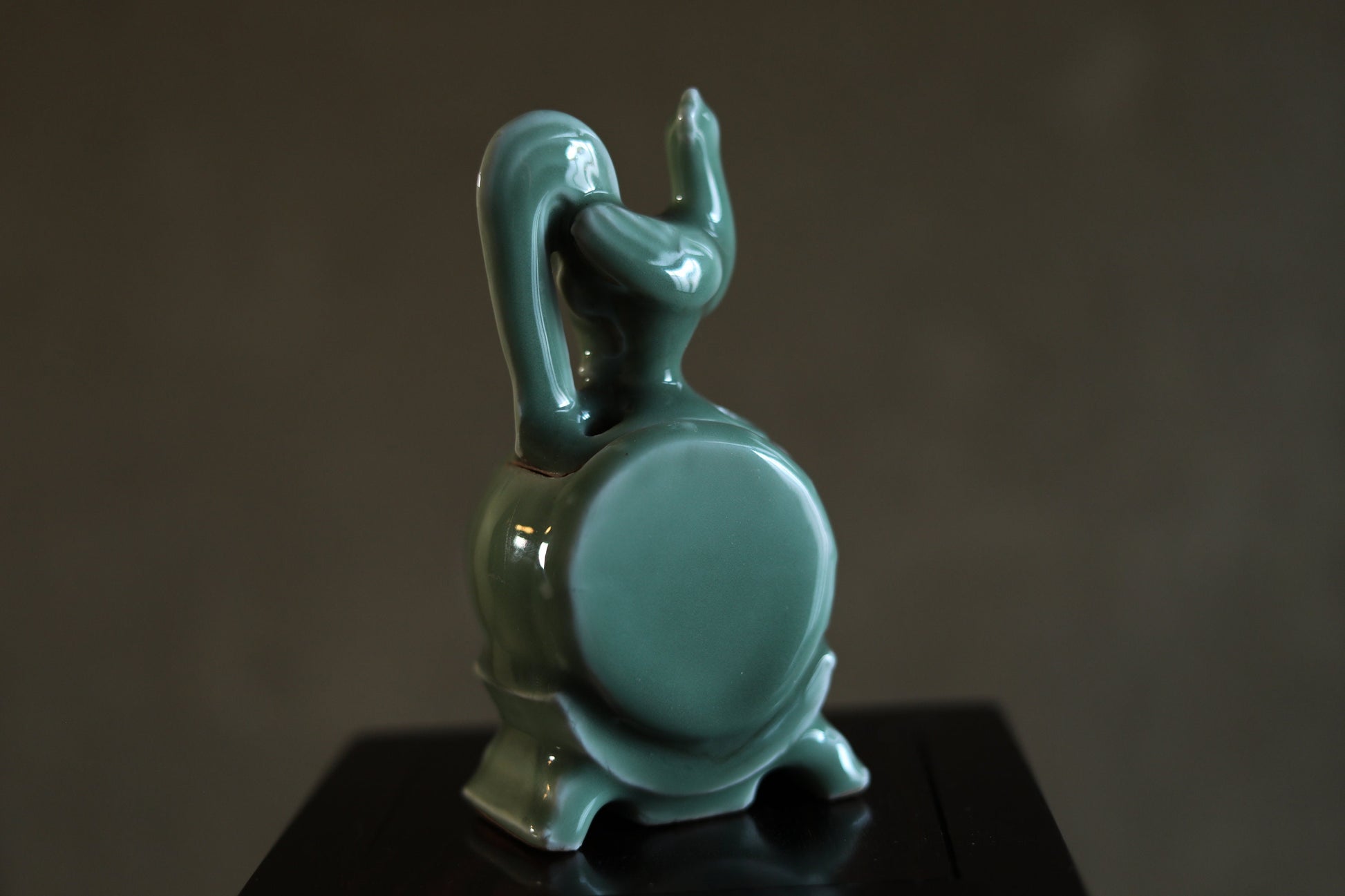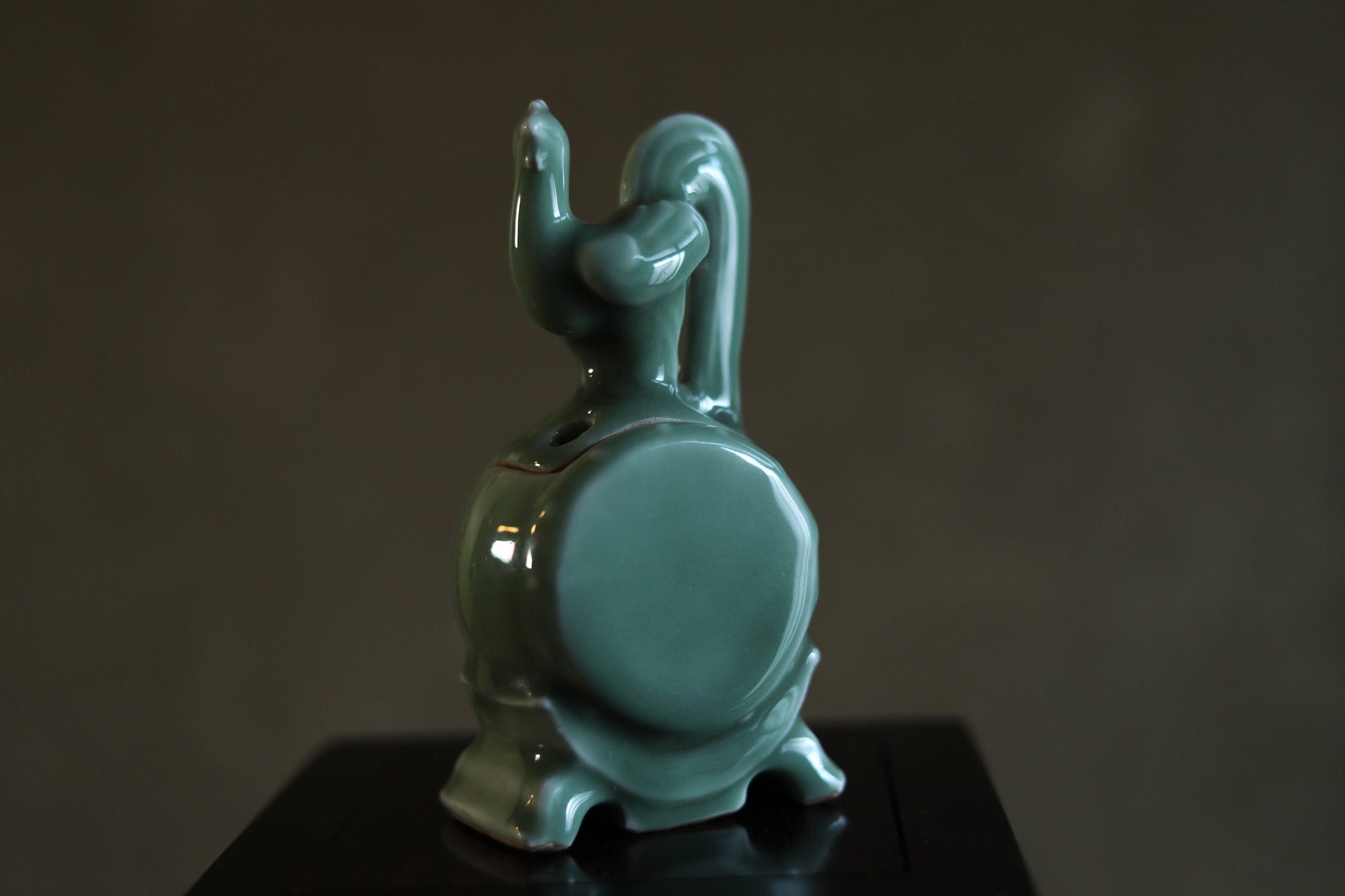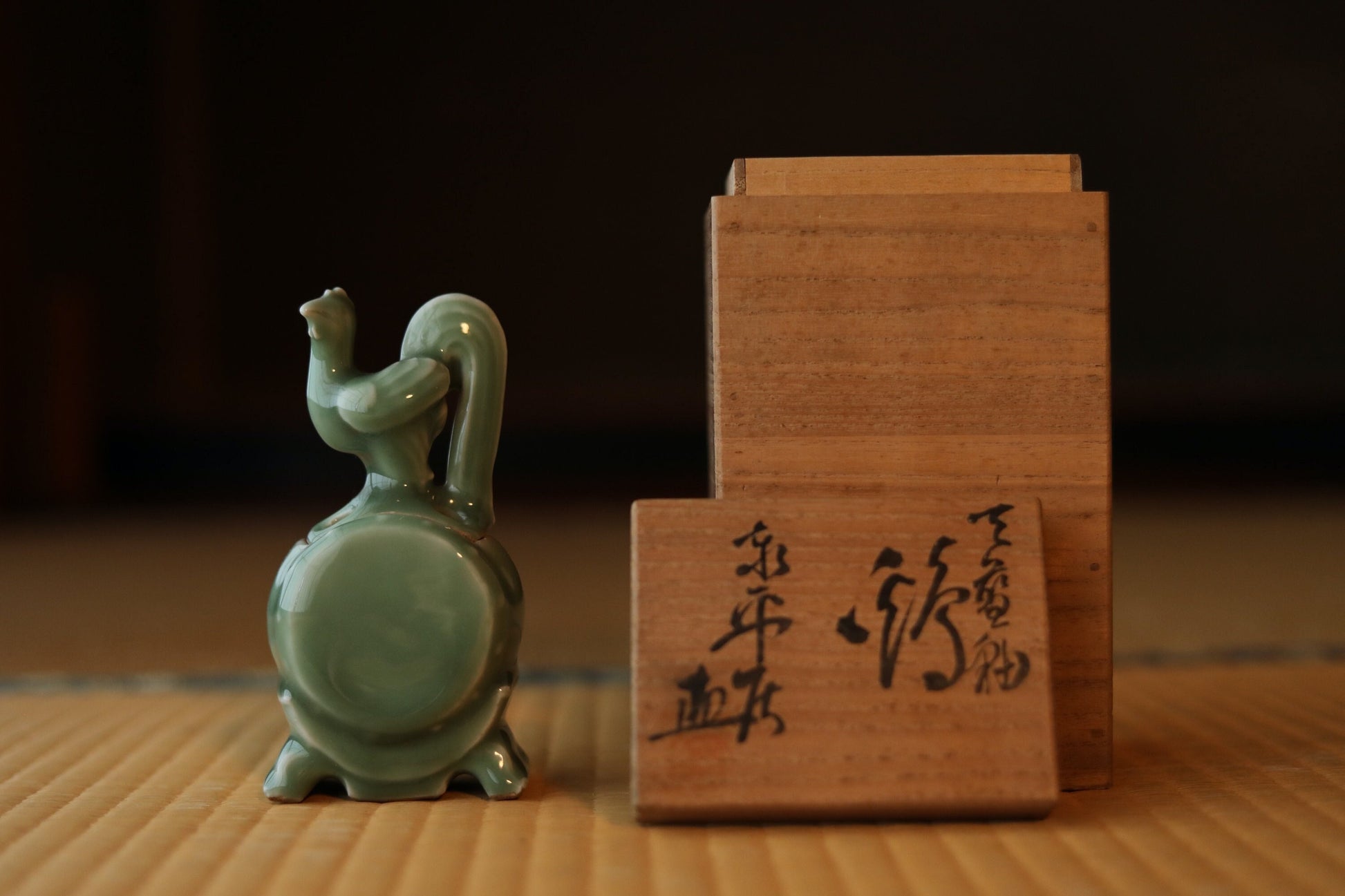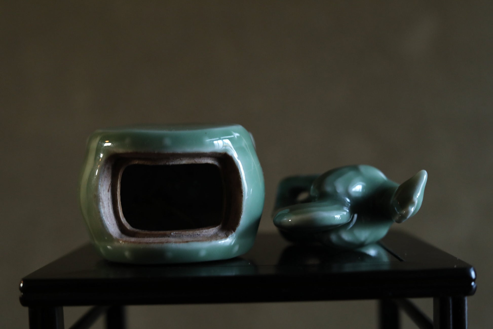 Japanese vintage Celadon porcelain censer bird "hen on the drum" with Kanji signature, wooden box, Incense burner H5.7×2.8in/H14.5×7cm