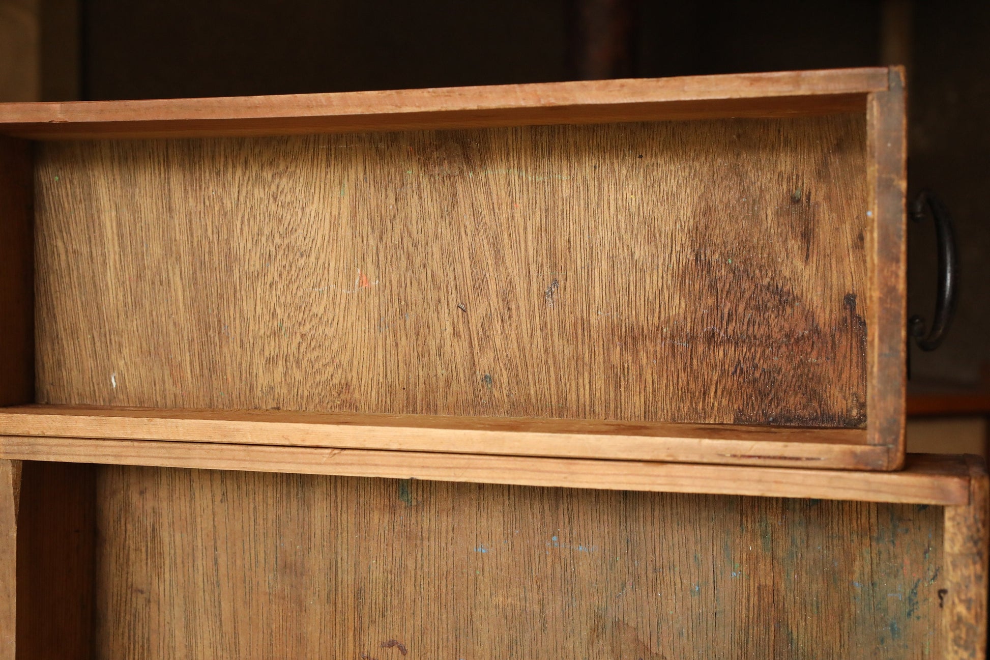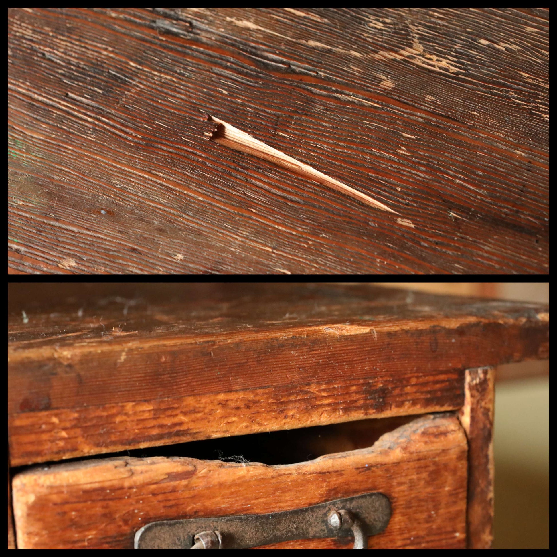 Overall, it is in good condition. However, there are some soreness, scratches and stains on the wood due to age. There is also a piece of wood missing from the top panel. One drawer is also missing a piece of wood. It is ready to use.