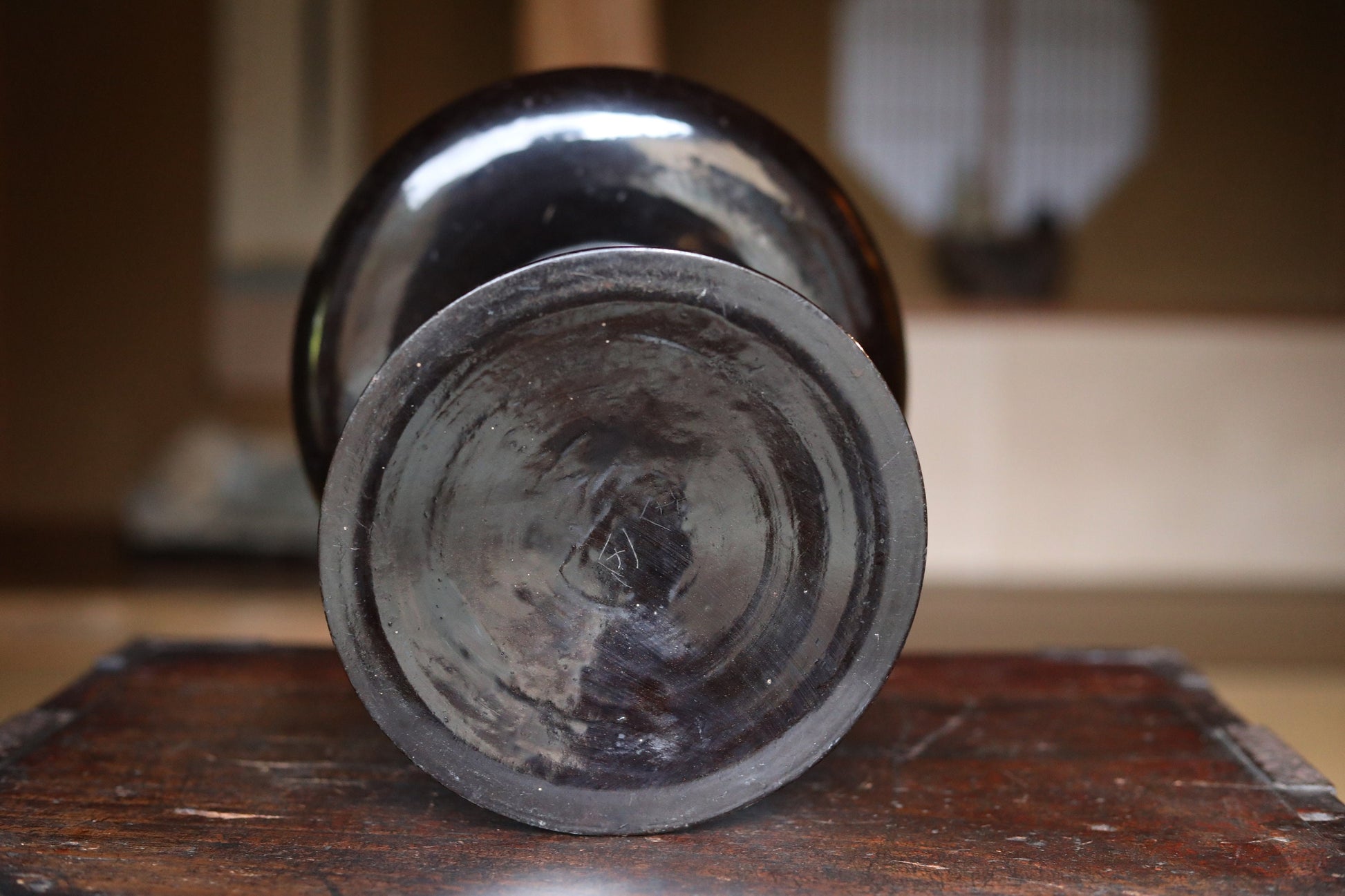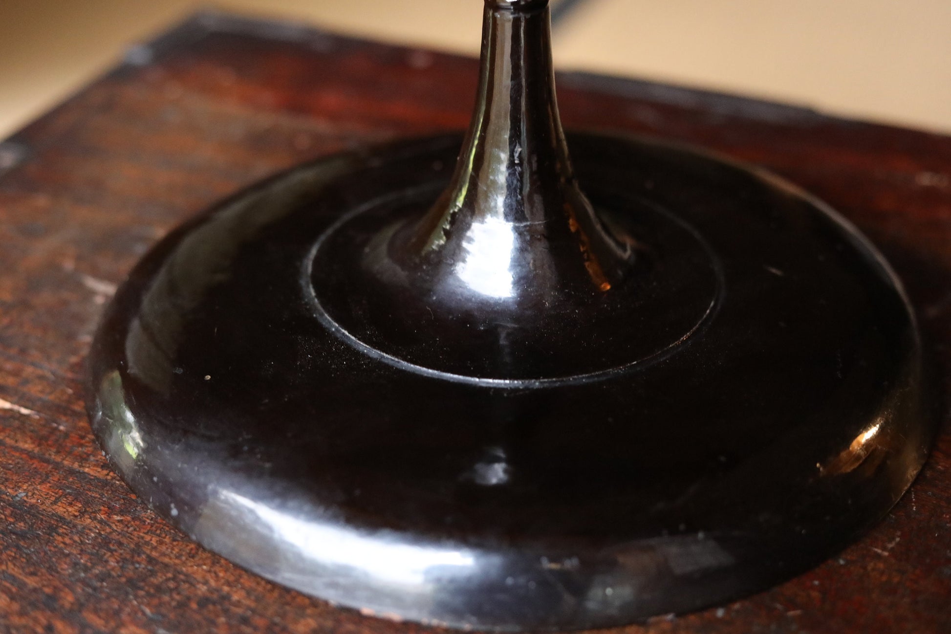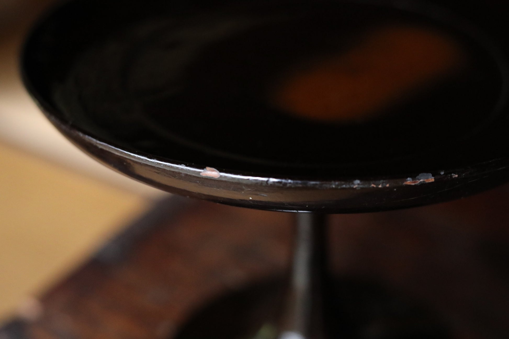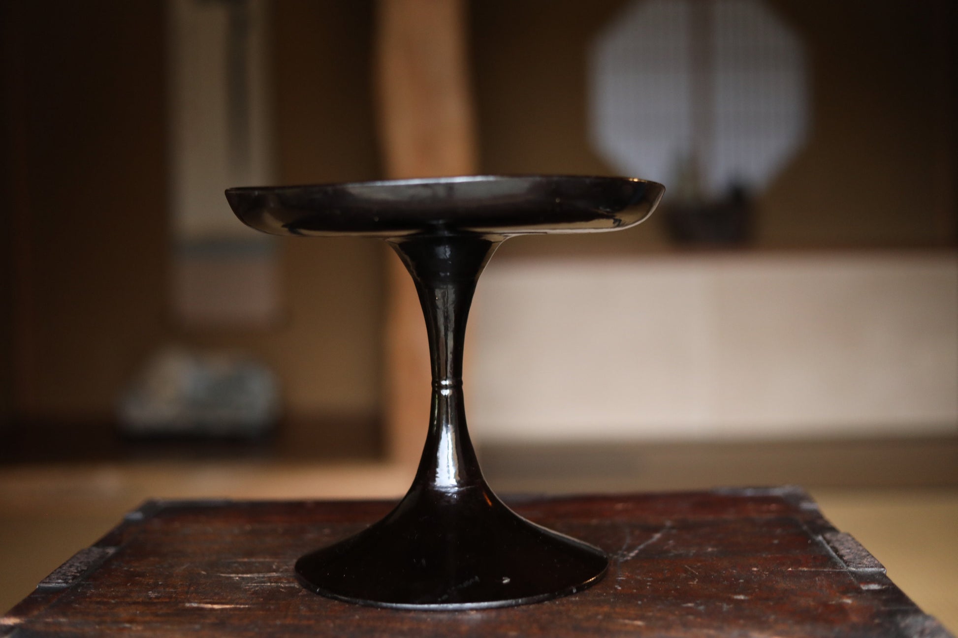 Japanese vintage Furniture wooden black lacquer round fruit cake stand pedestal, URUSHI craft Japanese tableware 1920s H9.1×10in/H23×15.5cm