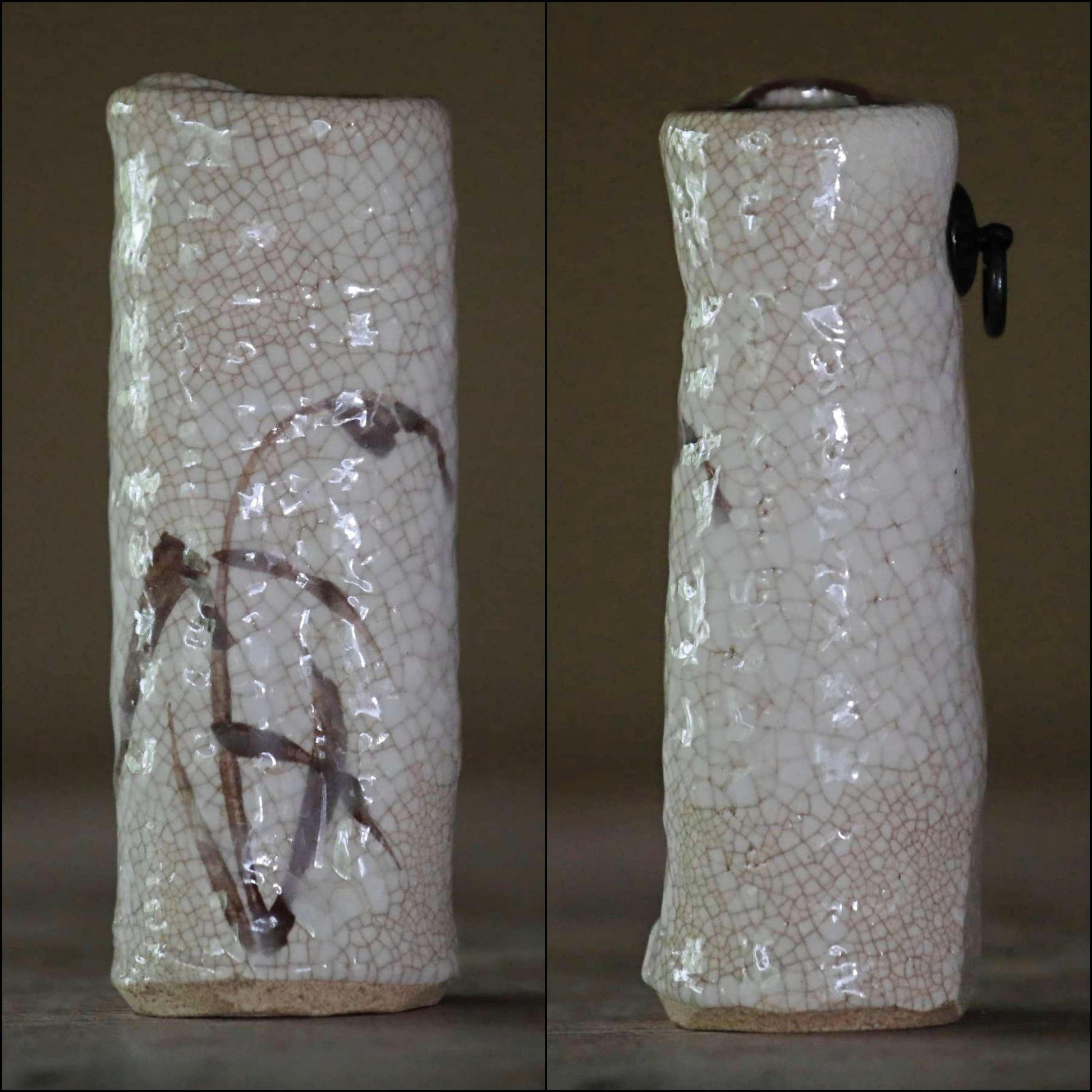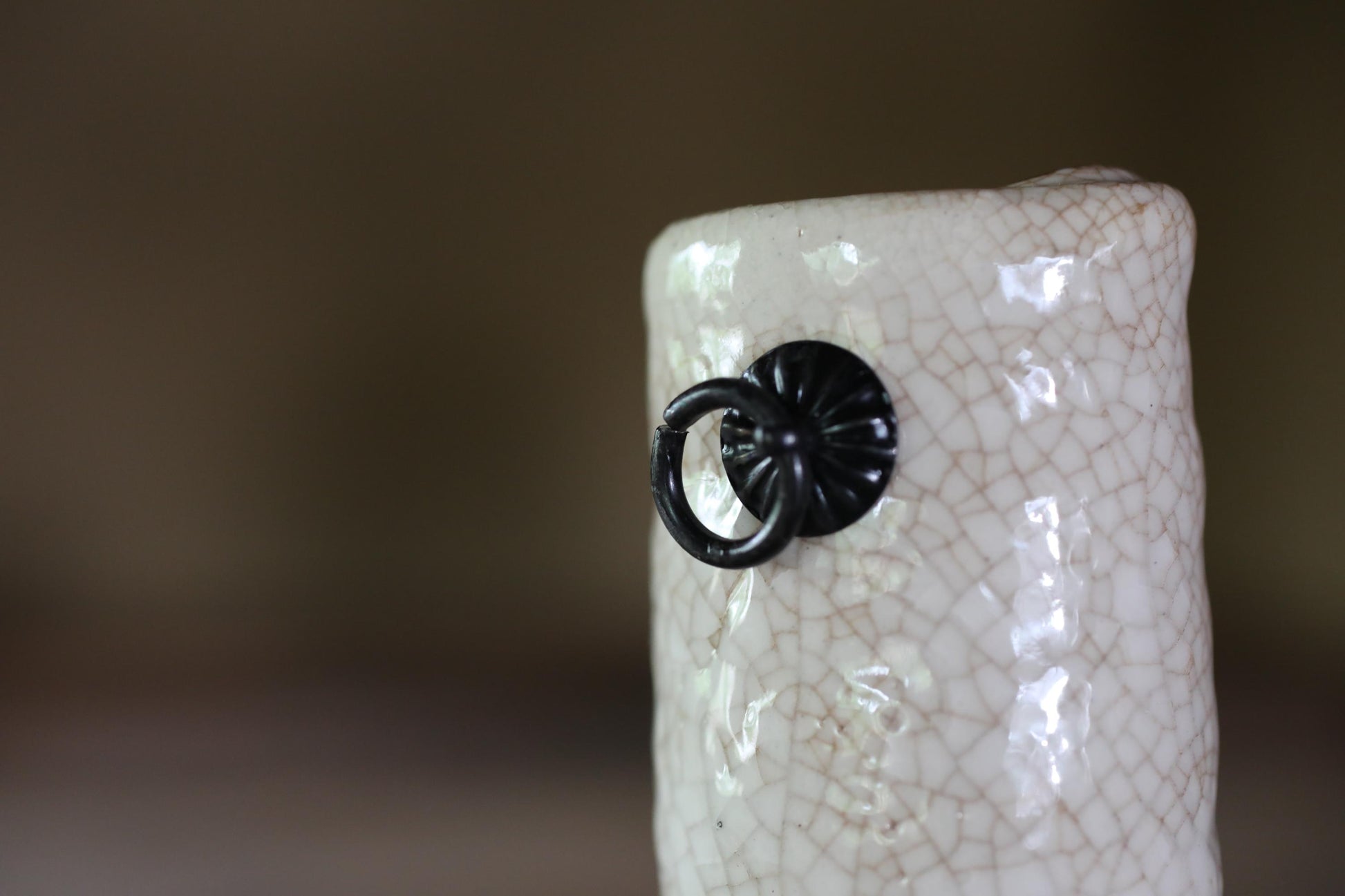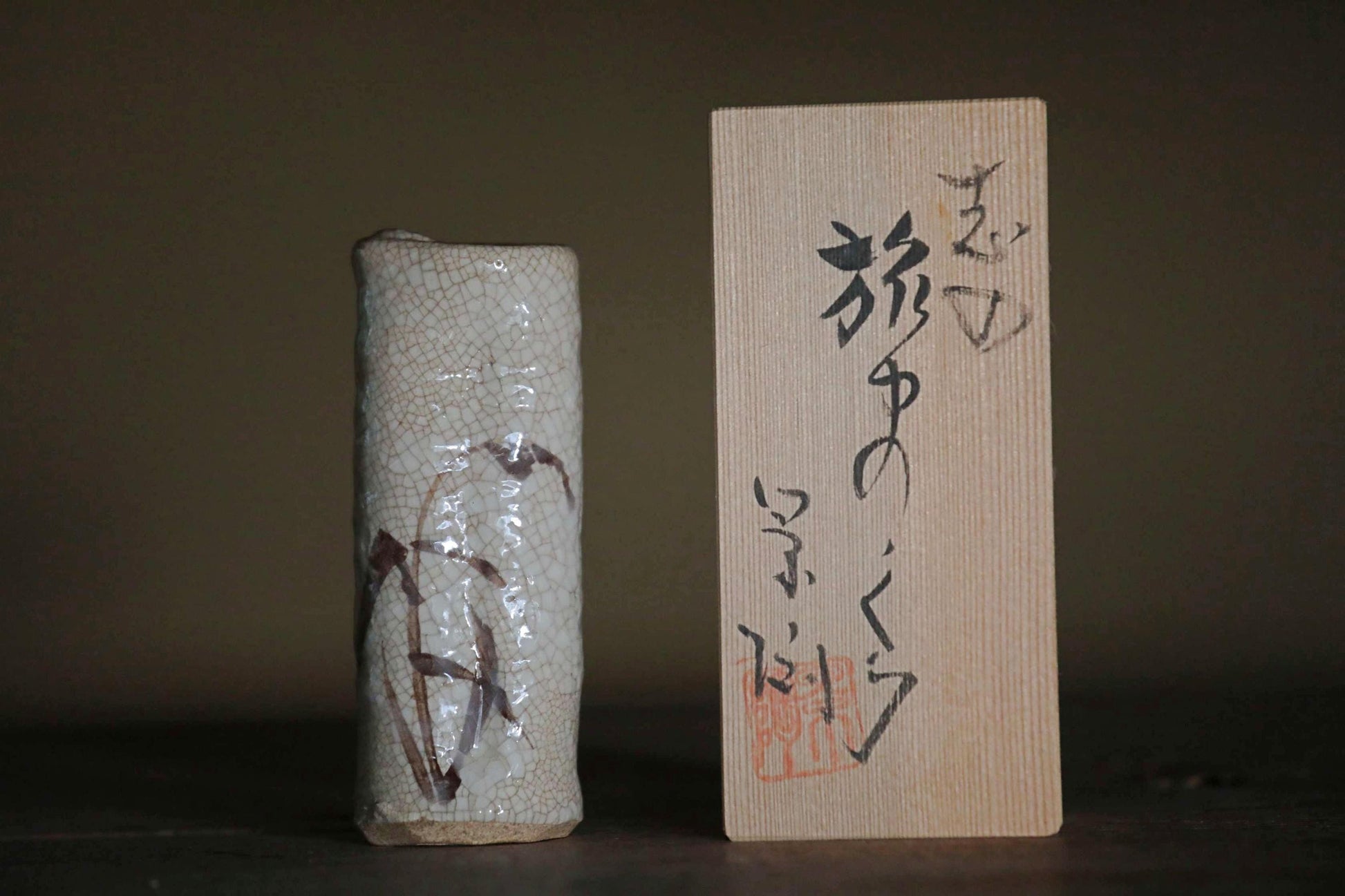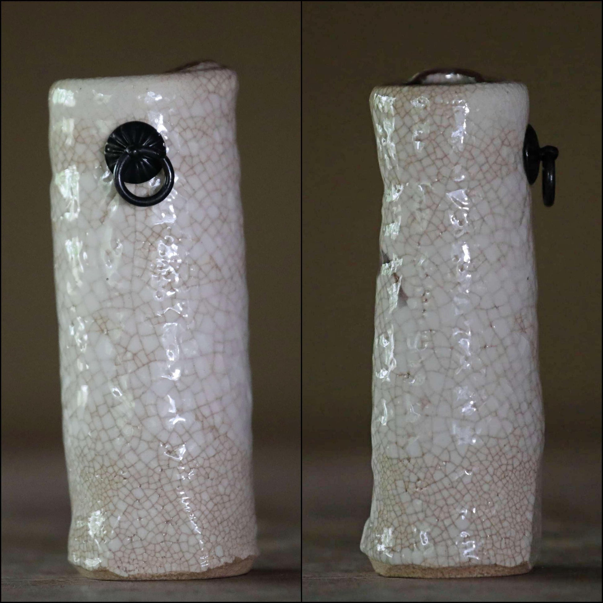 Japanese vintage hand made ceramic small jar flower vase Shino ware hanging vase name "Travel Pillow” with wood box H5.1in/H13cm