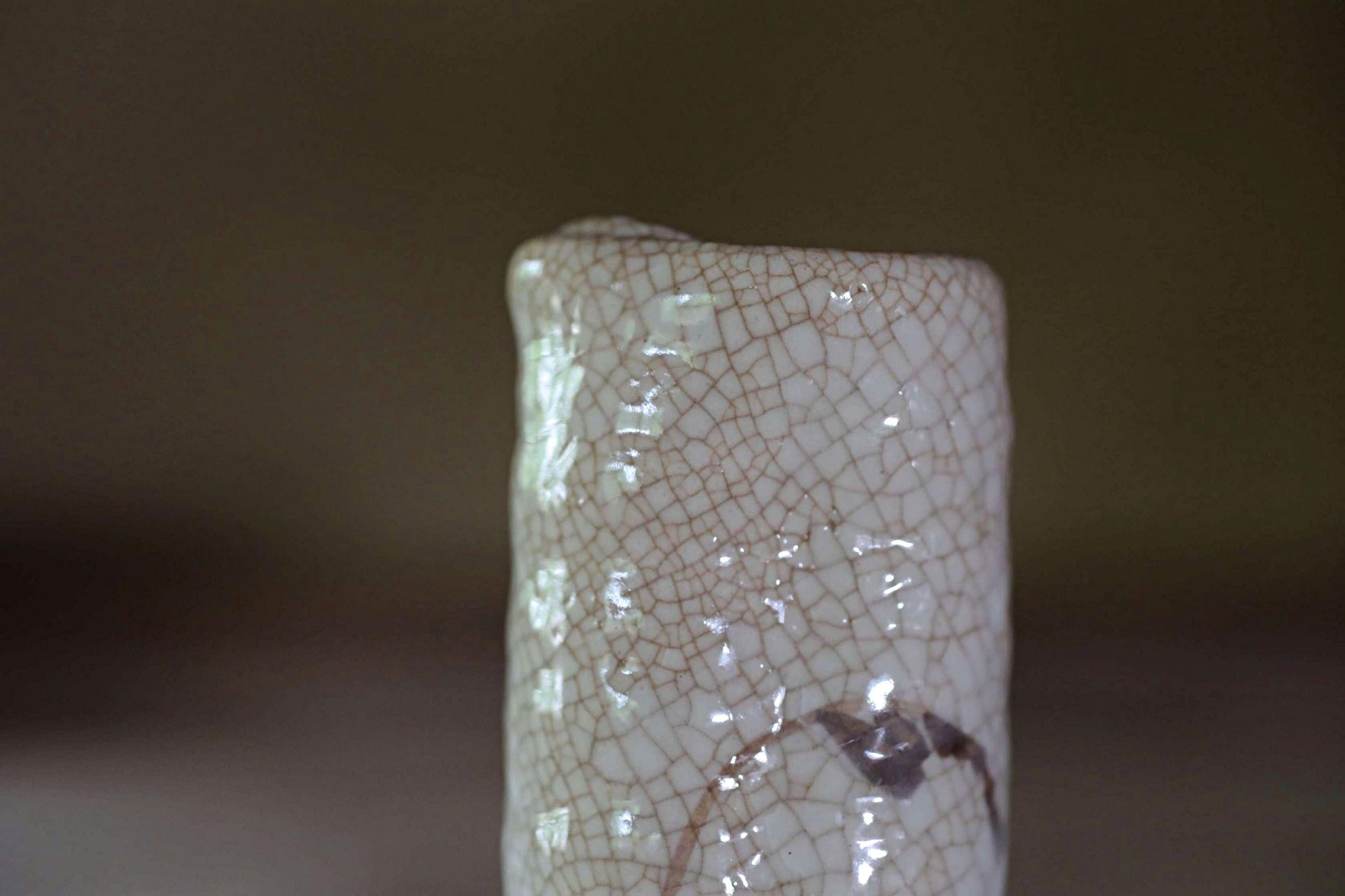 The white background is decorated with flower-like designs, and the glaze has natural cracks called “貫入 Kannyu”