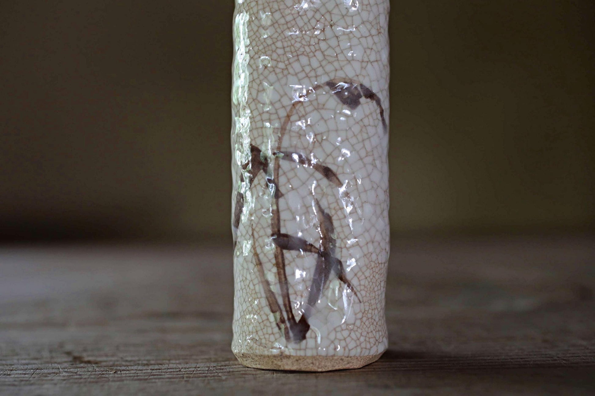 Japanese vintage hand made ceramic small jar flower vase Shino ware hanging vase Kanji signed with wood box H5.1in/H13cm.
