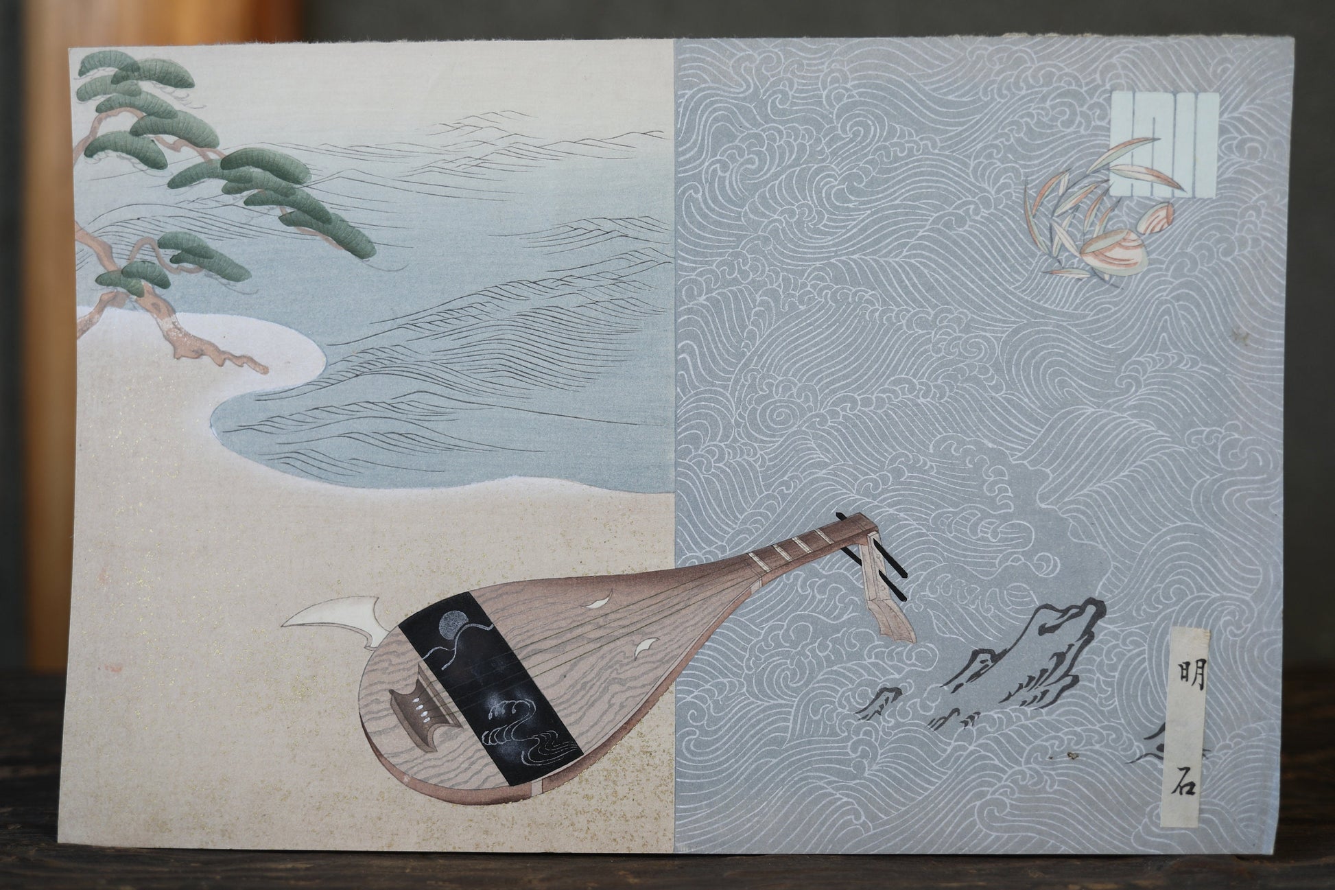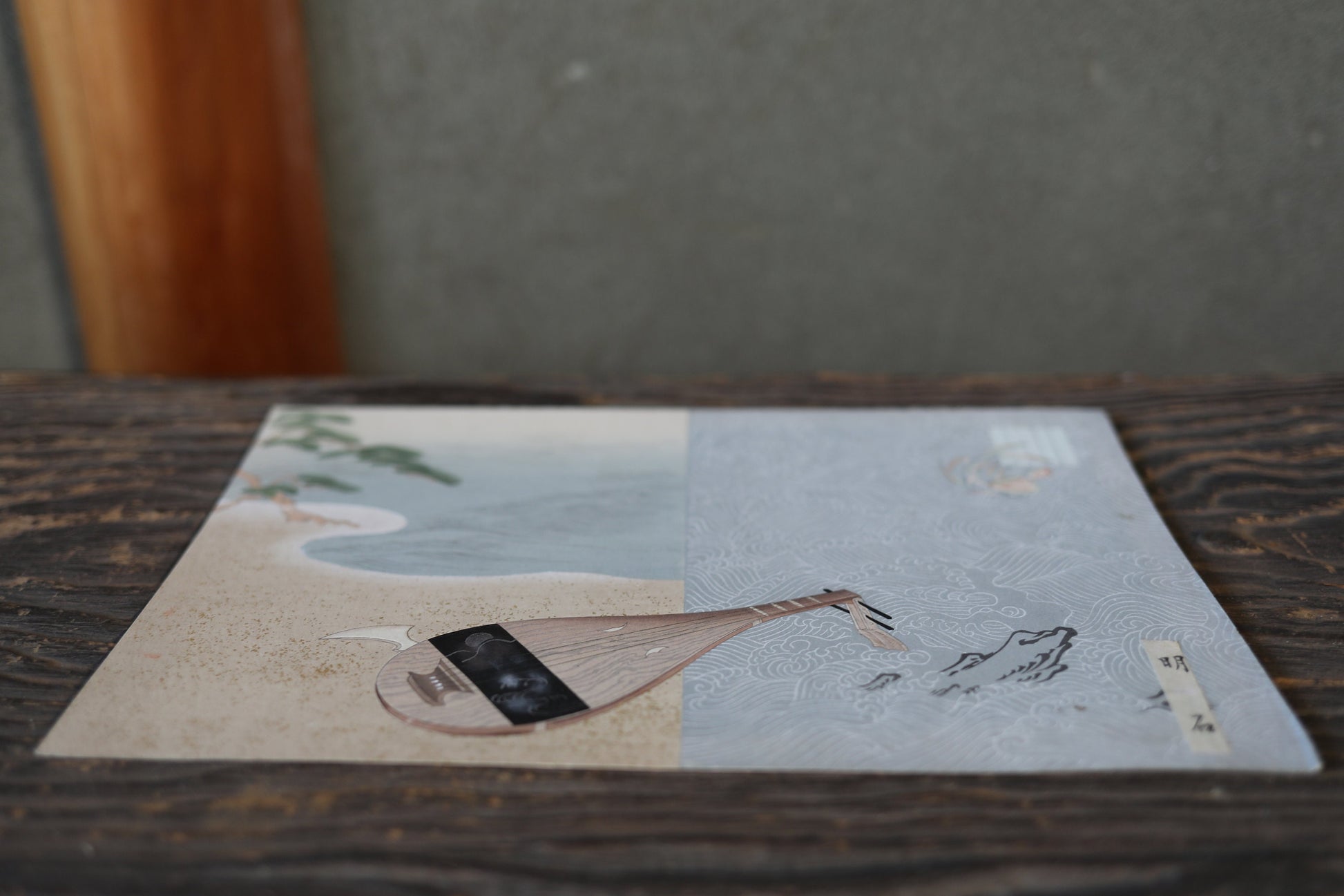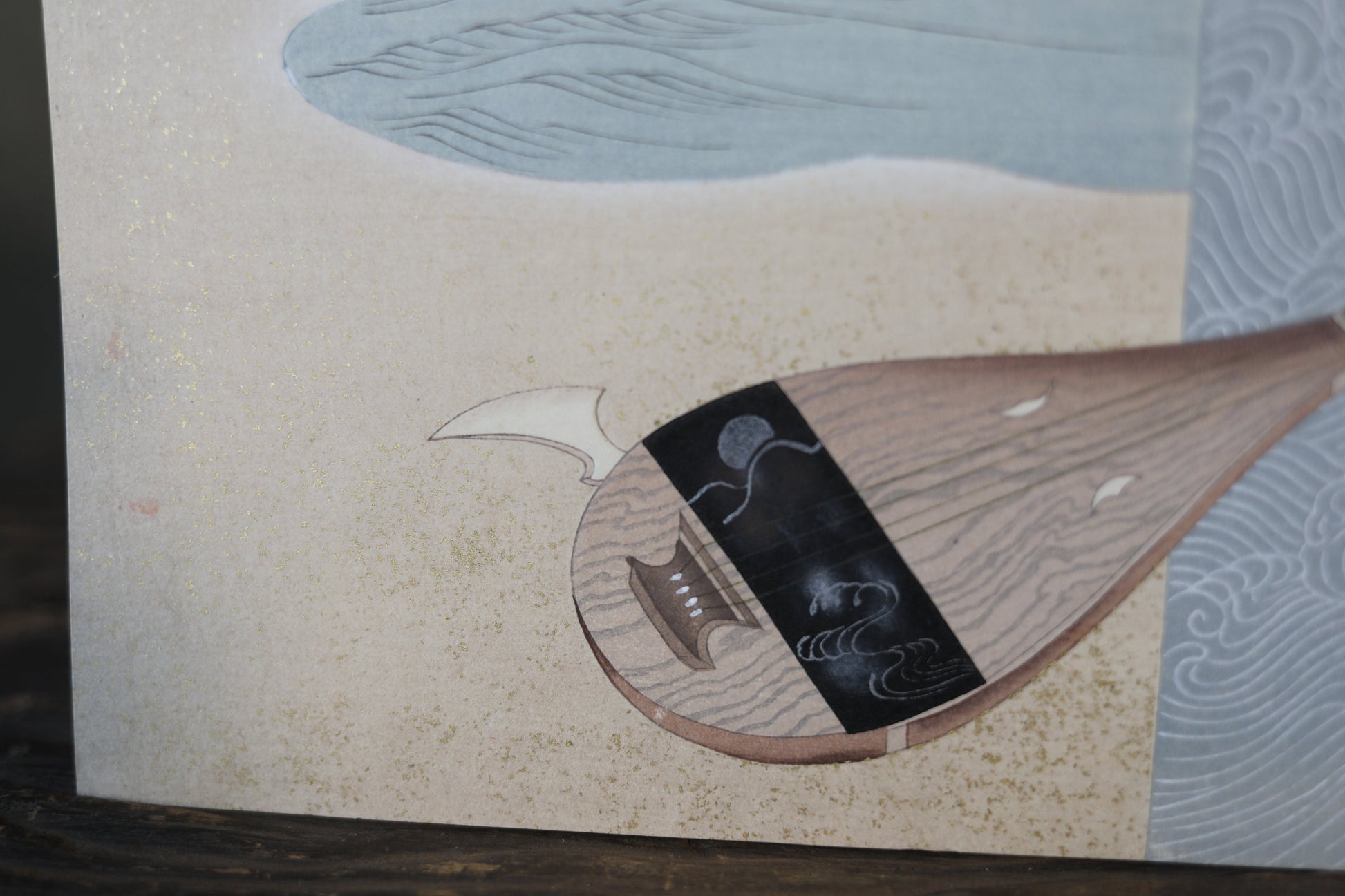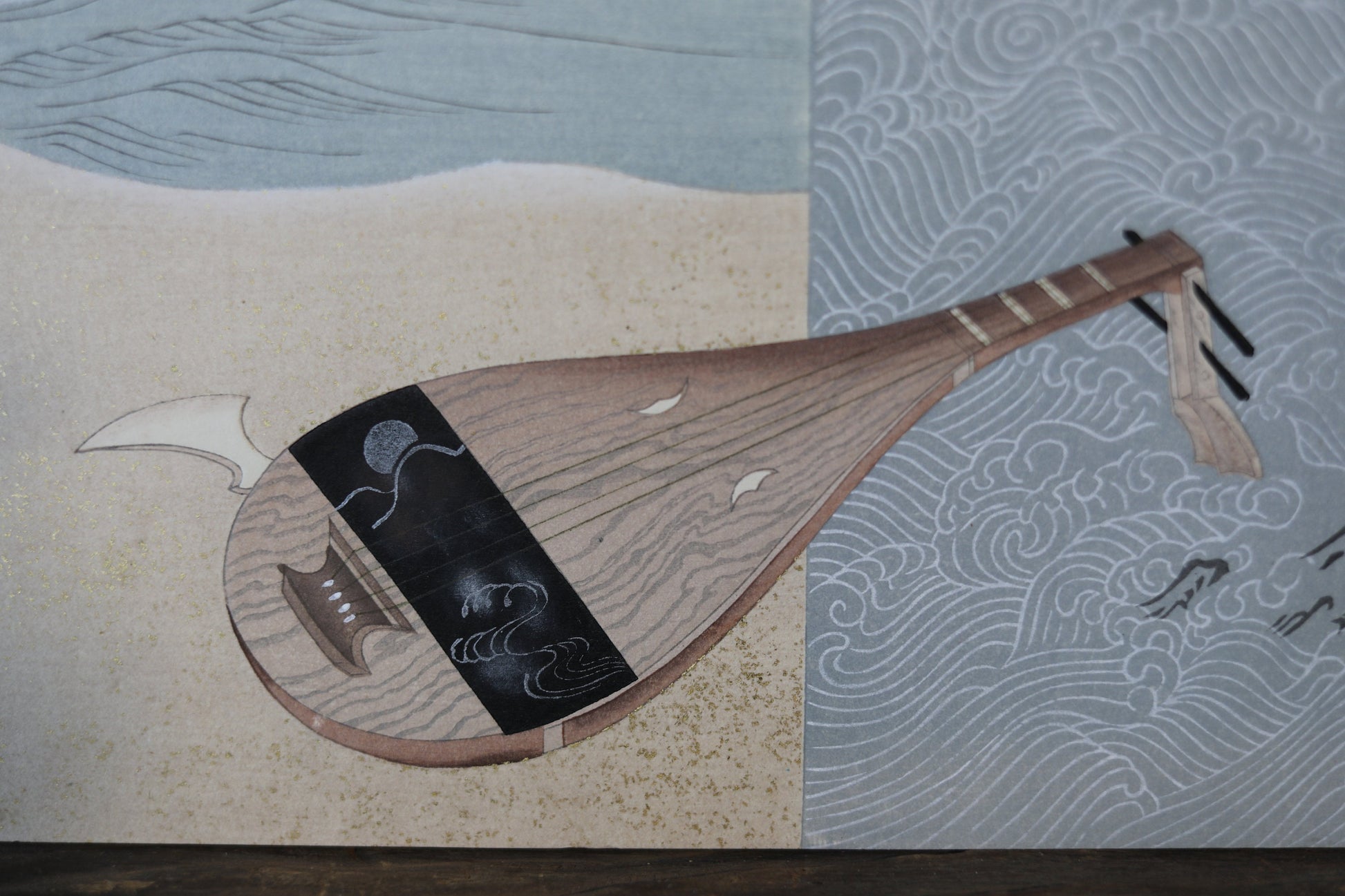 The overall coloring is somewhat sad and melancholy. Depicted in the center is a stringed instrument called a biwa. Waves are beautifully depicted in the background.