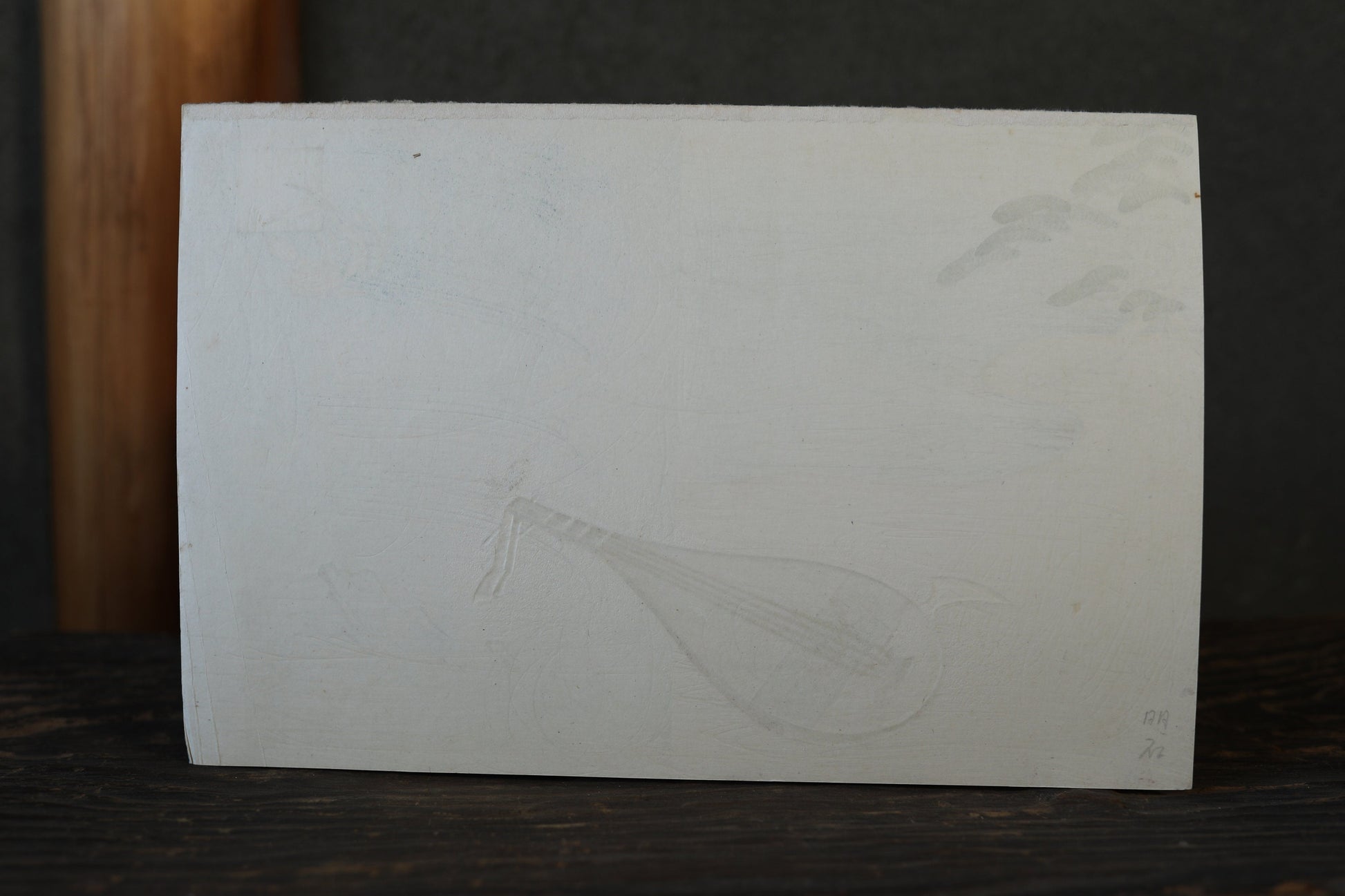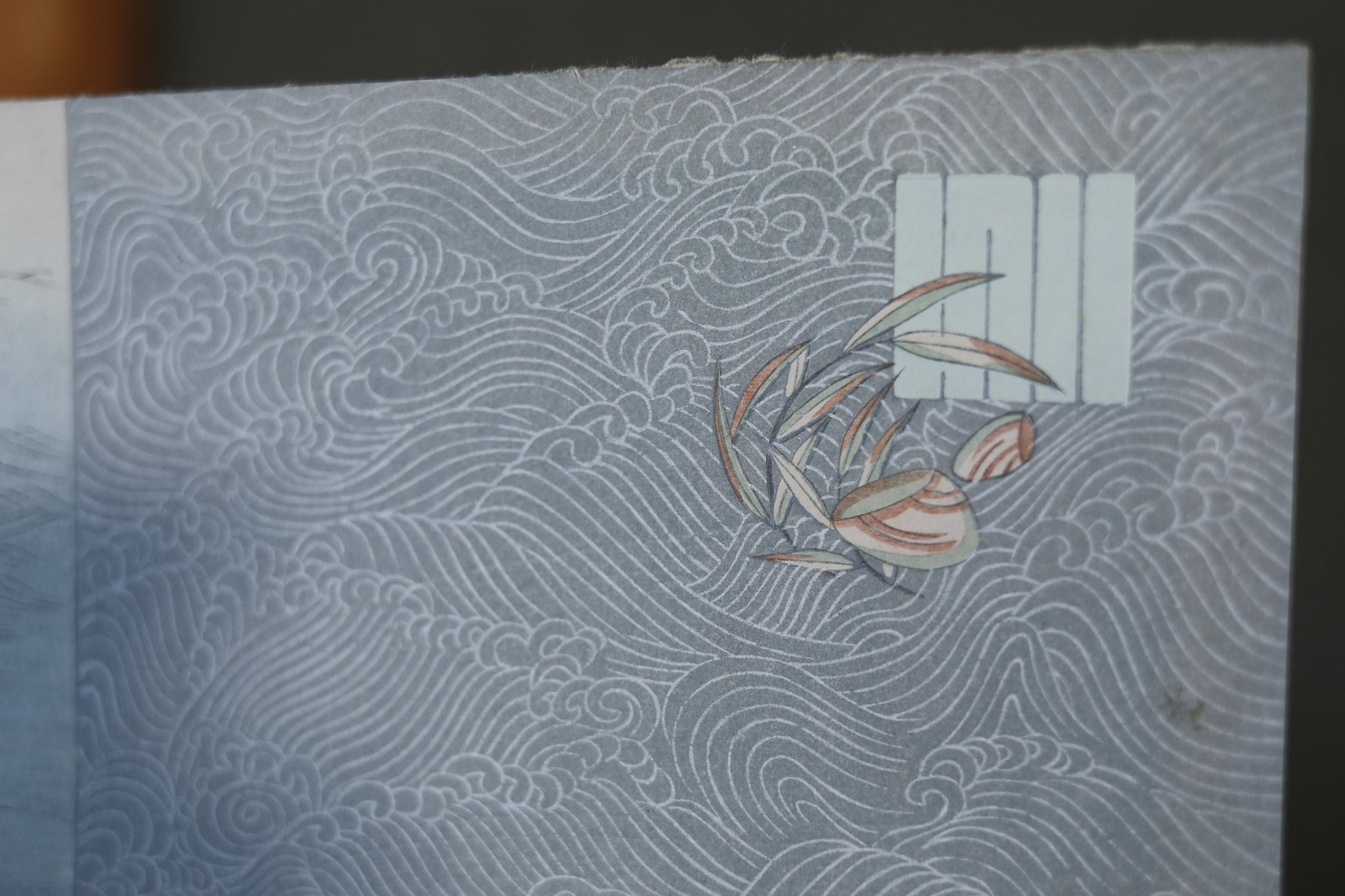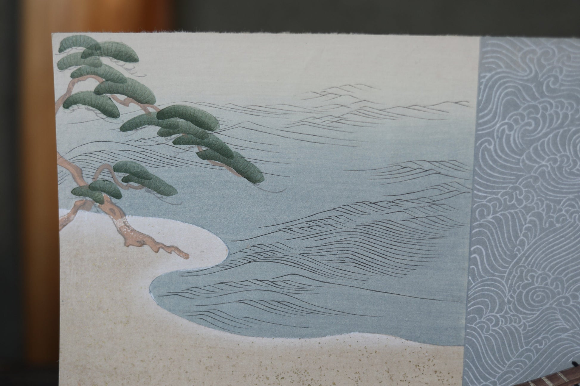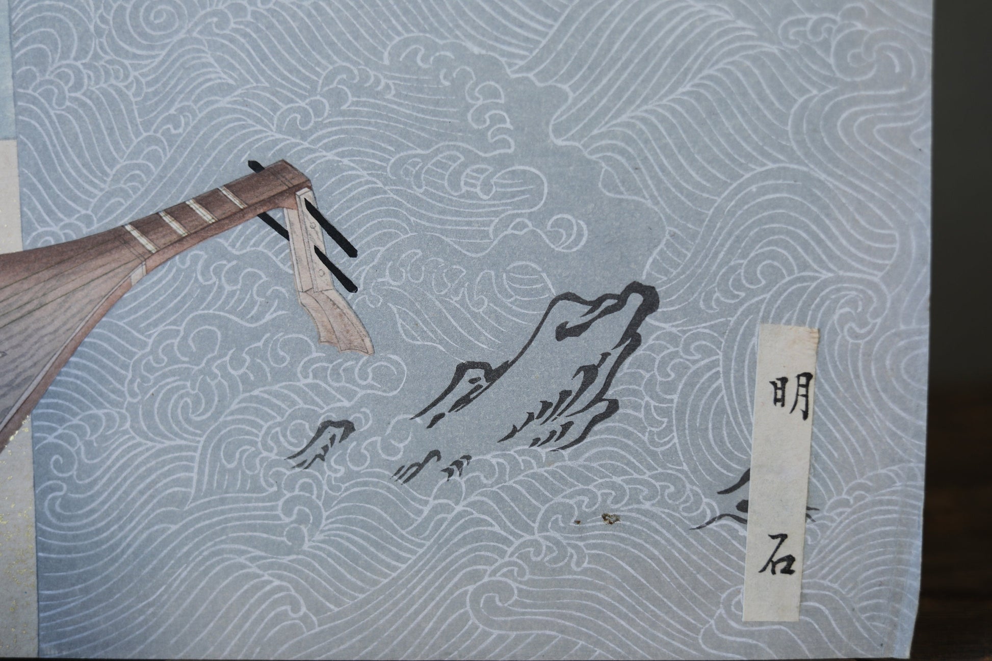 Japanese vintage hand paint and block printing art of Tale of Genji/Akashi town with Kanji Japanese lute waves H8.1×W12.2in/H20.5×W31cm
