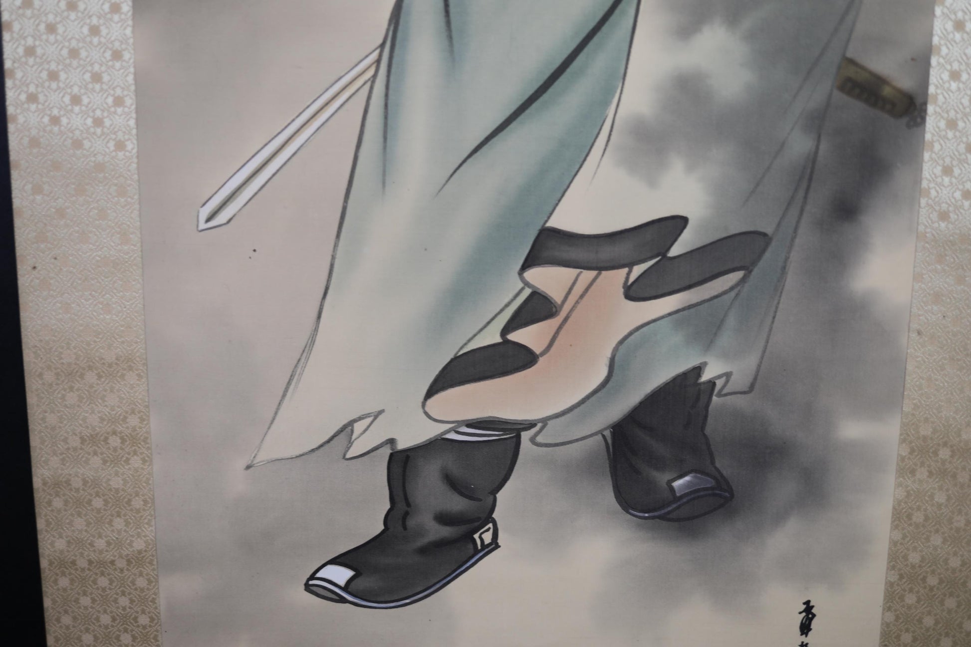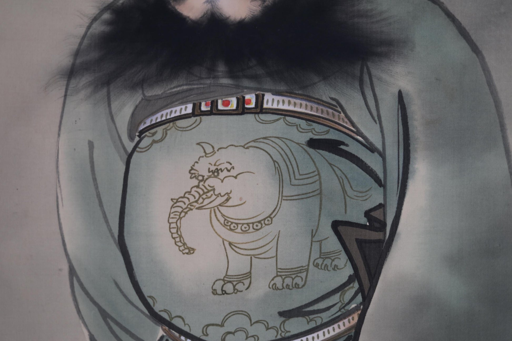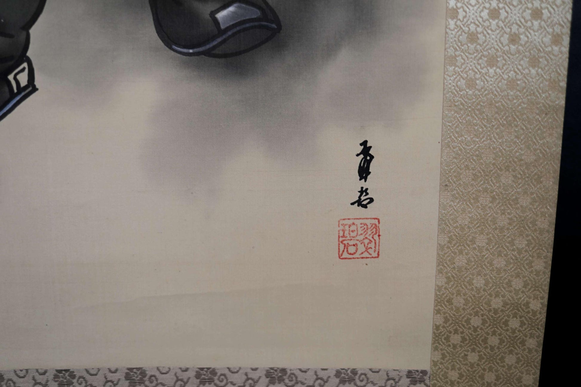 Japanese vintage hanging scroll of brush painting Chinese God, devil and tiger 鍾馗Zhong Kui H81.5x21.3in / 207x54cm
