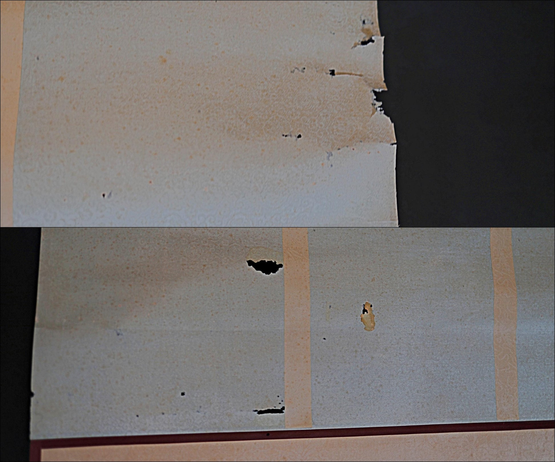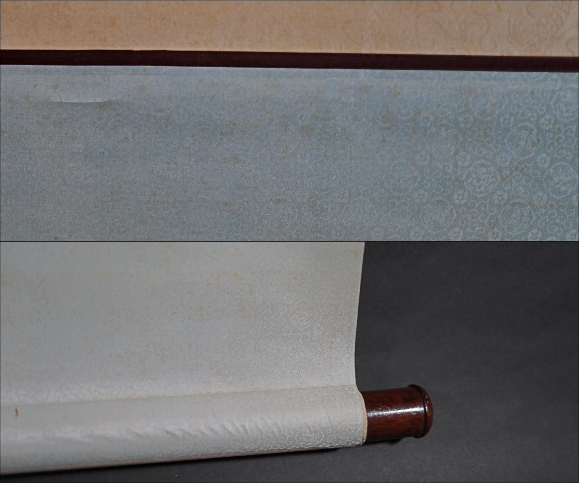 Printed on a paper and decorated with silk clothes and scroll end made of wood. There are tears and holes as shown in pictures
