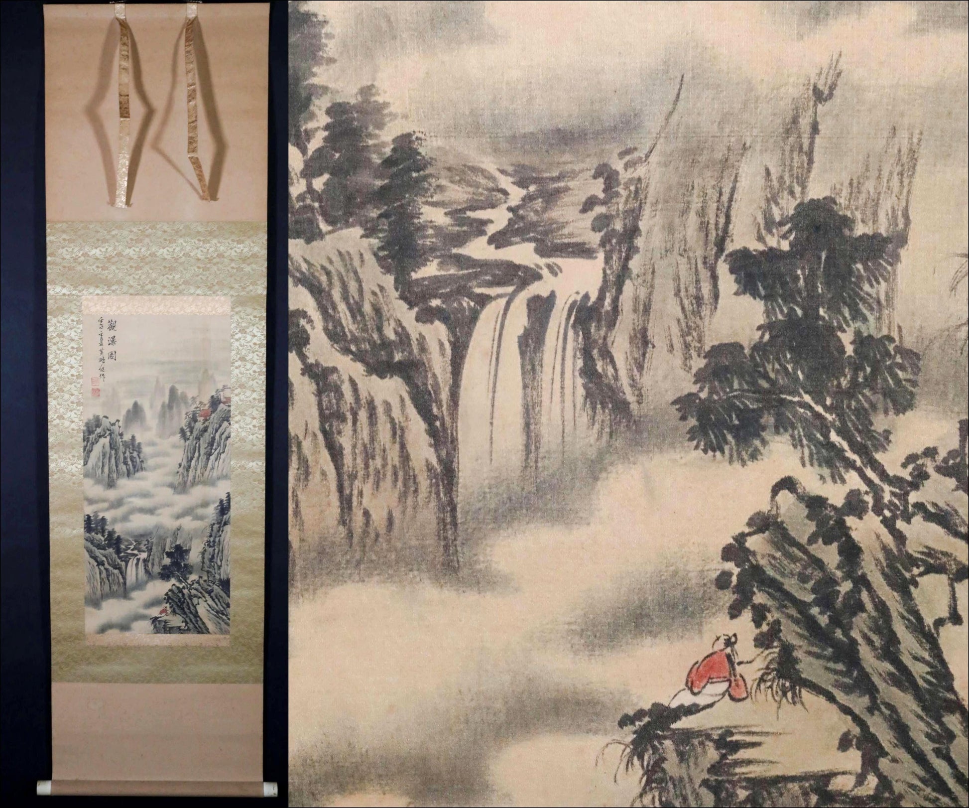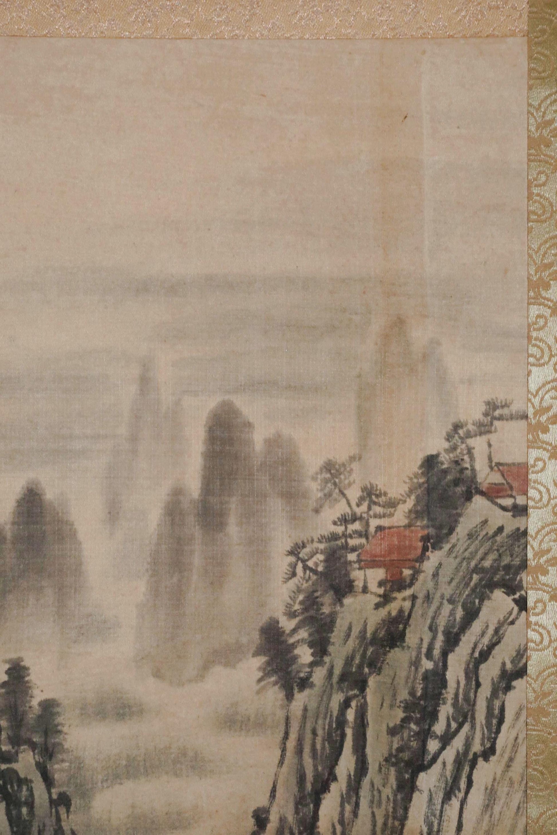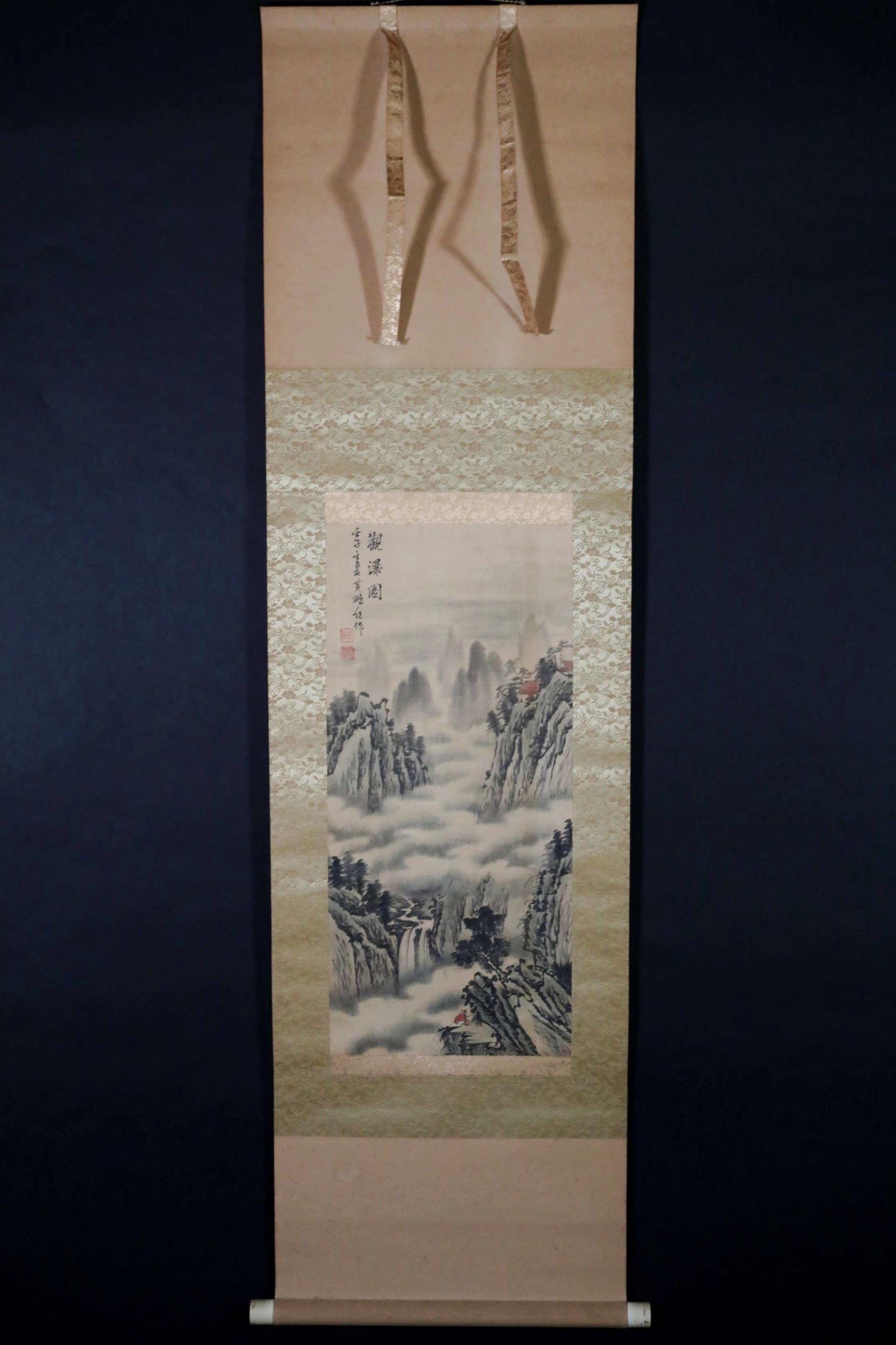 Japanese vintage India-ink painting scroll fine Landscape Mountain View Clouds, Waterfalls and Hermits Kanji sign KAKEJIKU H56.3in/H143cm