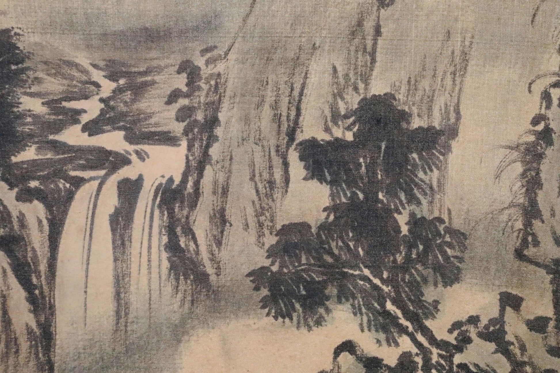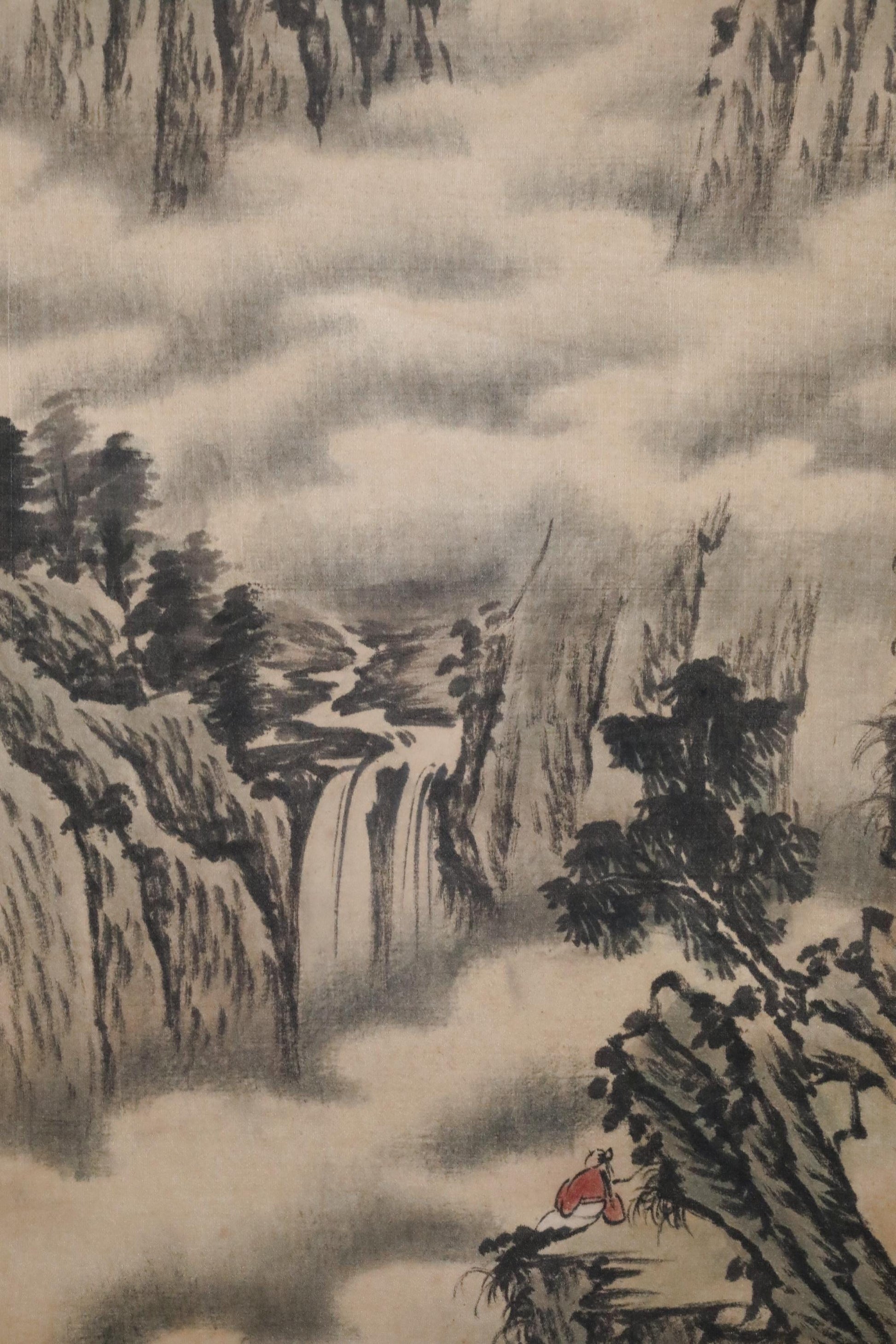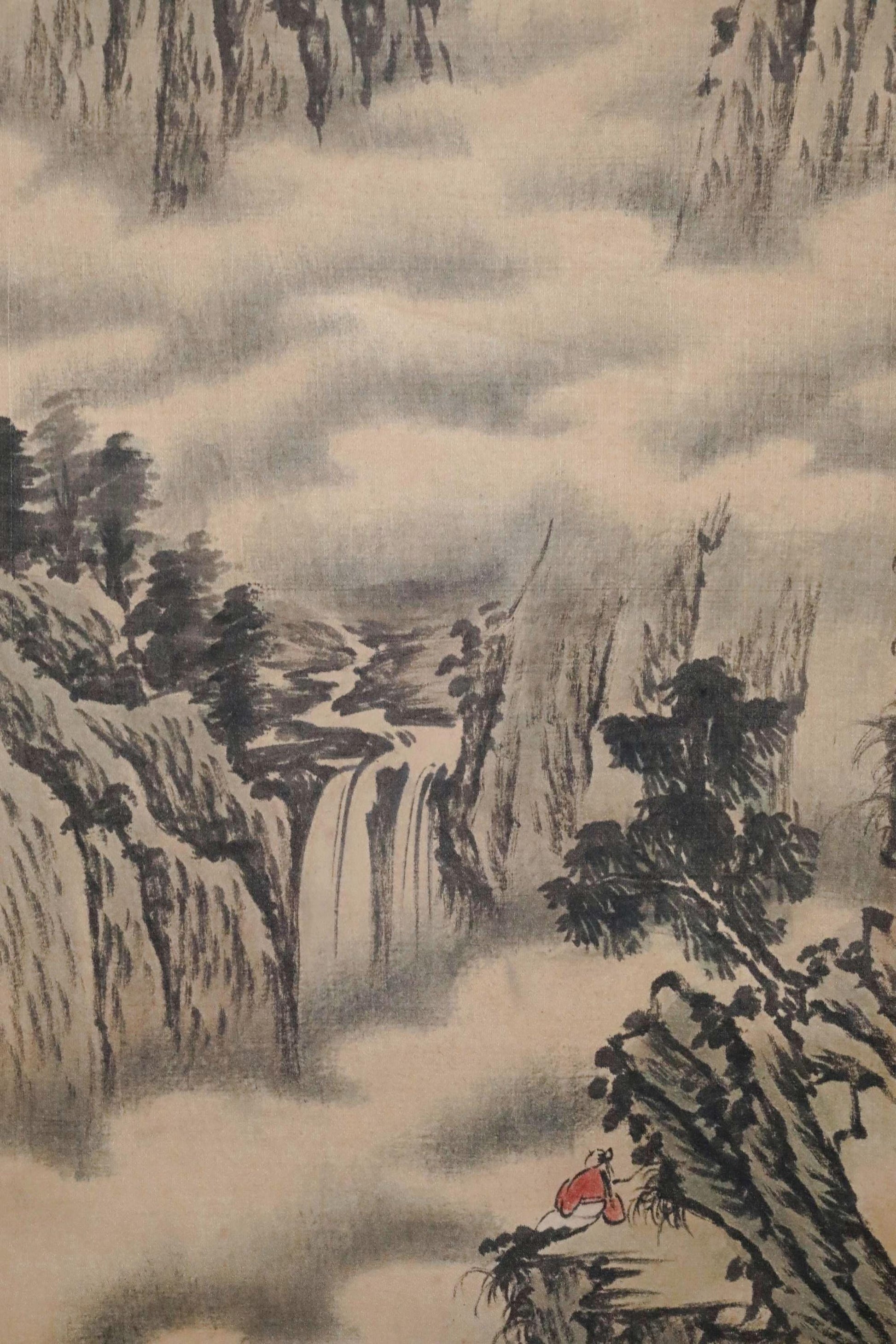 Japanese vintage India-ink painting scroll fine Landscape Mountain View Clouds, Waterfalls and Hermits Kanji sign KAKEJIKU H56.3in/H143cm