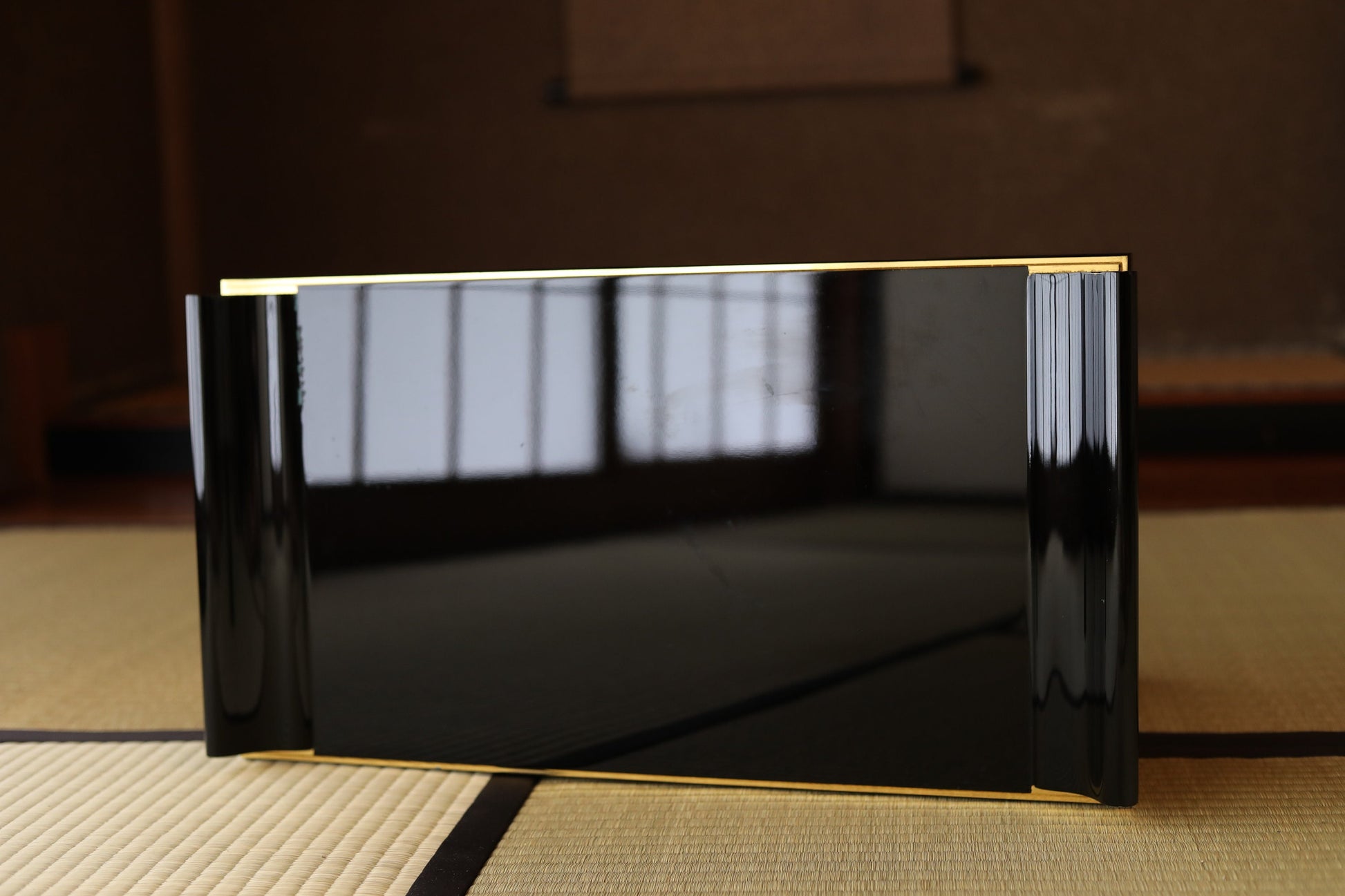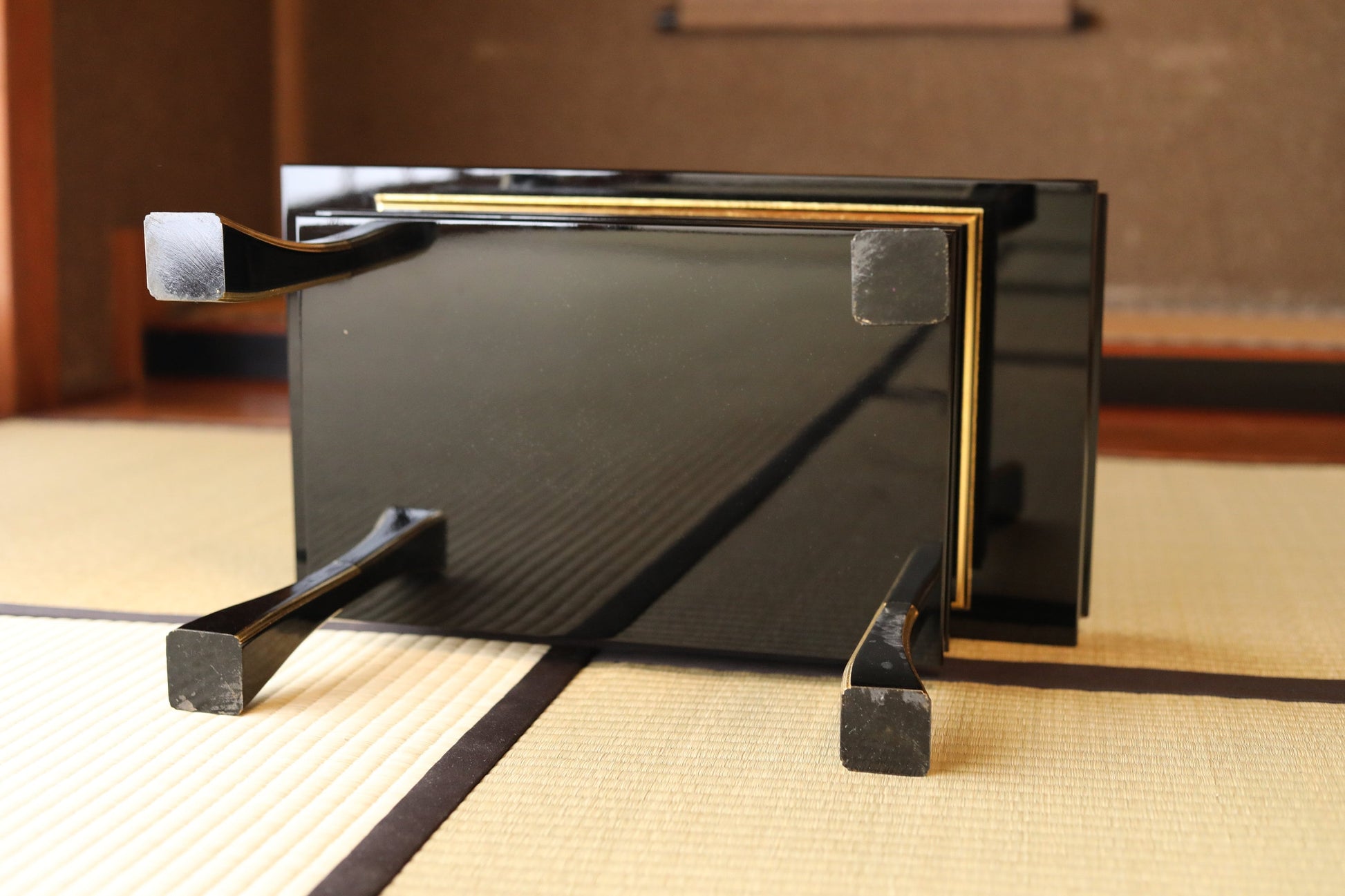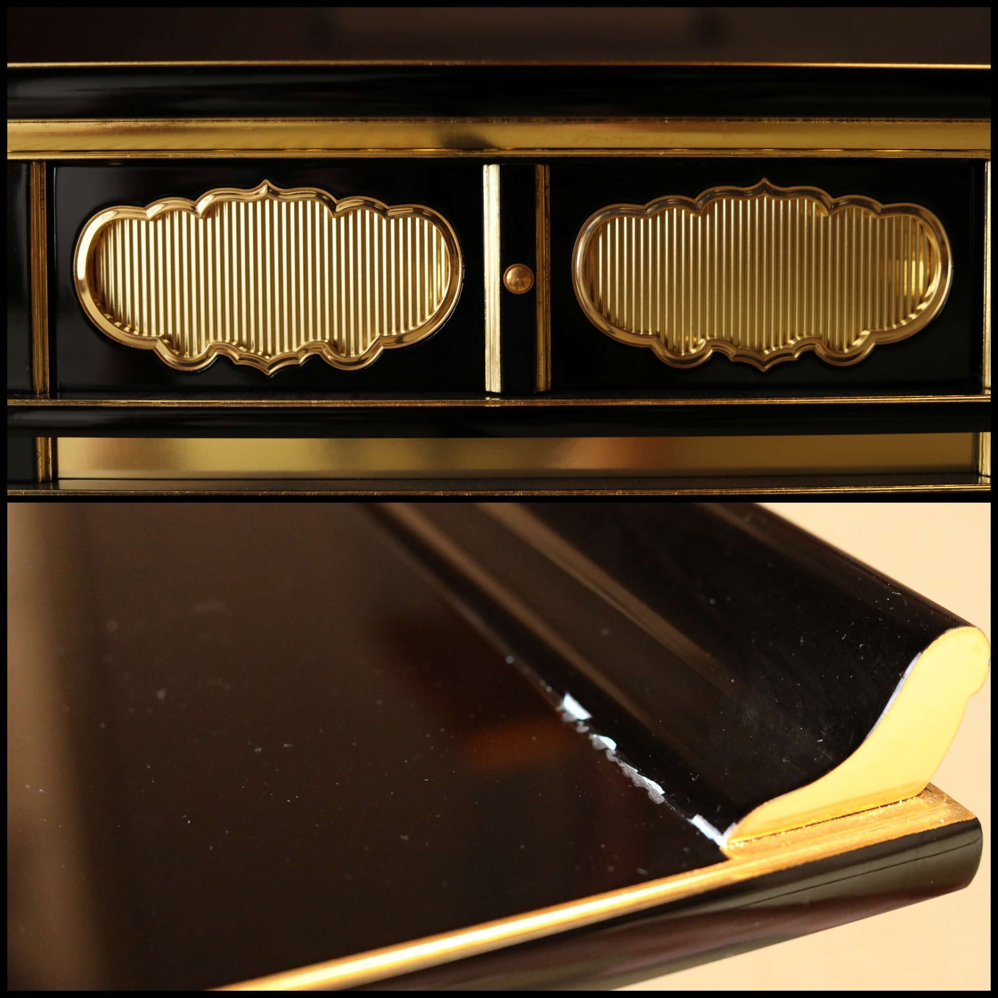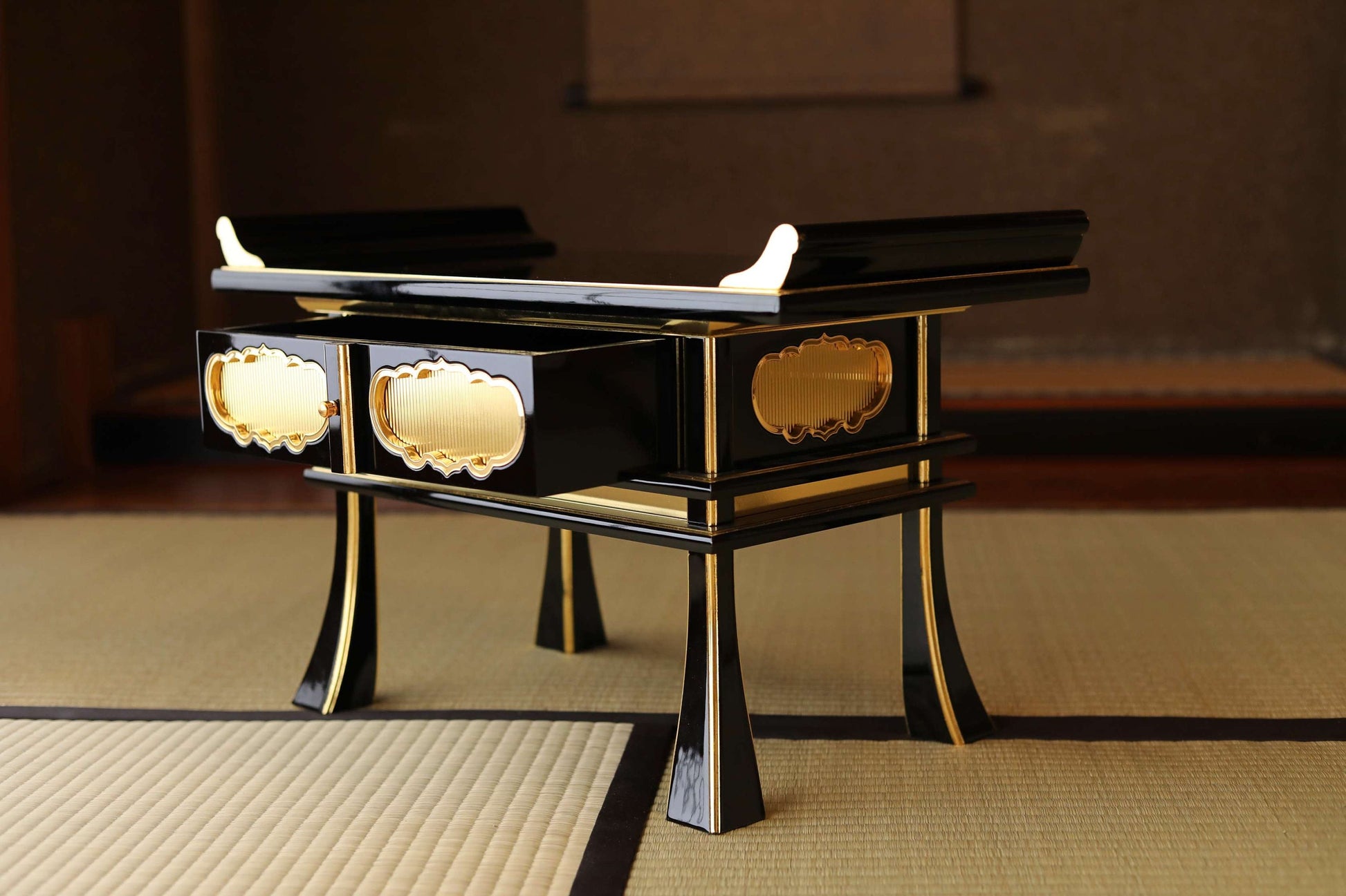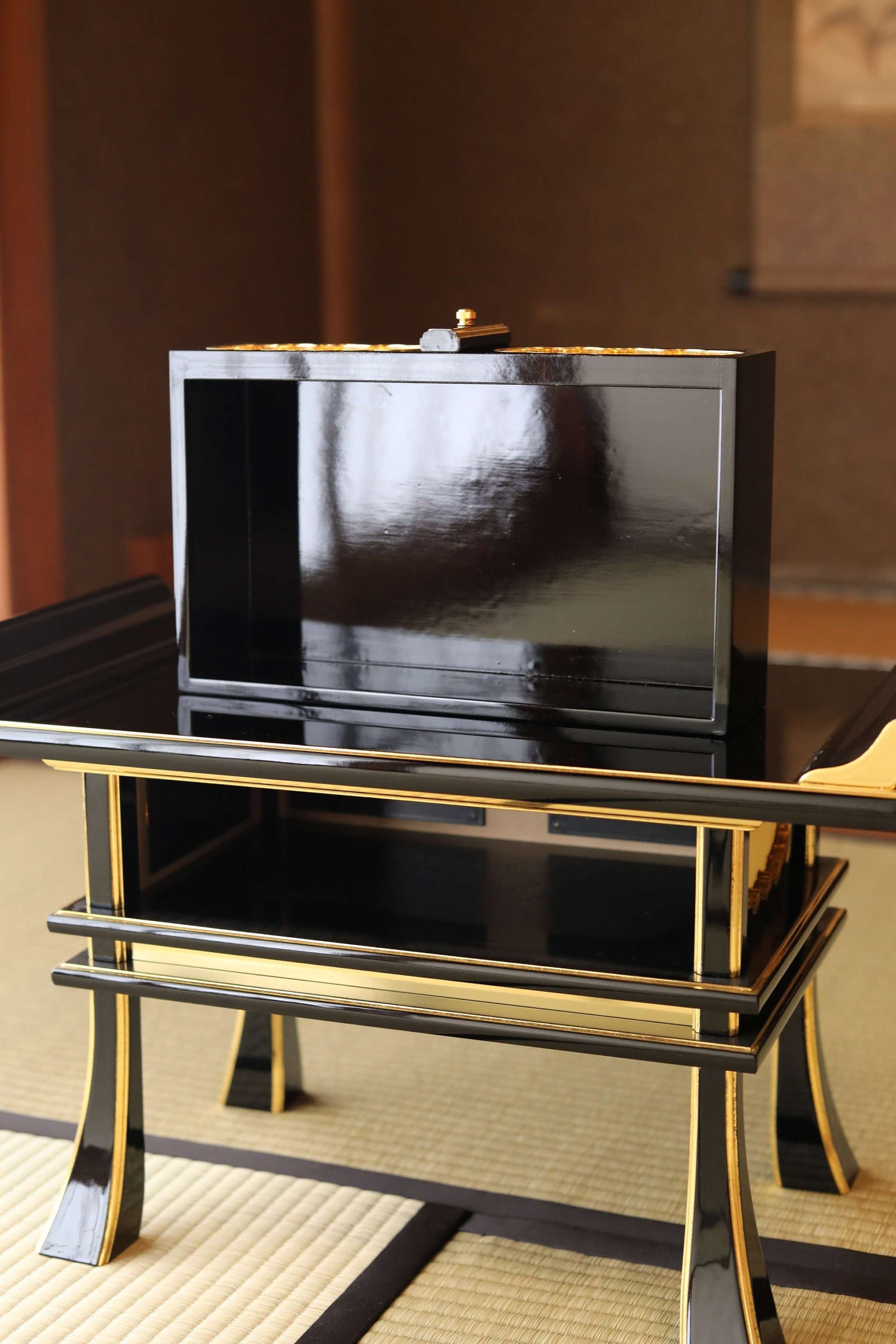 This desk is made of black lacquer, wood and gold.