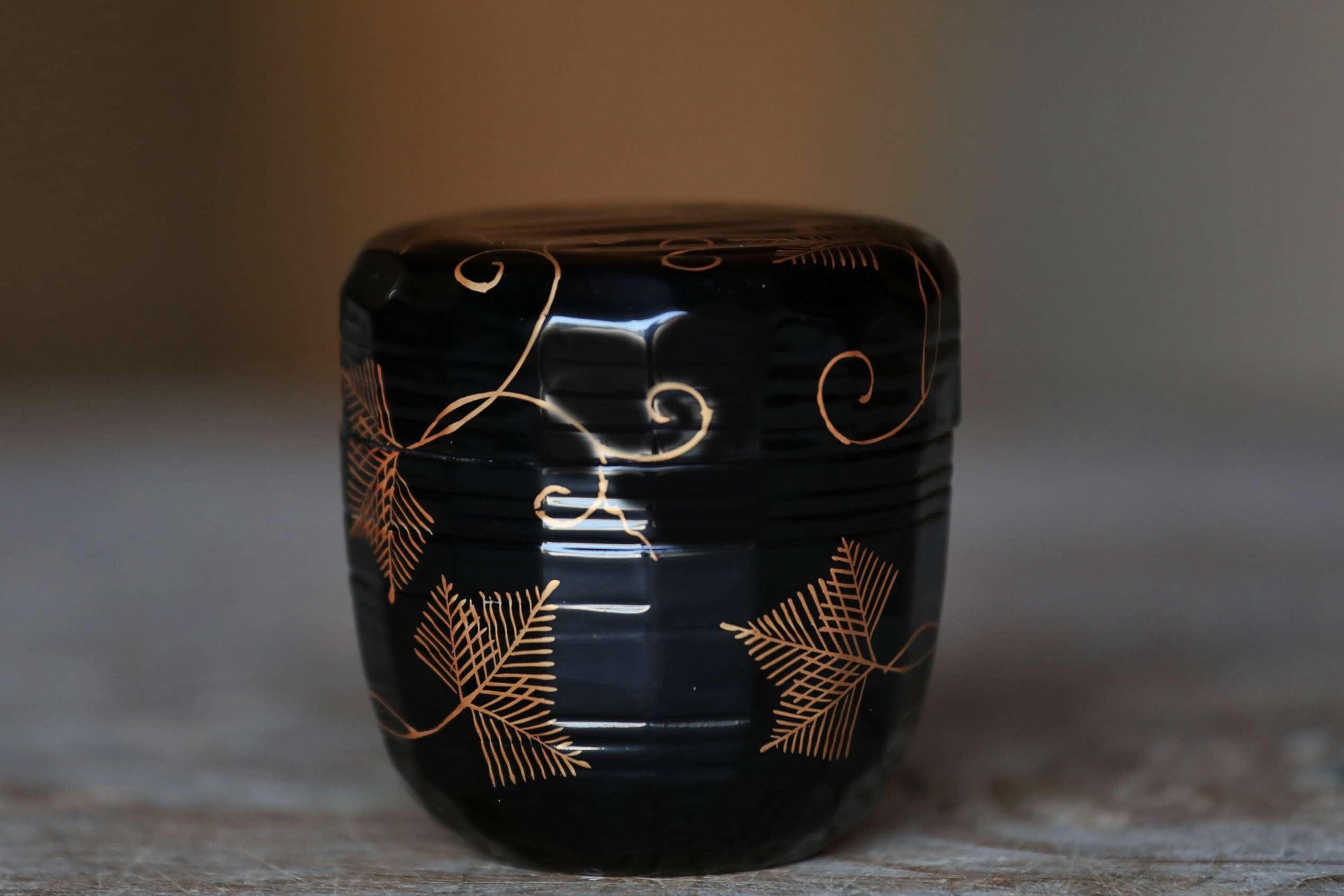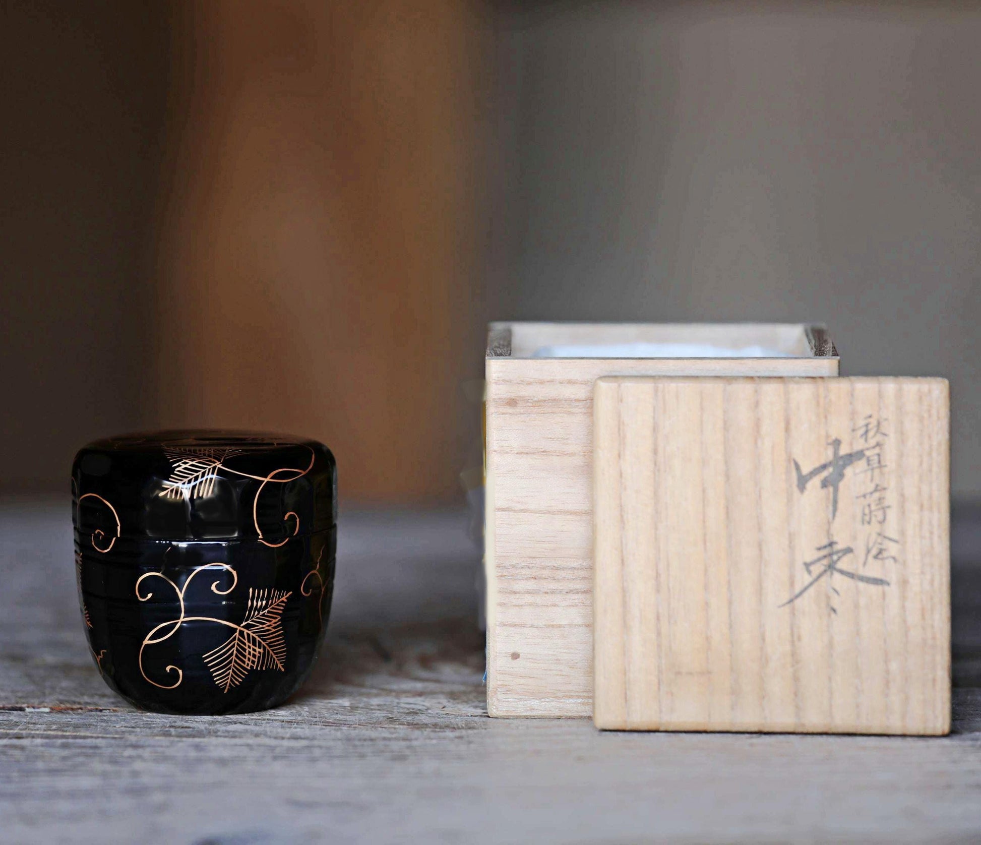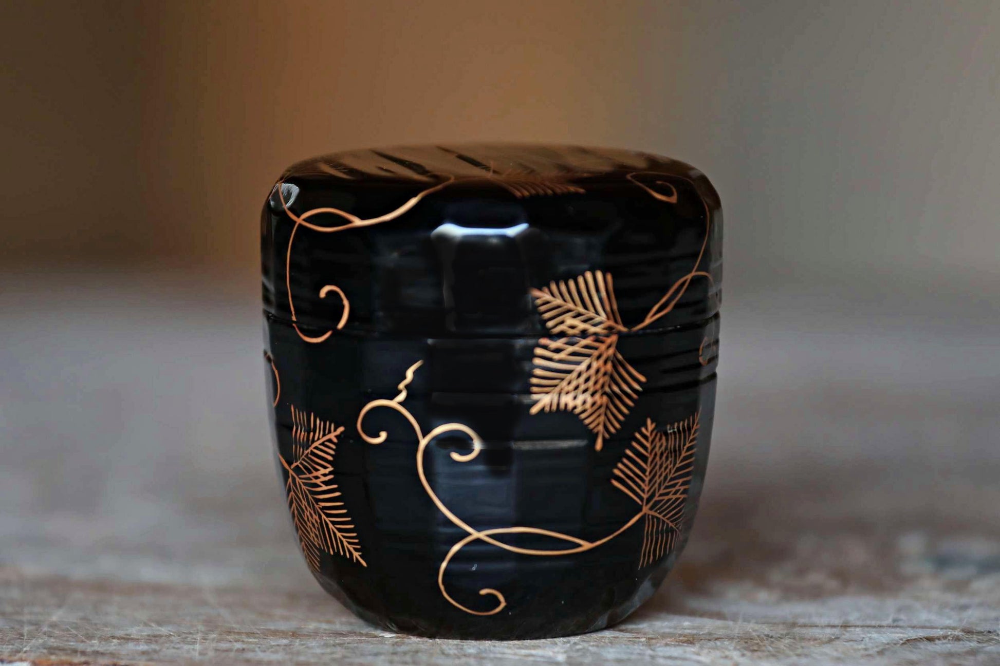 Japanese vintage "matcha" green tea caddy with golden Autumn flowers Wajima Makie, "棗 natsume", for tea ceremony H2.8in/H7cm