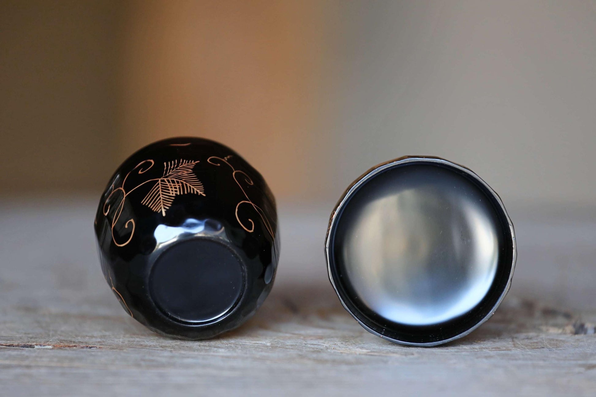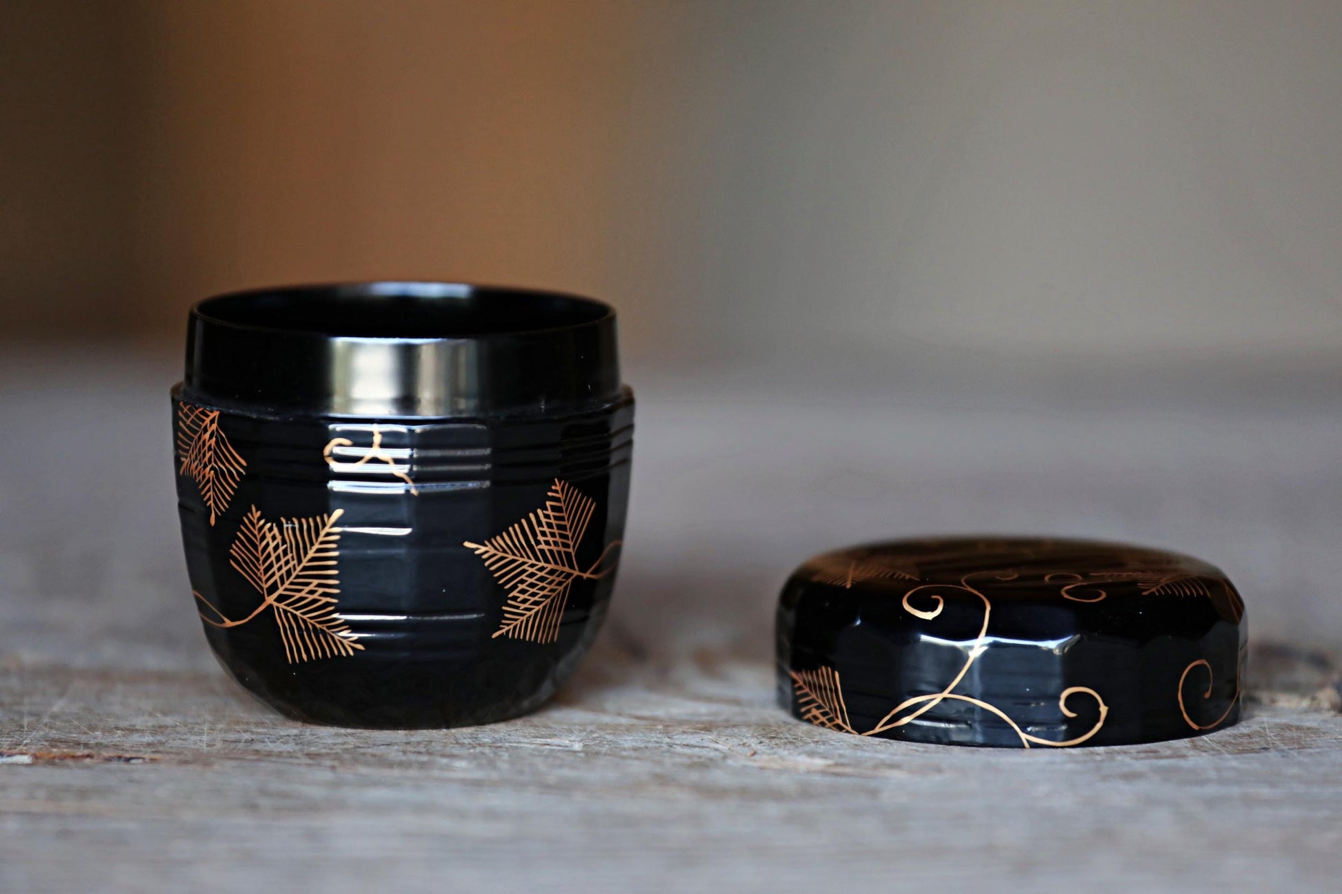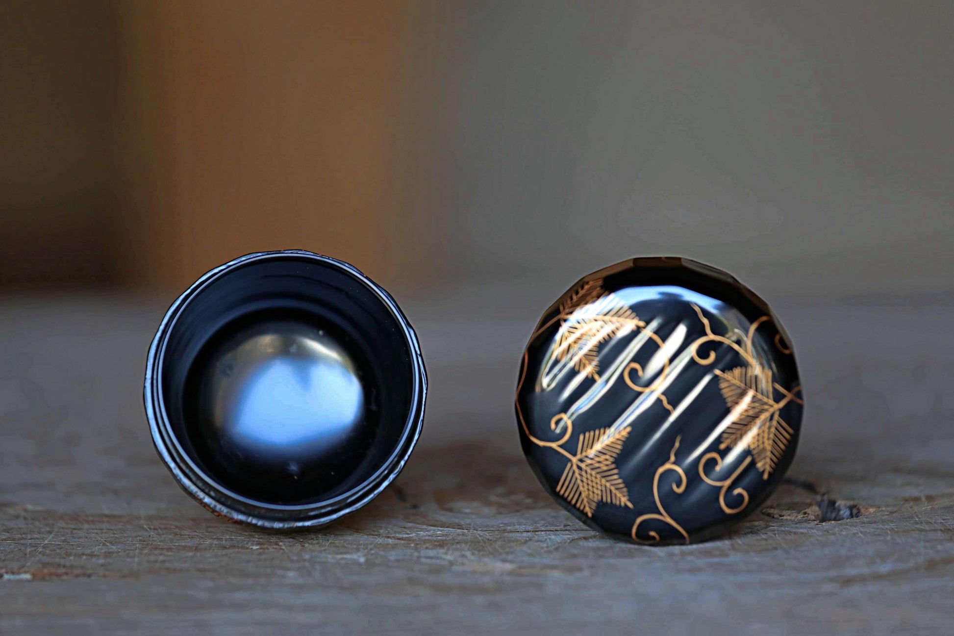 Japanese vintage "matcha" green tea caddy with golden Autumn flowers Wajima Makie, "棗 natsume", for tea ceremony H2.8in/H7cm