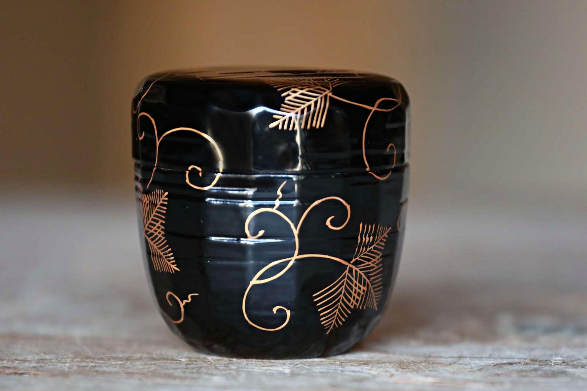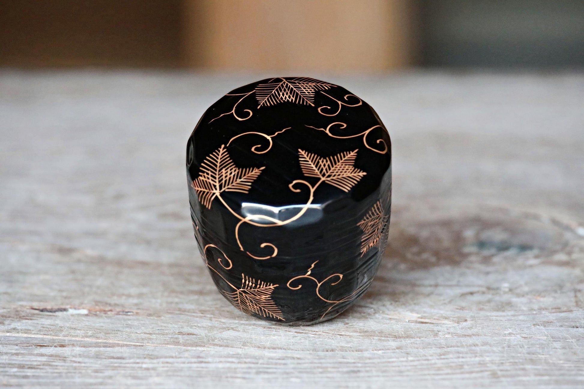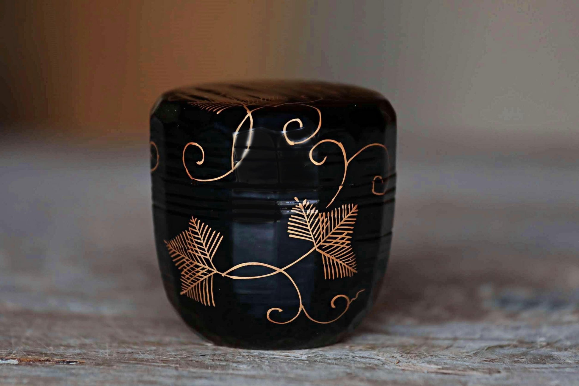 FINE! Japanese vintage "matcha" green tea caddy with golden Autumn flowers Wajima Makie, "棗 natsume", for tea ceremony H2.8in/H7cm.