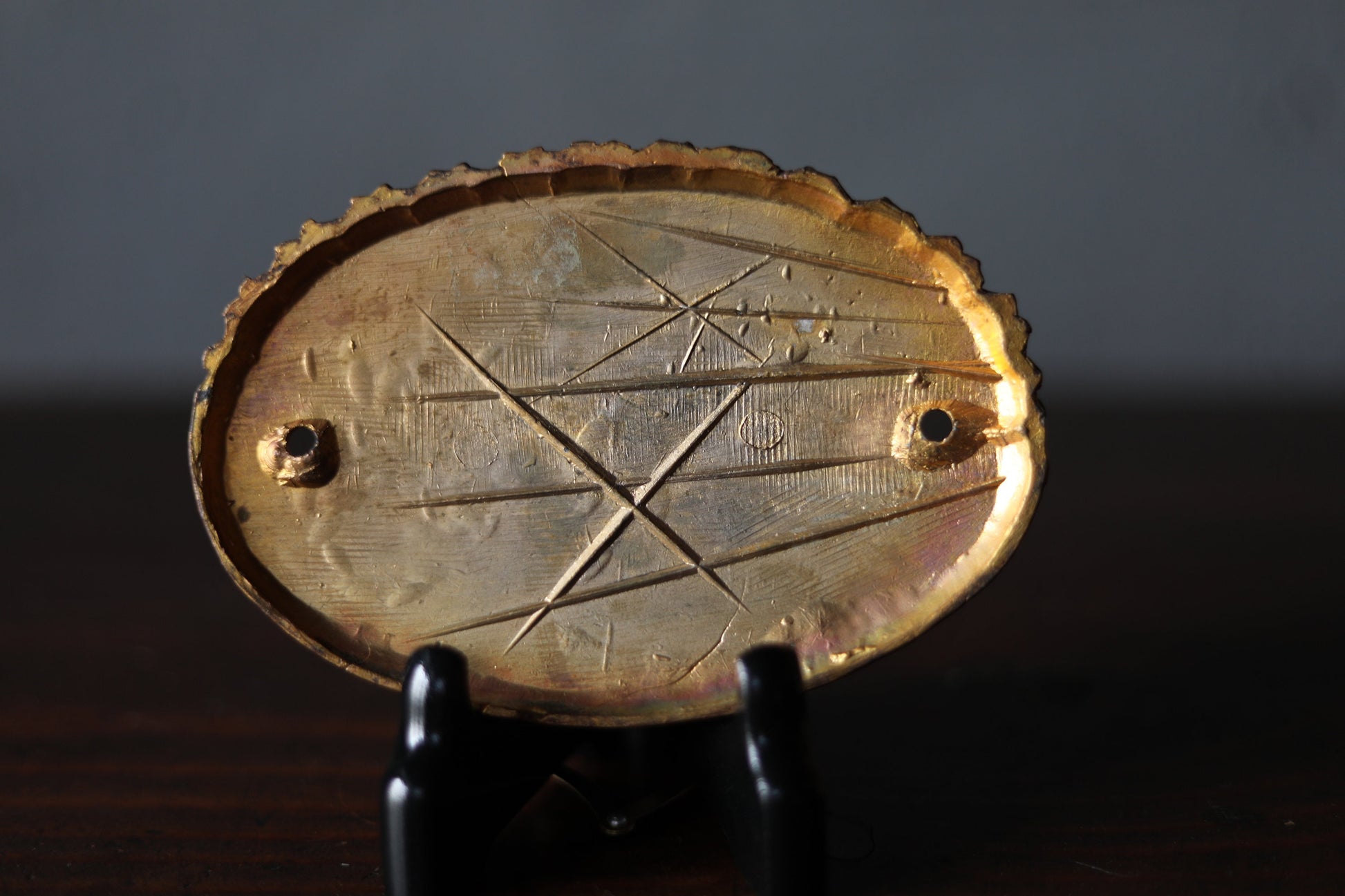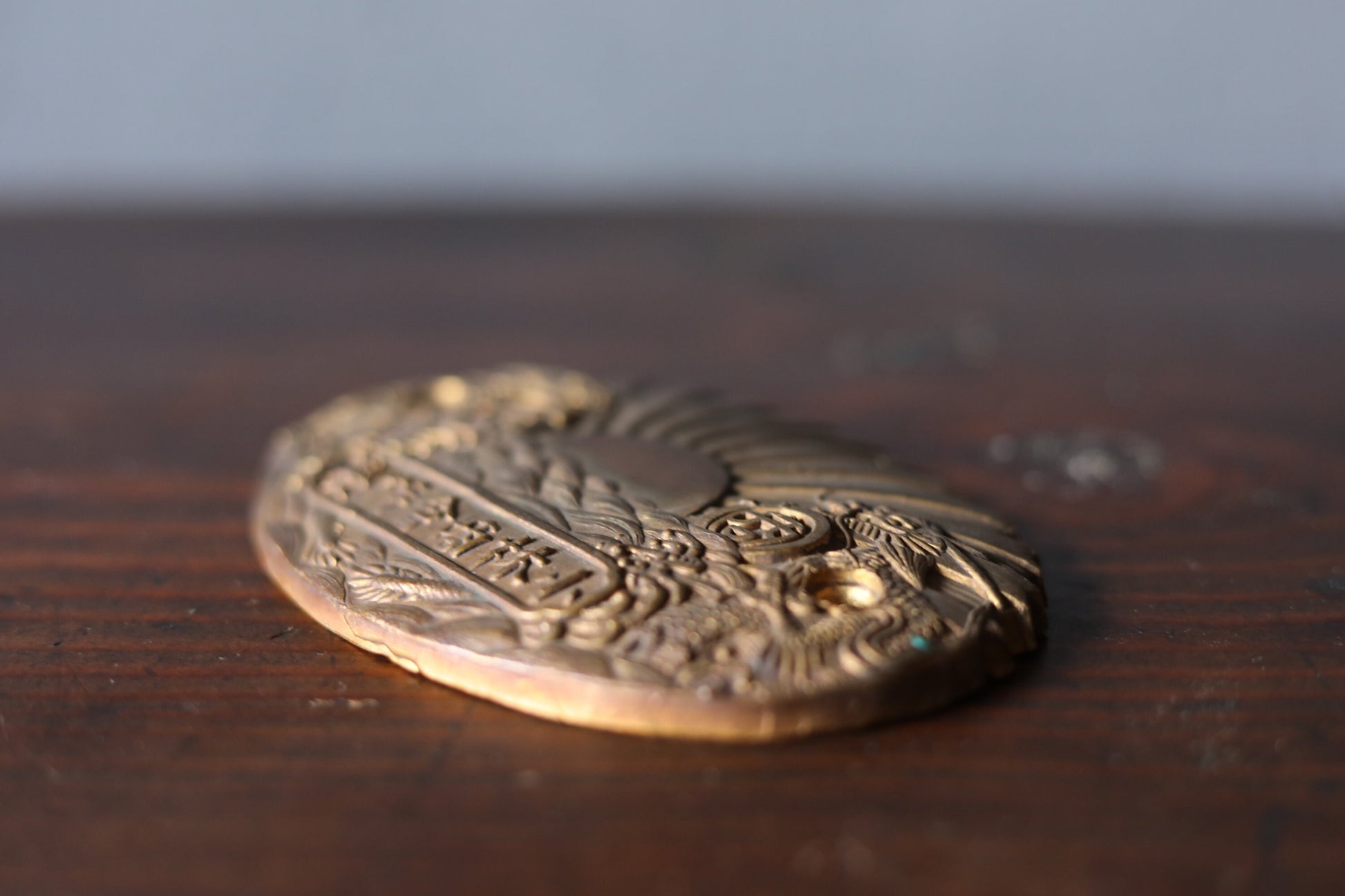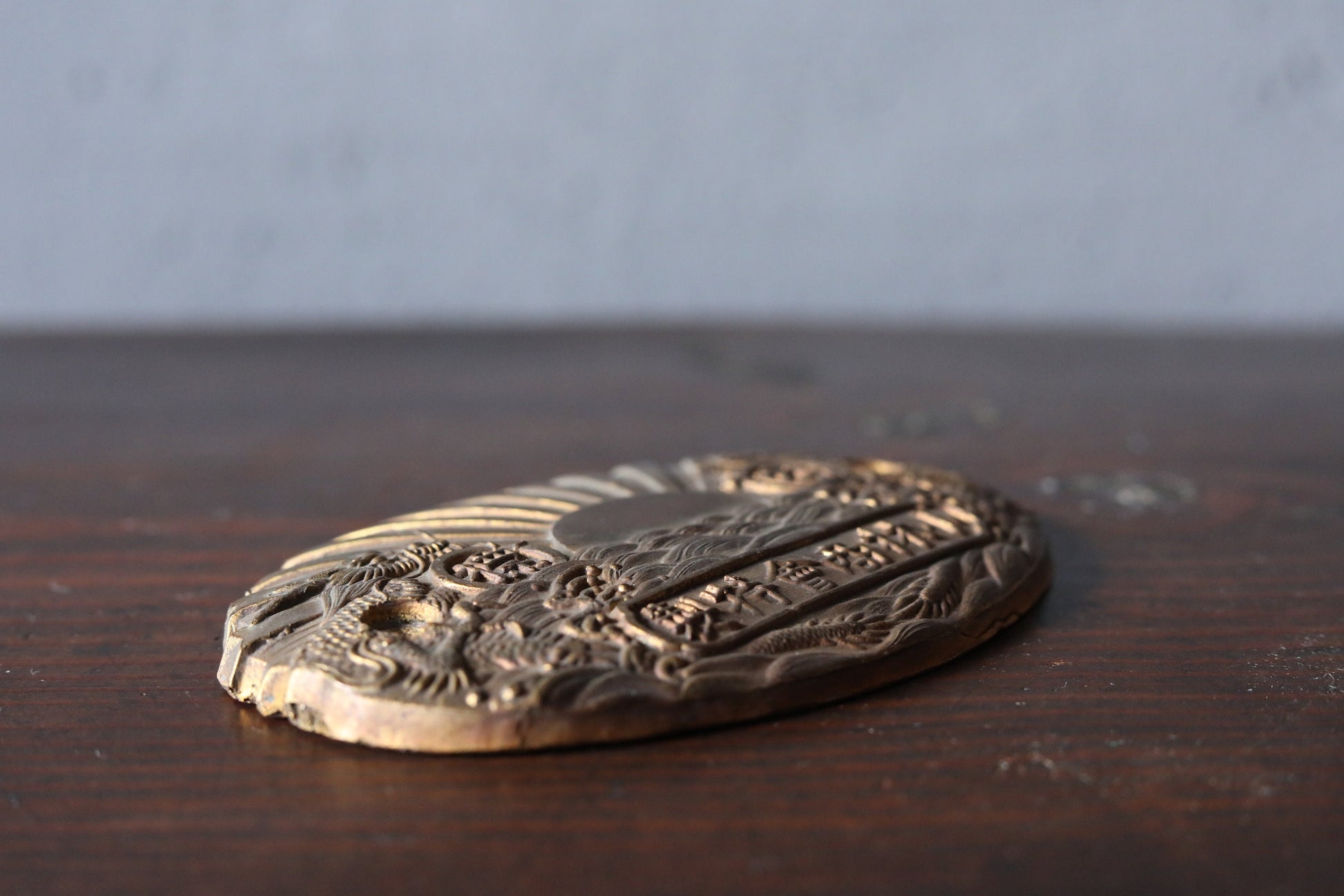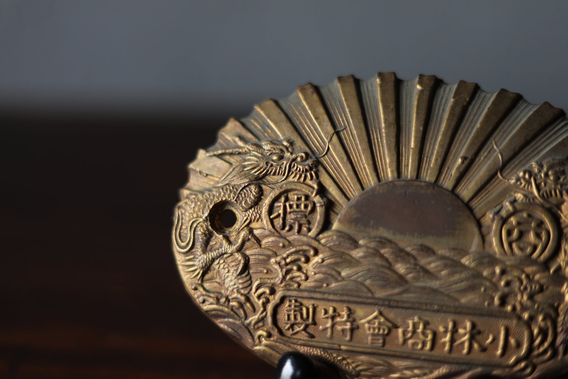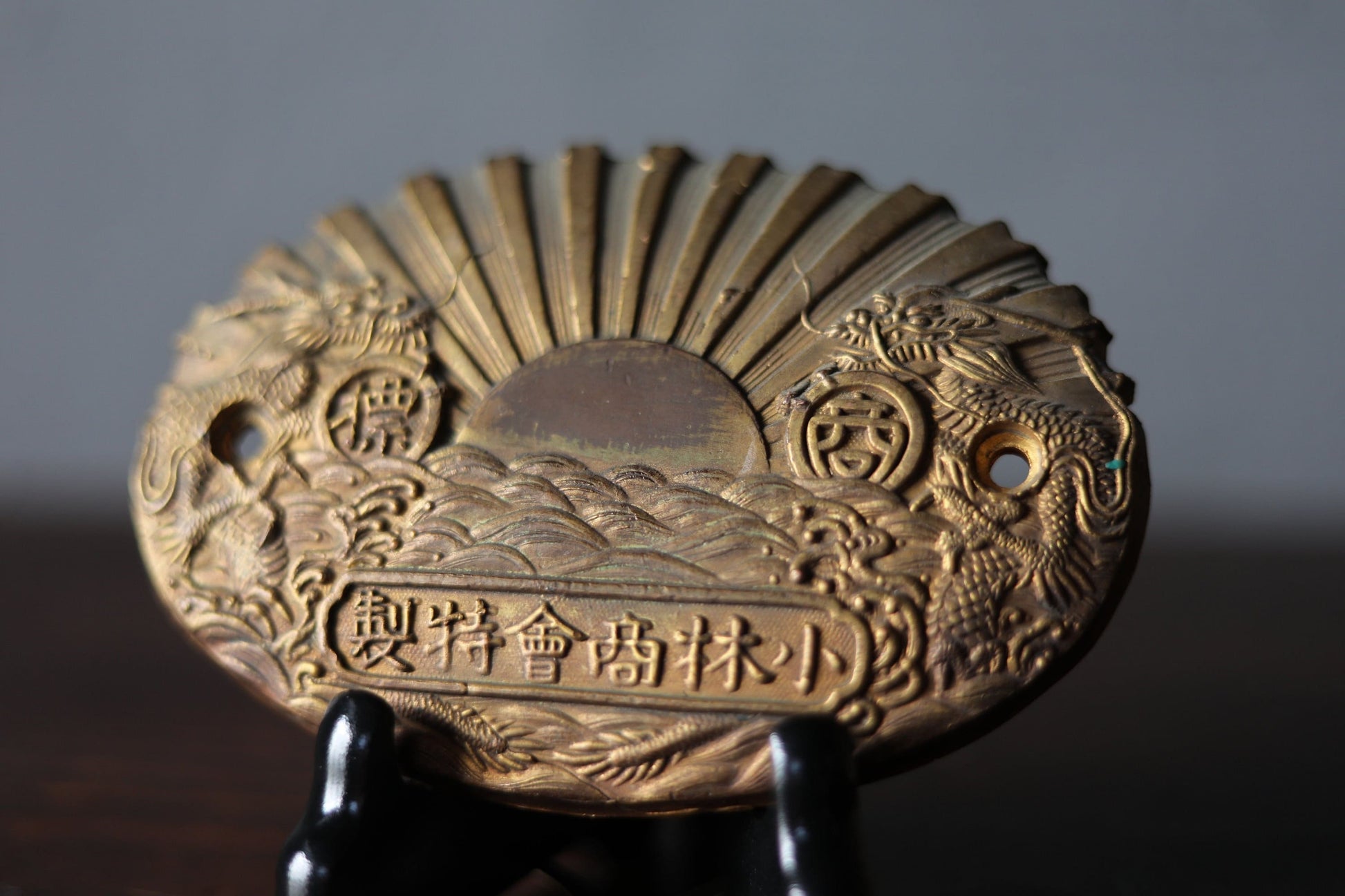 Japanese vintage metal plate for a safety box with relieves of sunrising on the sea, dragons and company name, H3.8xW5.5in