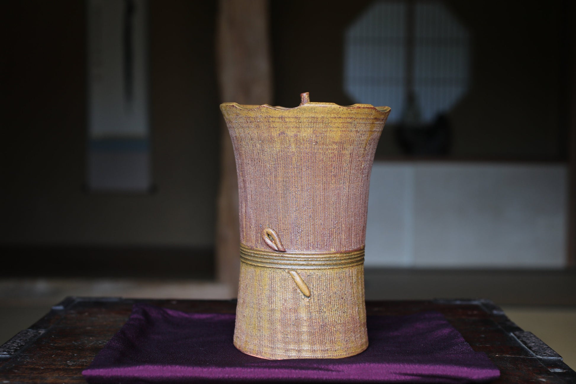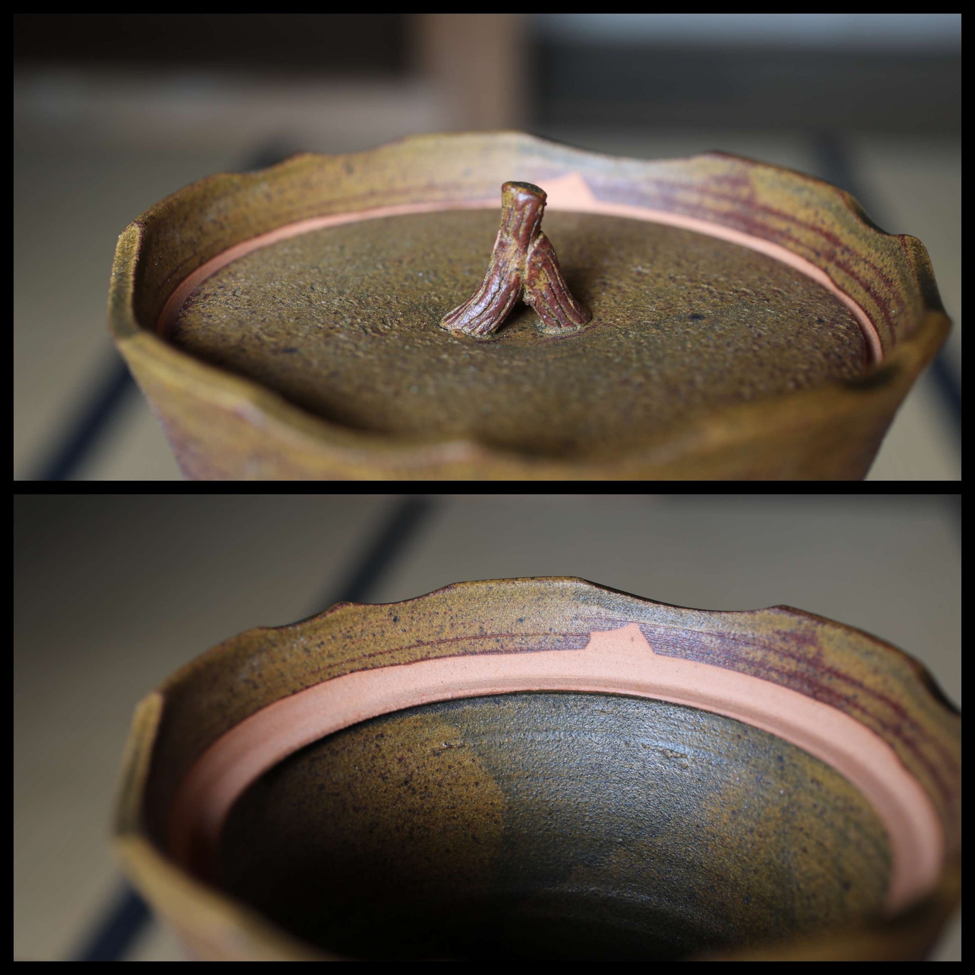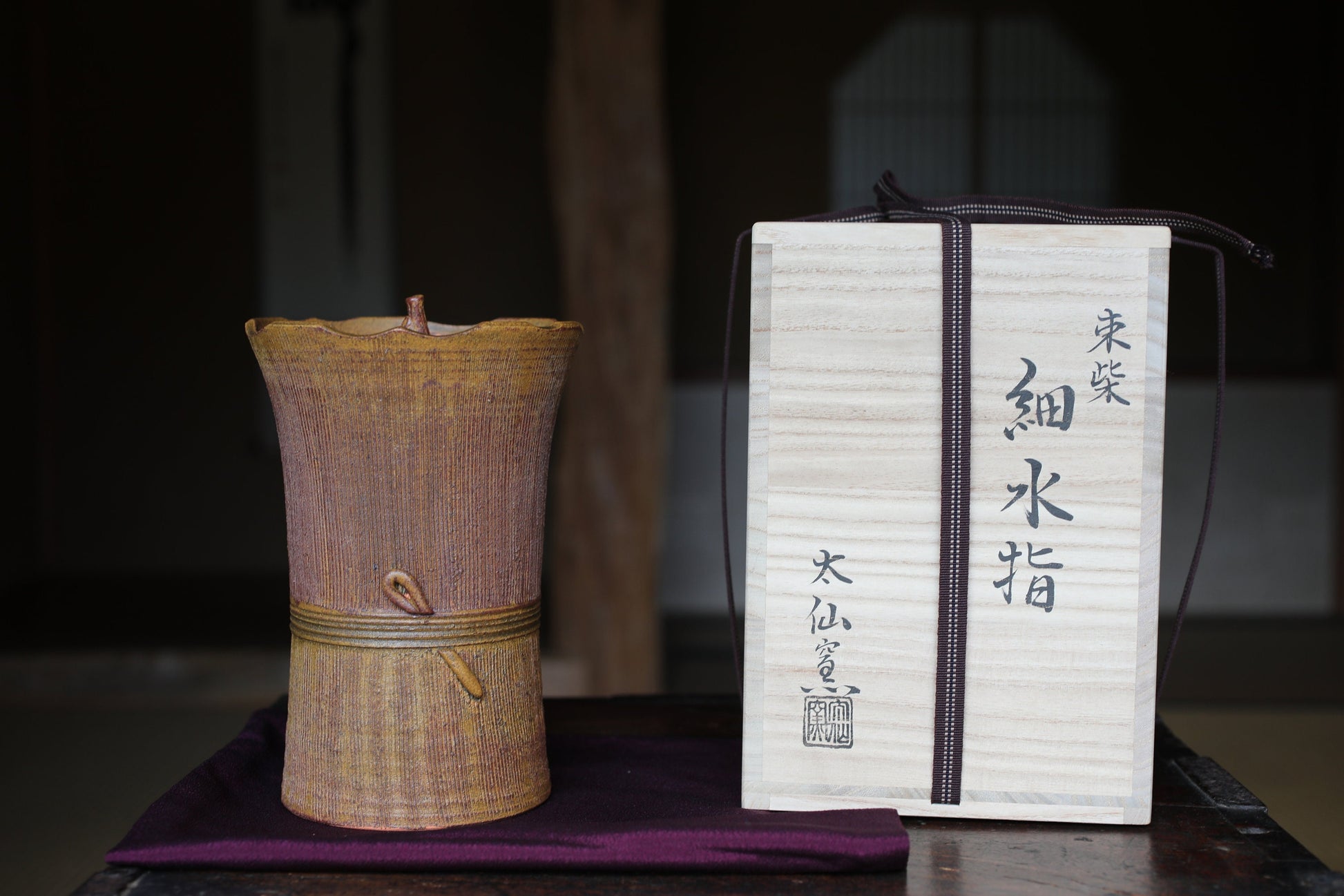 This mizusashi has a characteristic shape which is modeled from a bunch of brushwood tied up with a vine. Mizusashi is likely to have stout or heavy impression in tea room, but this tall and bright color jar with a narrow waist looks much lighter. A twig on a lid is also cute.
