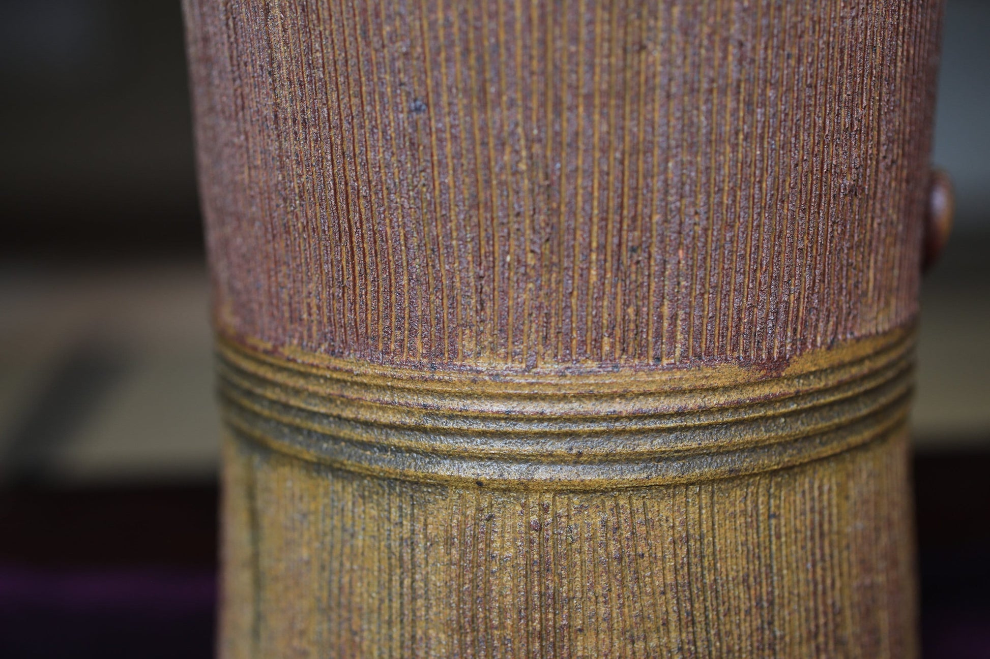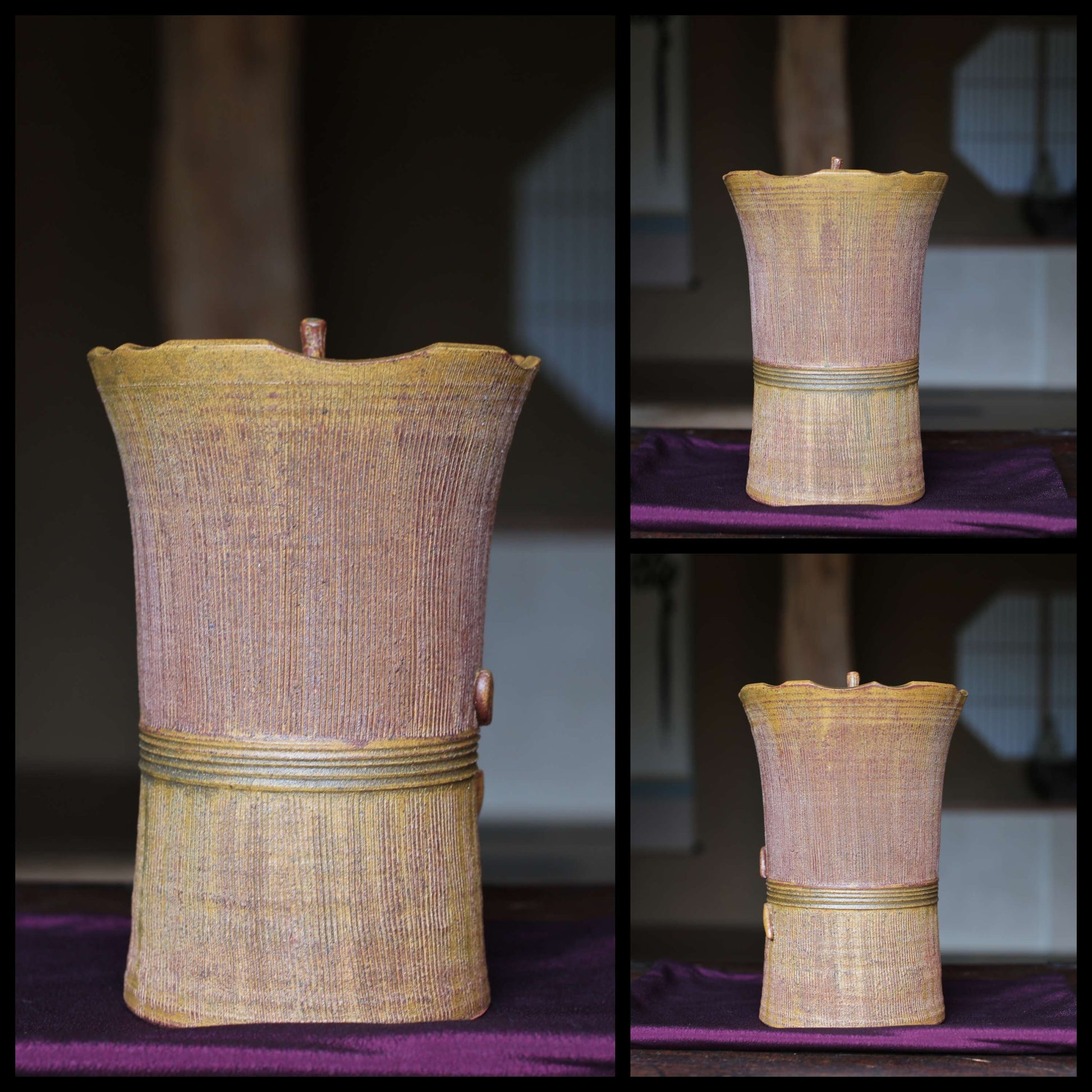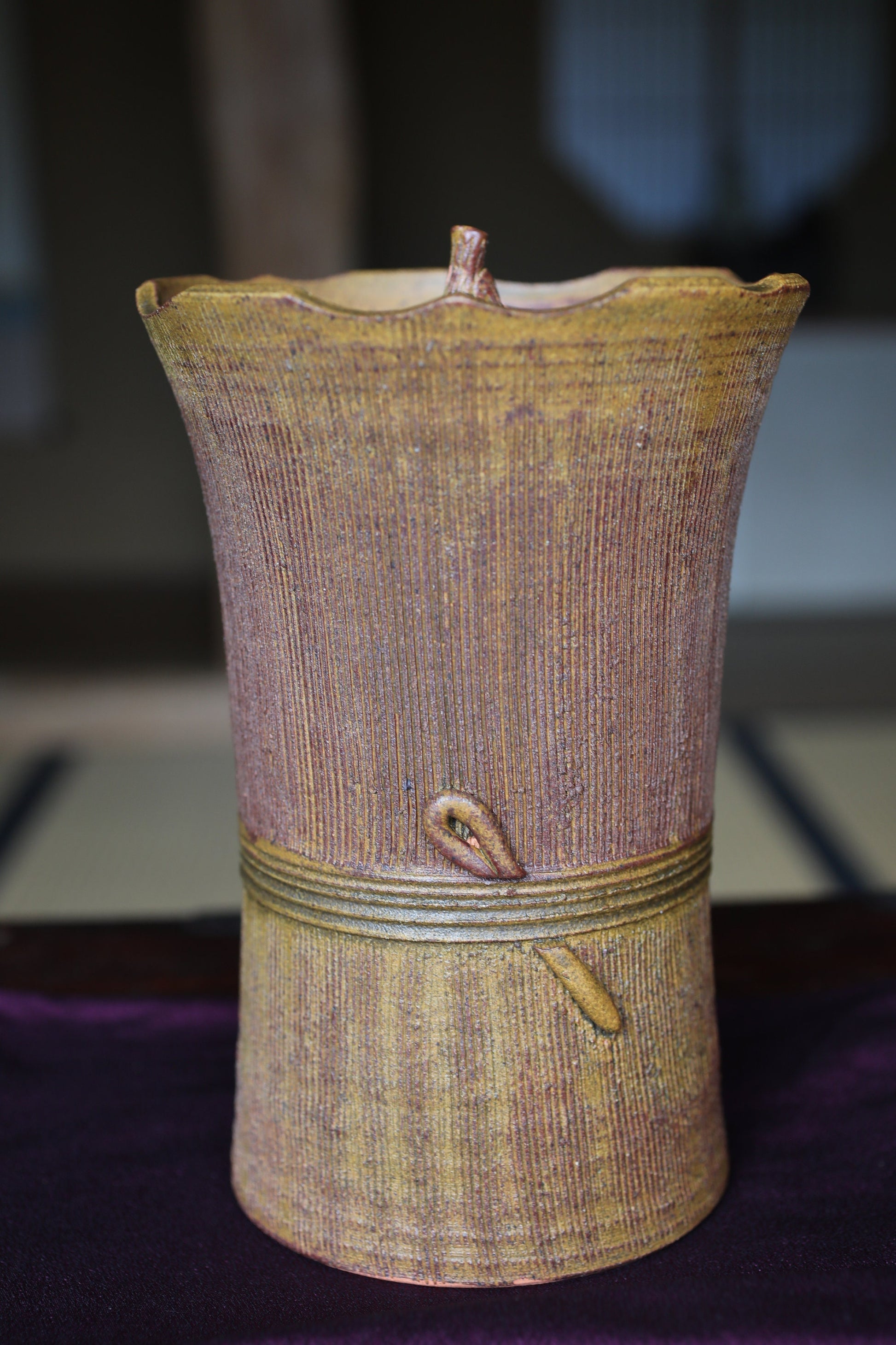 This mizusashi has a characteristic shape which is modeled from a bunch of brushwood tied up with a vine. Mizusashi is likely to have stout or heavy impression in tea room, but this tall and bright color jar with a narrow waist looks much lighter. A twig on a lid is also cute.