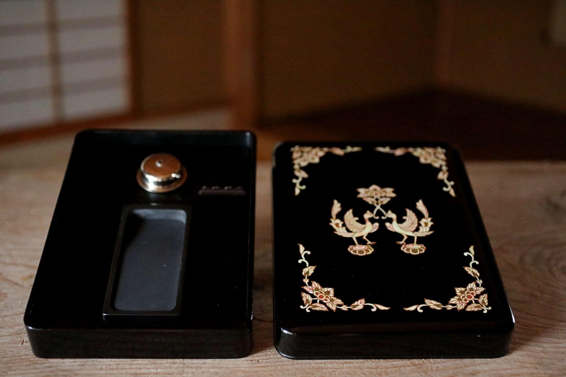 Japanese vintage portable Suzuri-bako Zen writing set Ink calligraphy with lacquer box bird flower design Brush ink etc 9.6×7.1in/24.5×18cm