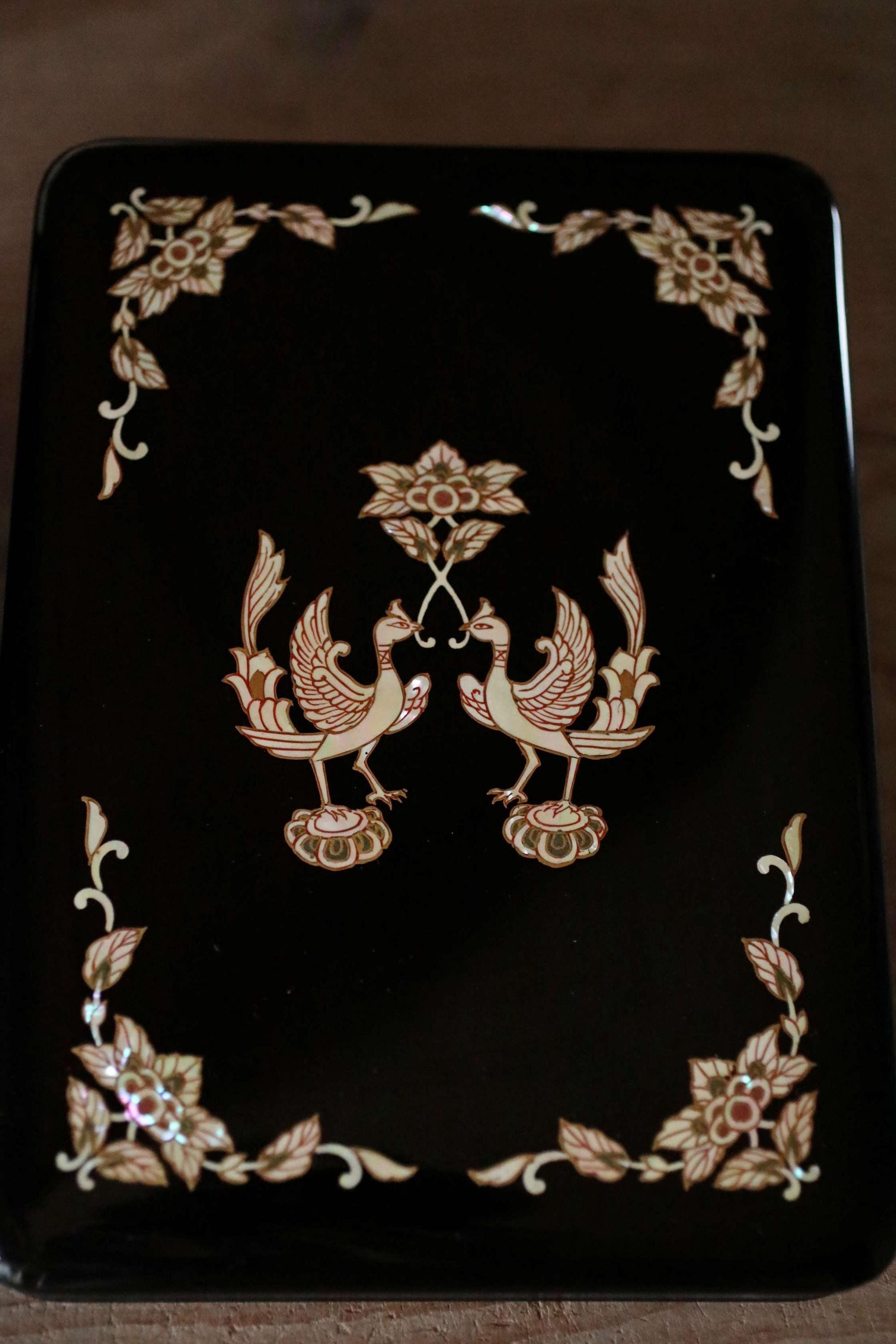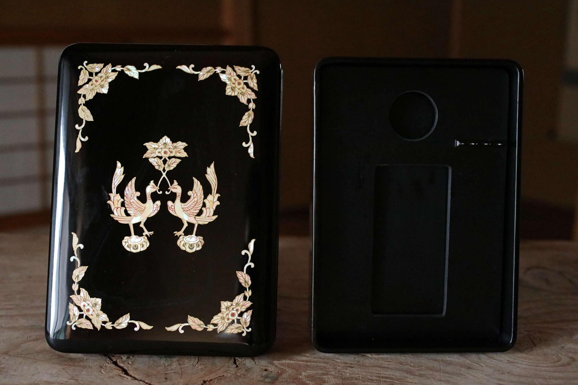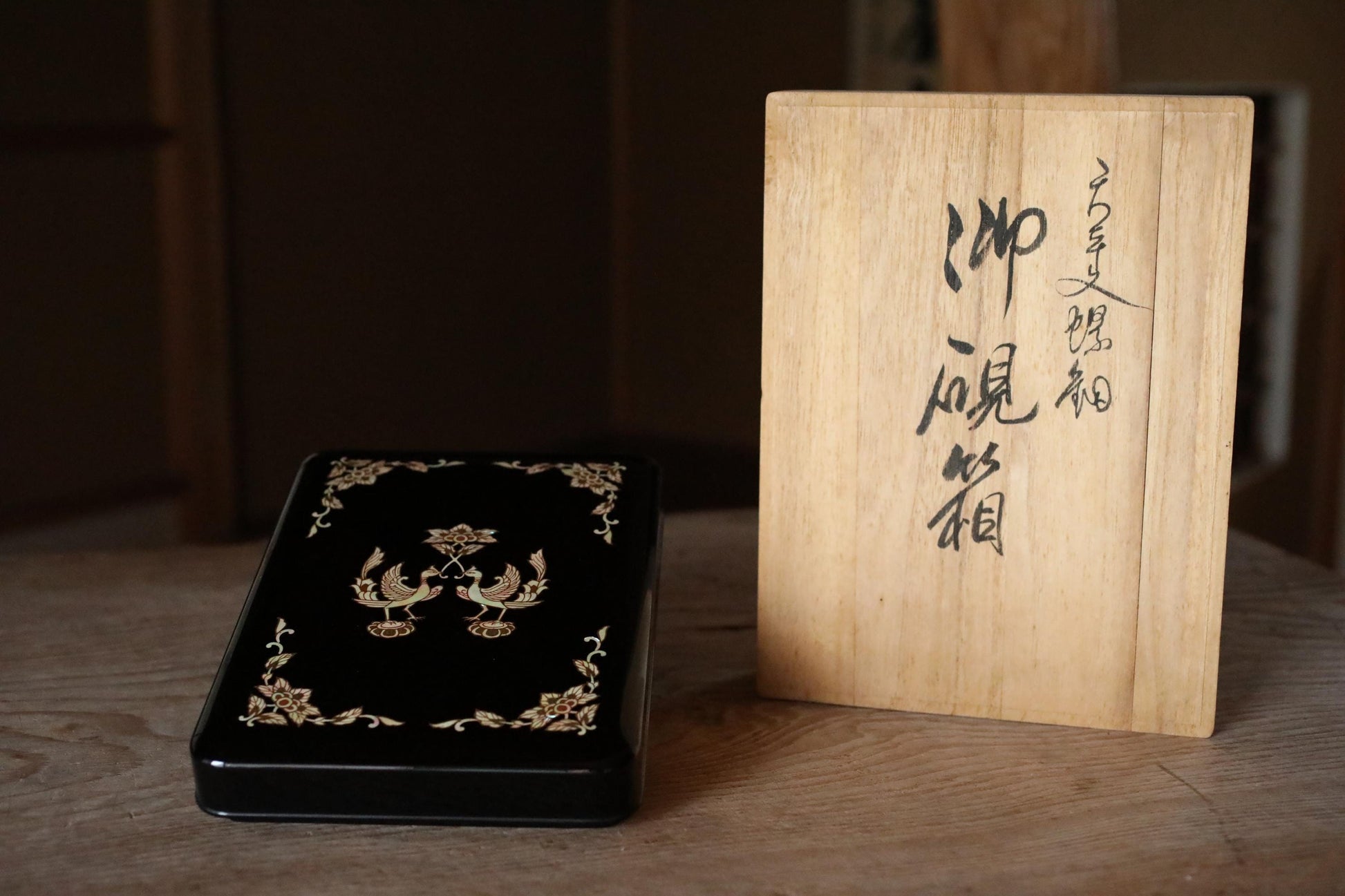 The box has a legendary bird called a phoenix and a paulownia flower, in which the bird is said to appear, painted on the bottom using a technique called maki-e. In addition, shells are embedded using a technique called raden (sea shell inlay), which sparkle beautifully from different angles.