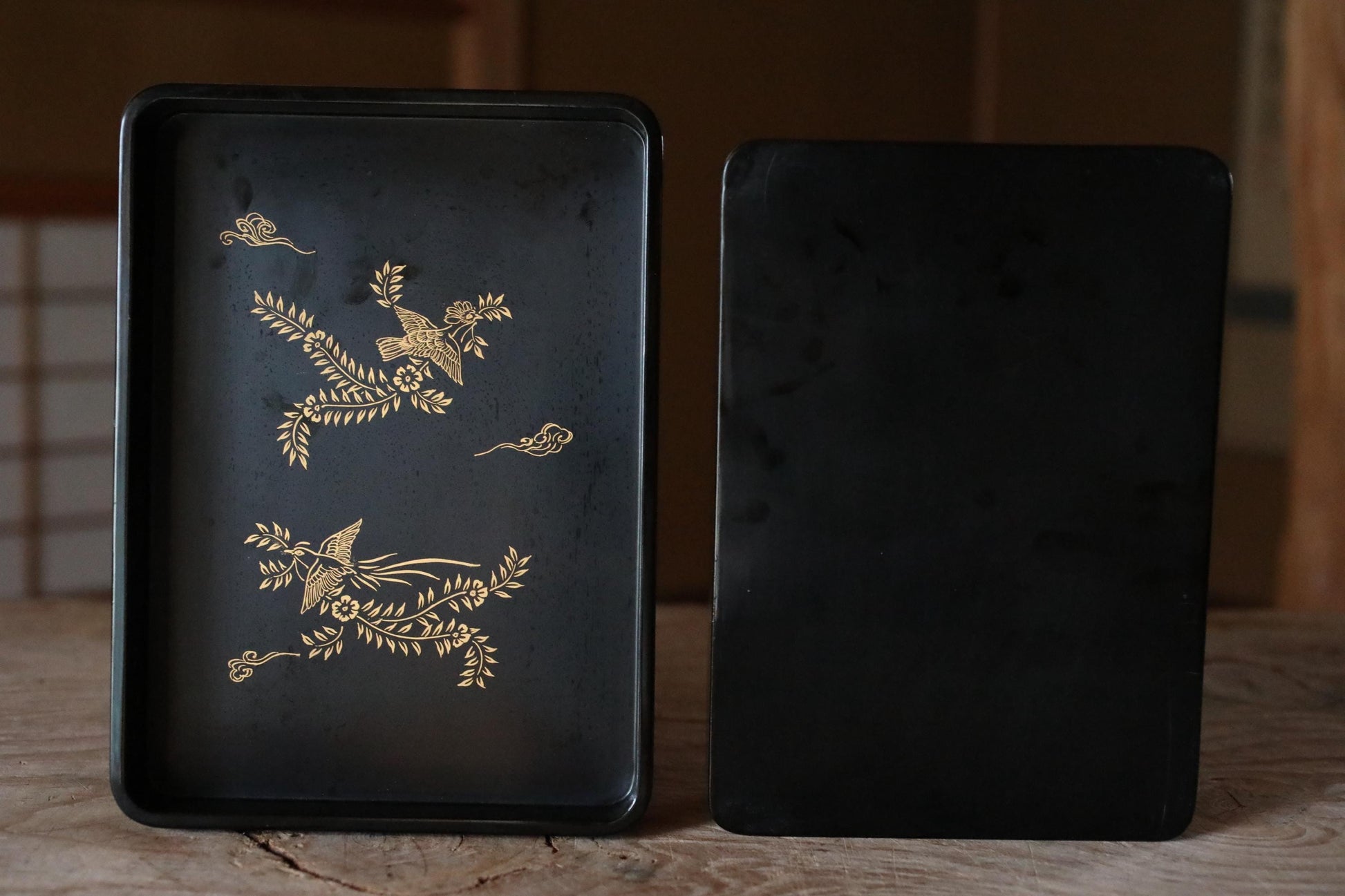 Japanese vintage portable Suzuri-bako Zen writing set Ink calligraphy with lacquer box bird flower design Brush ink etc 9.6×7.1in/24.5×18cm.