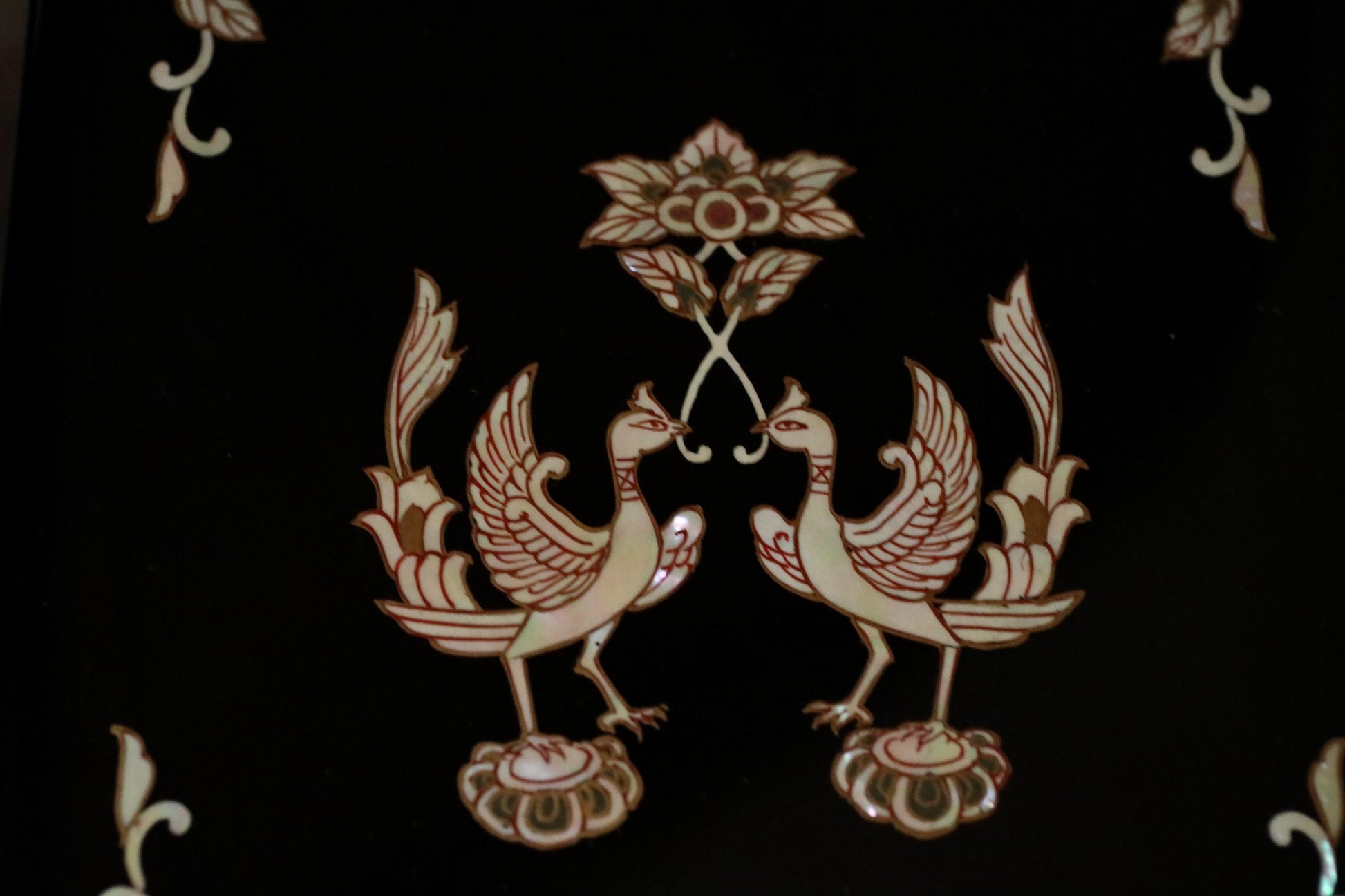 Material: wood, lacquer, sea shell, stone, metal, bamboo, ink