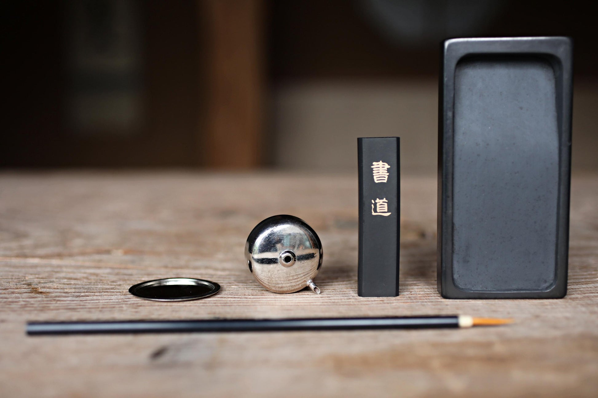 The set includes an inkstone, ink stick, brush, and metal water dropper. 墨Sumi ink is also included.