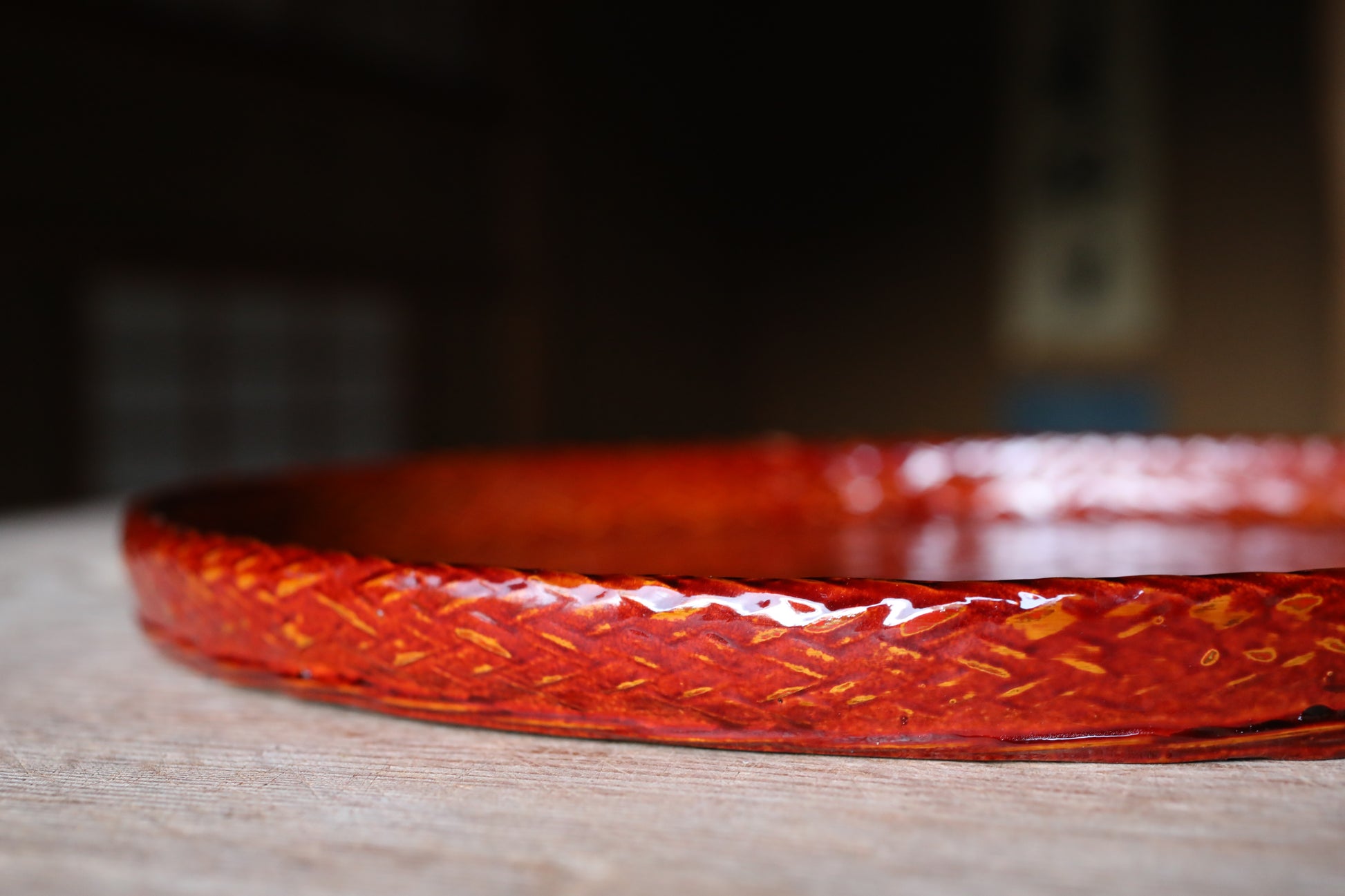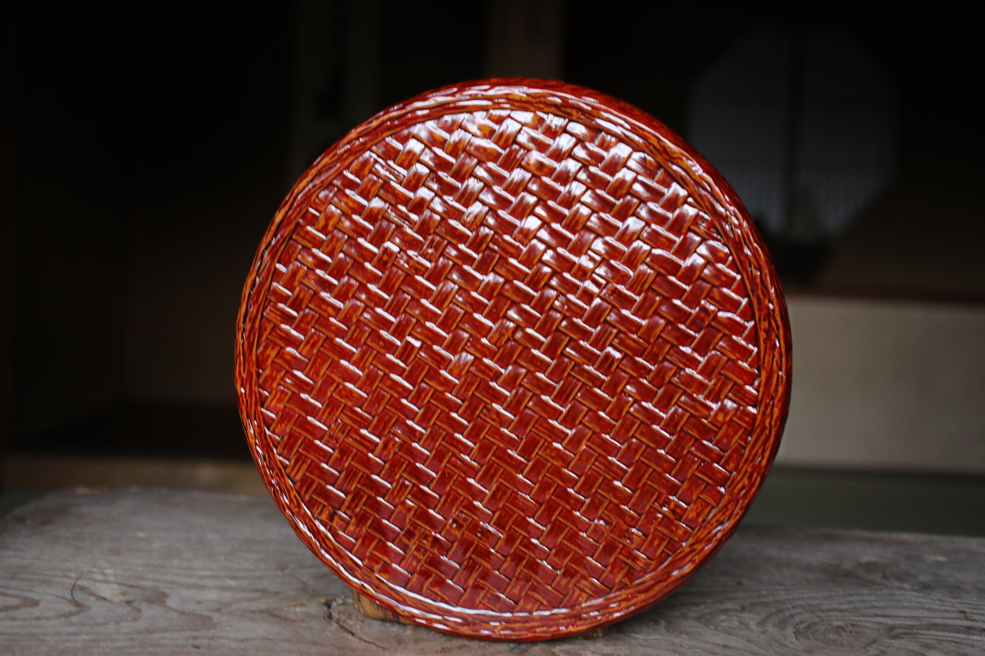 Japanese vintage beautiful round bamboo woven lacquered tray for Tea ceremony, Japanese traditional handcraft H1.1xW14.3in/H2.7xW36.2cm