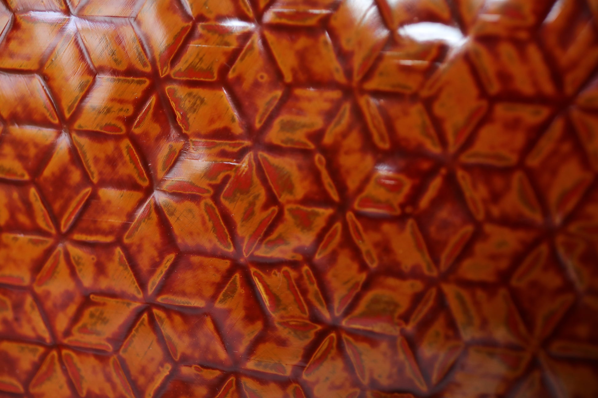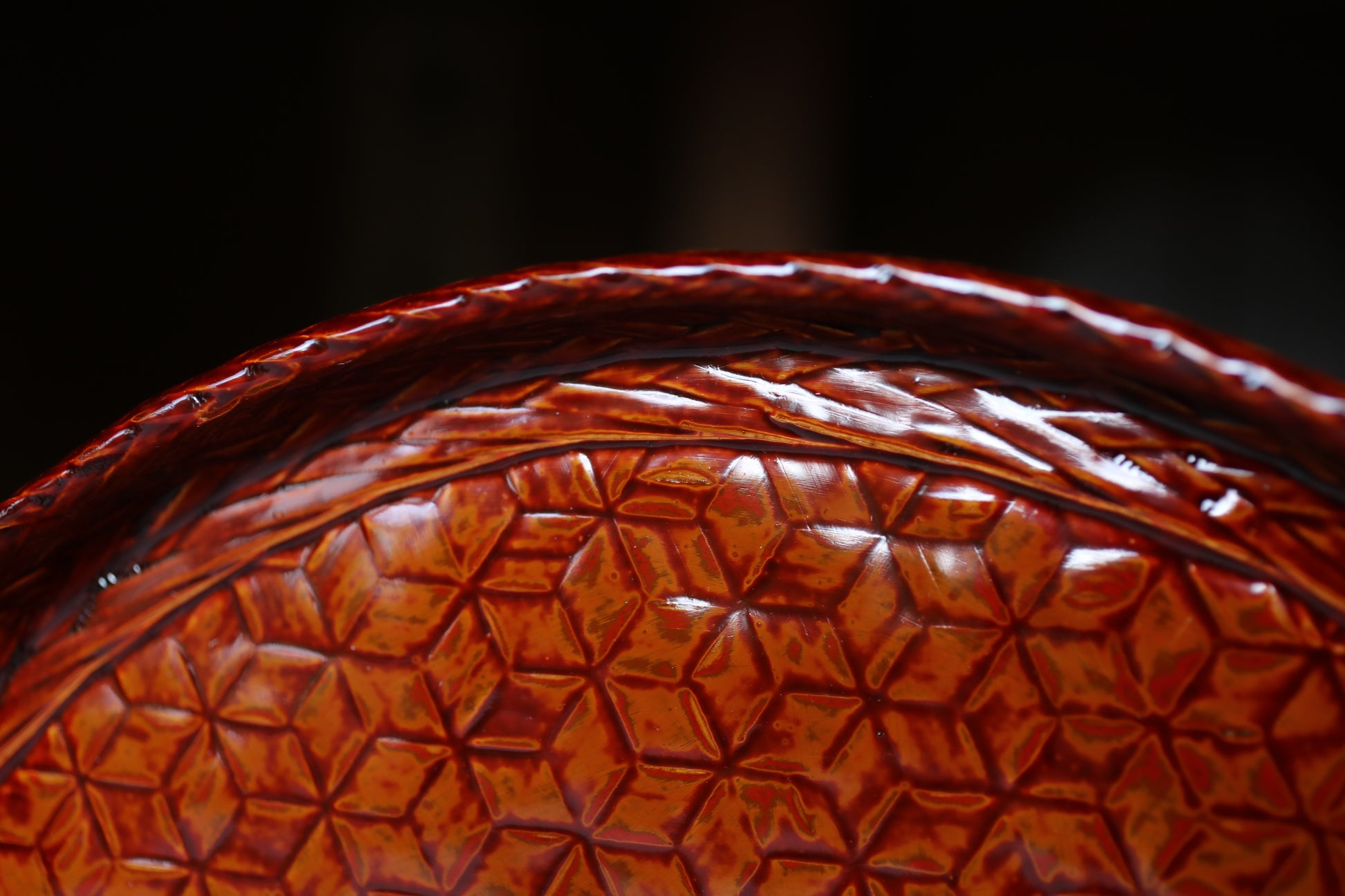 After this, the lacquer is applied and polished repeatedly to create a beautiful luster. The signature mottled pattern is a result of this polishing process. It's created by sanding the lacquered bamboo basket, which partially removes the lacquer along the weave and reveals the base color underneath. Over-polishing can strip away the base color, making it difficult to apply the right amount of pressure evenly, which requires advanced technique.