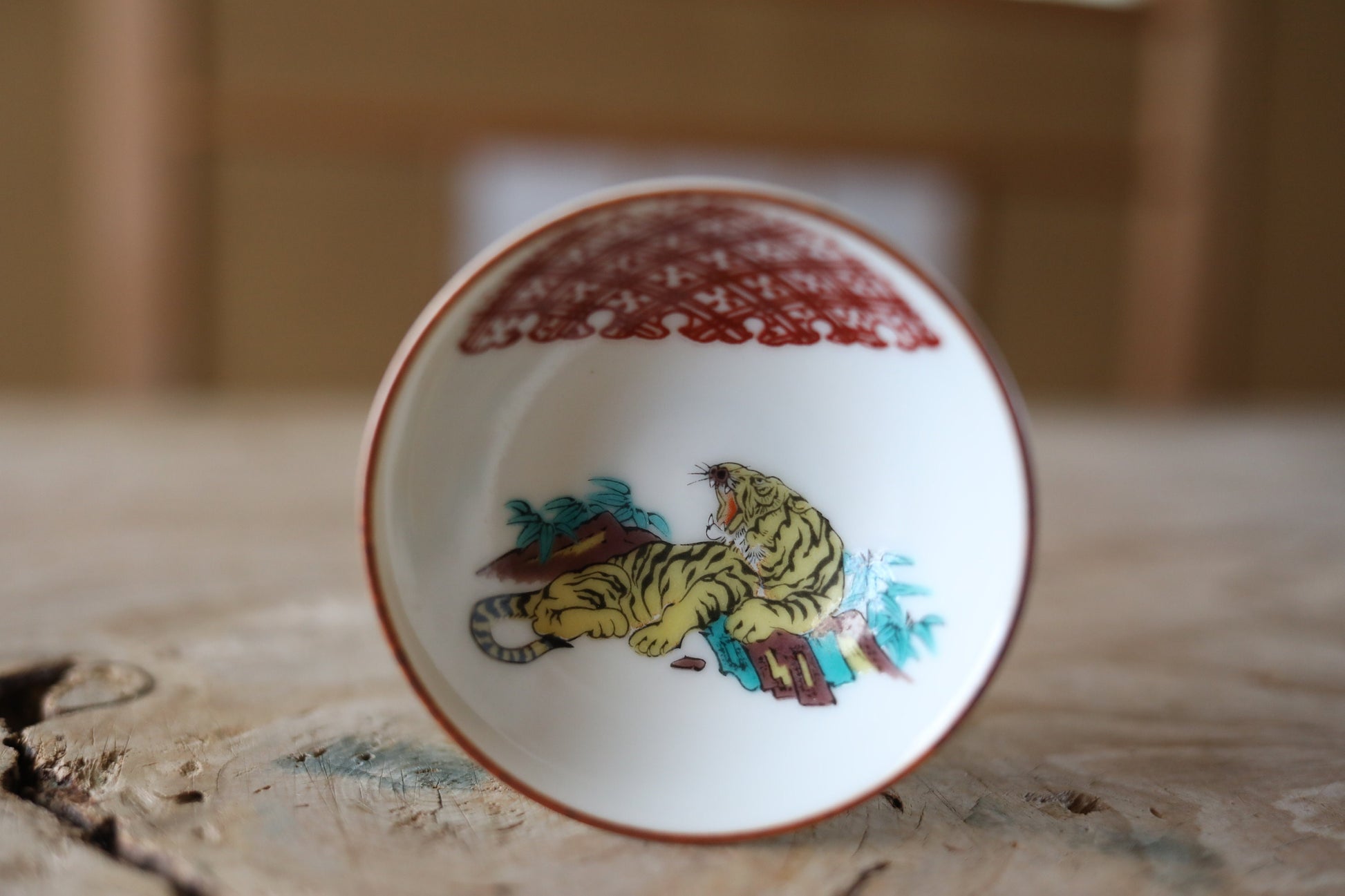 Japanese vintage Sake Cup with tigger painting Kutani porcelain cup beautiful hand painting with sign For GIFT 2.9in/7.4cm