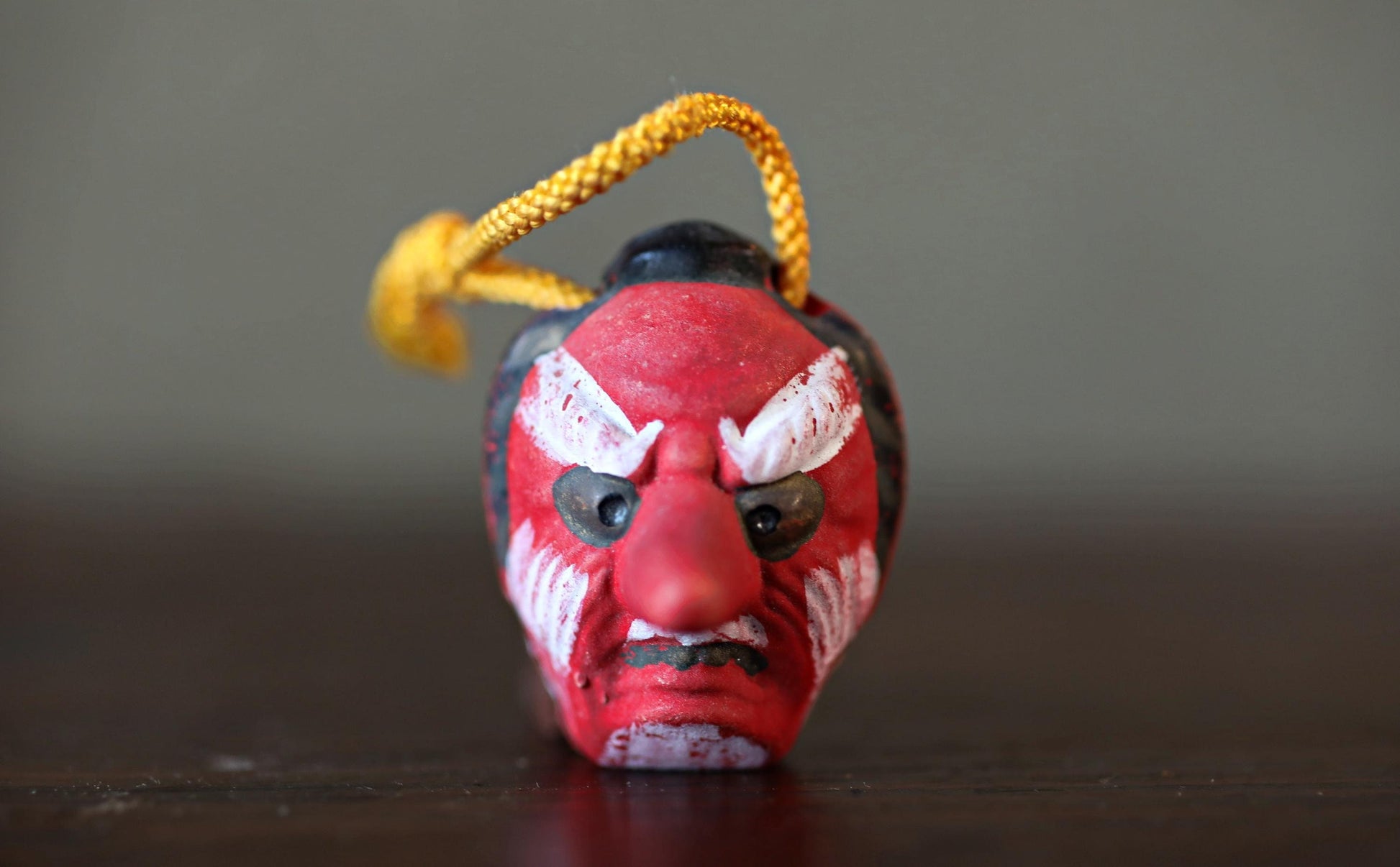 These motifs are 天狗tengu. Their small size is adorable. Tengu is a legendary creature from Japanese folk beliefs, also known as a god or demon. They are characterized by their long noses. On the back side, it is written “魔除/talisman” in Kanji characters.