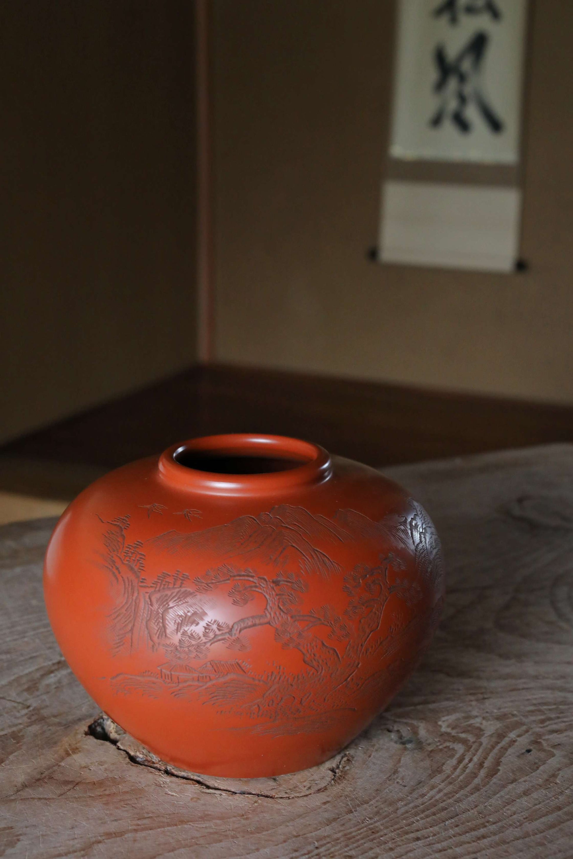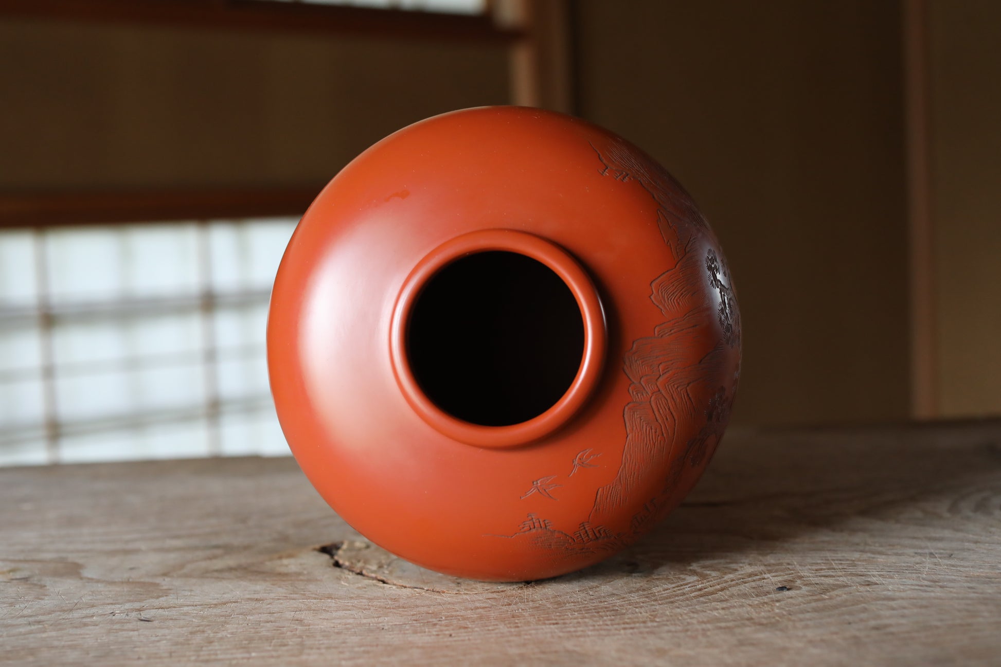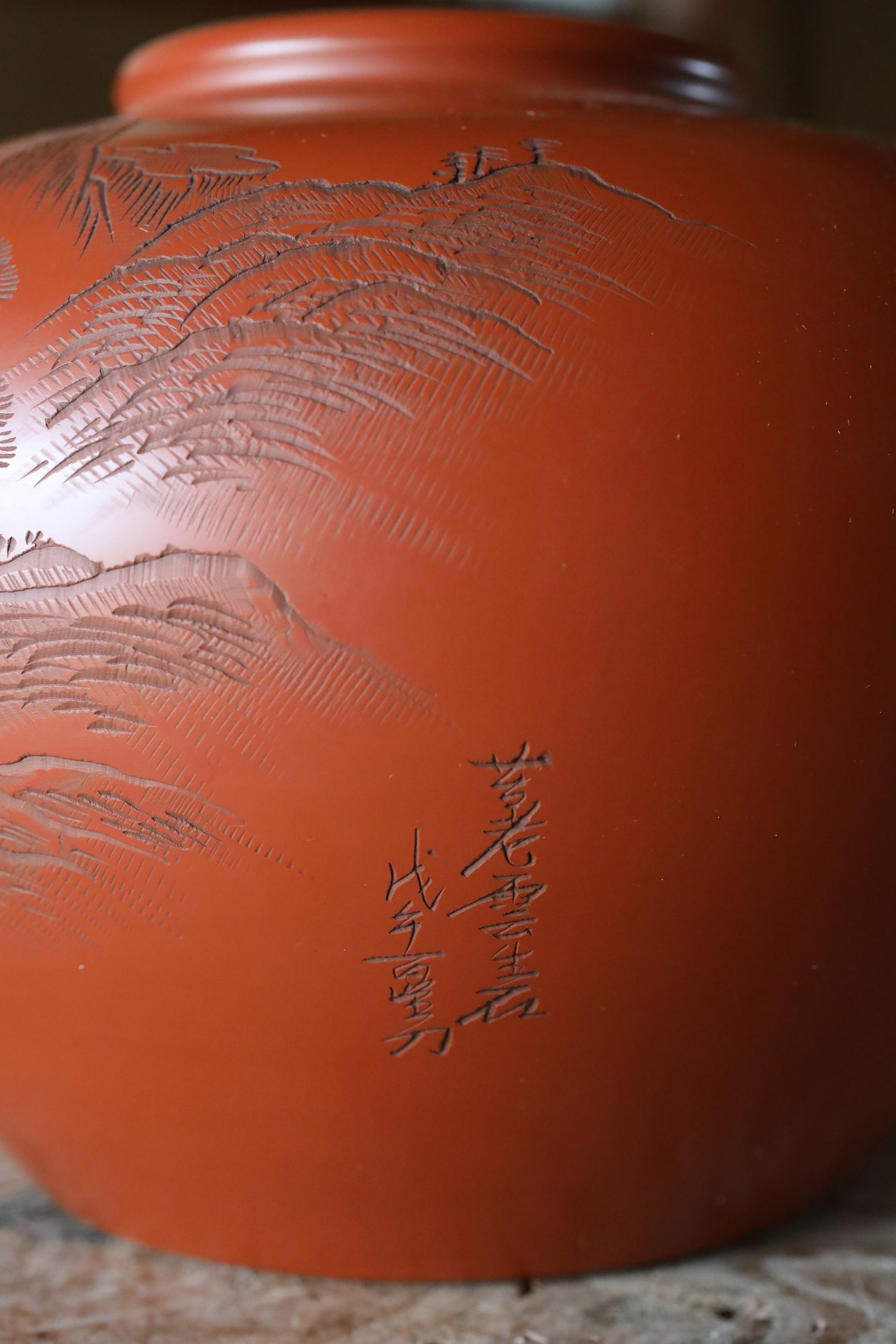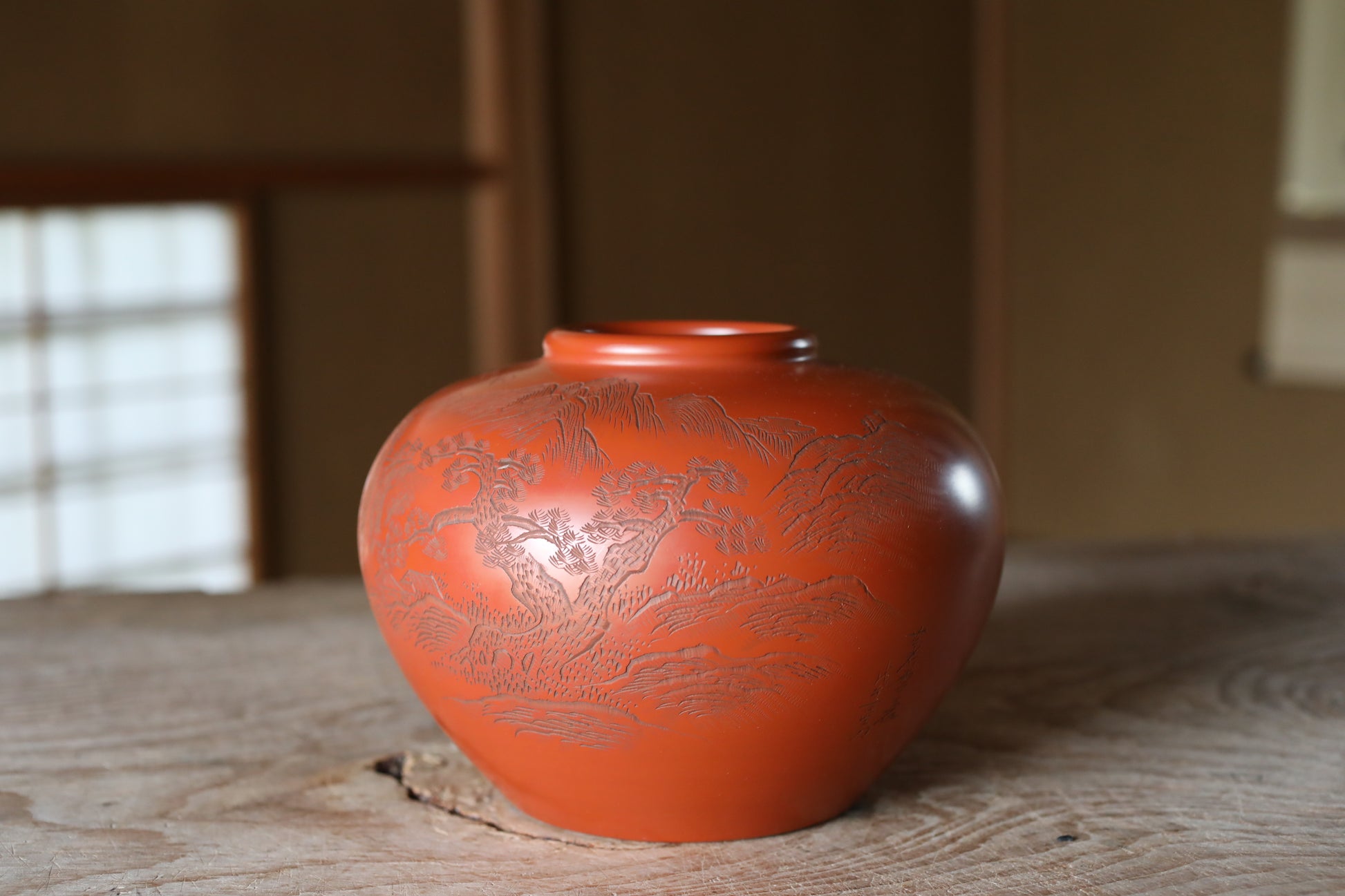 Japanese vintage Tokoname ware vase with a pine tree and hand made kiln craft jar flower vase red clay Kanji signed H5.5×7.9in/H14×20cm