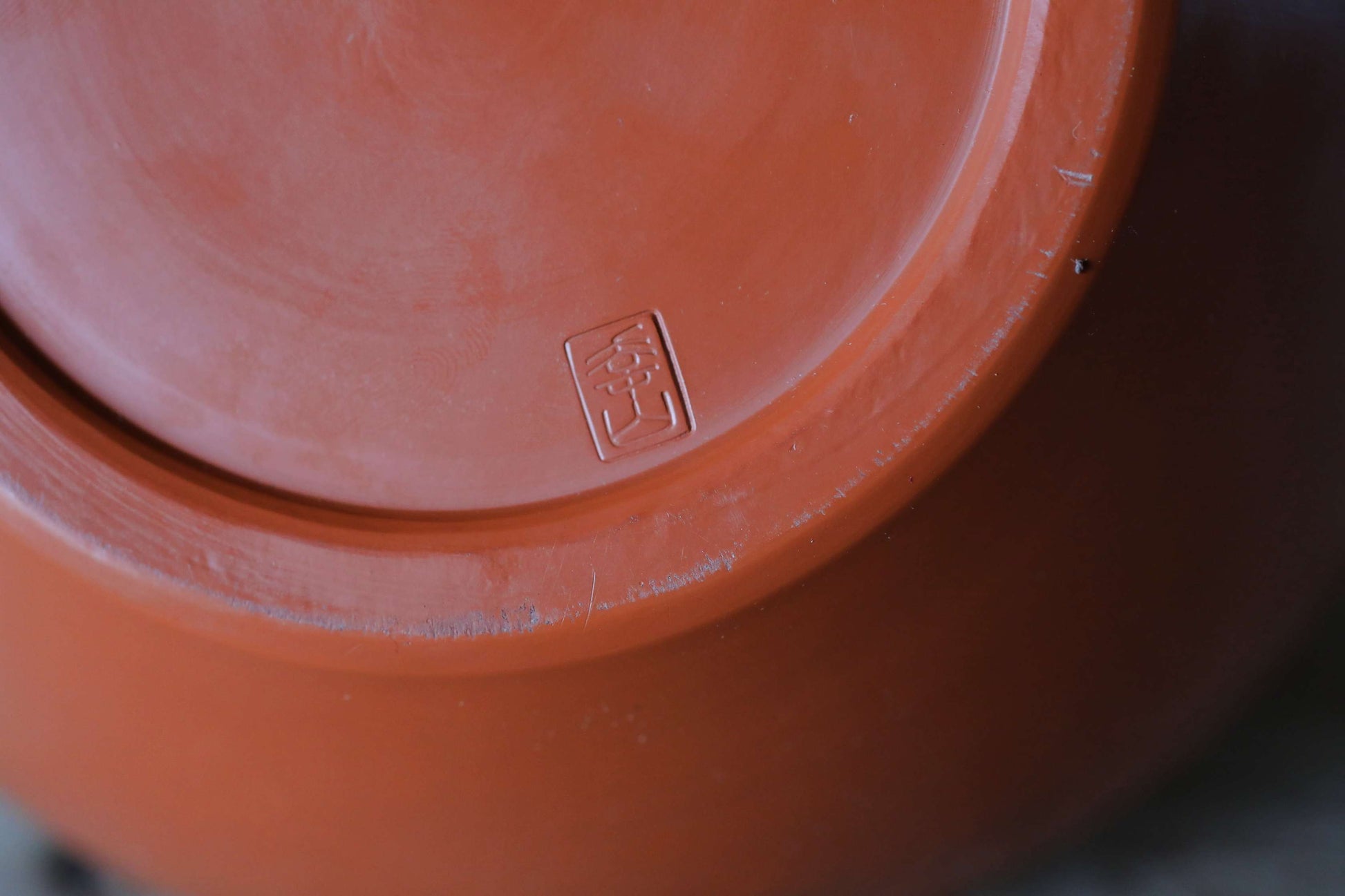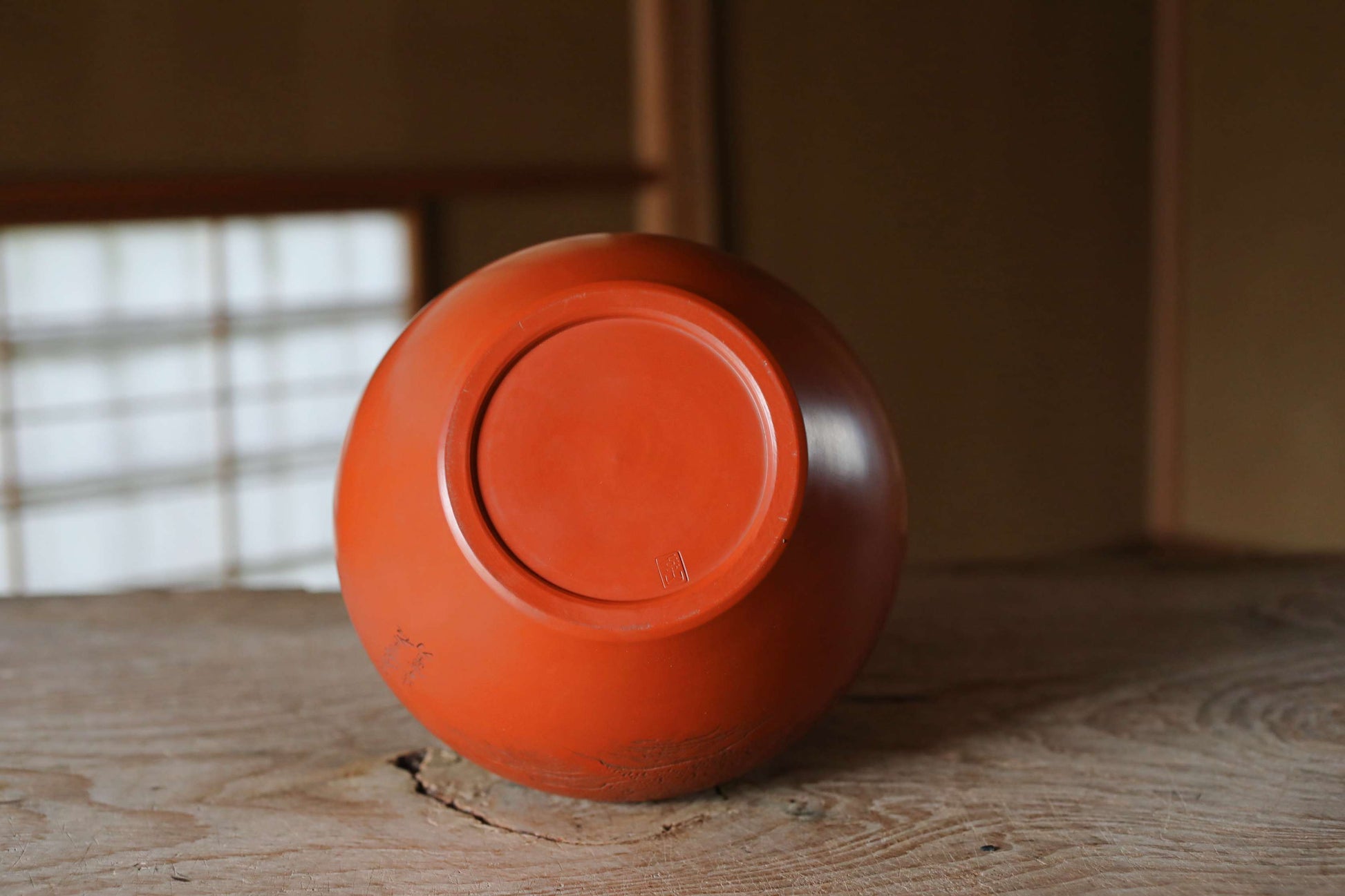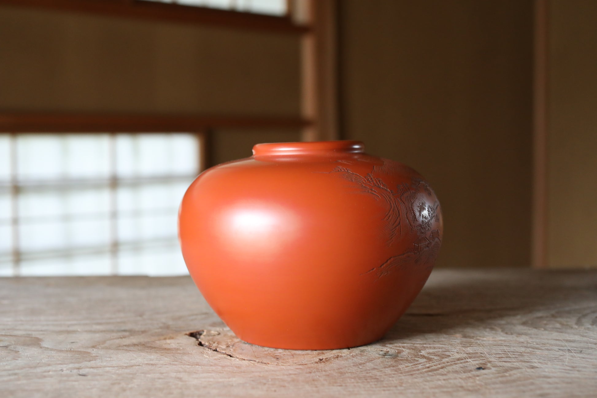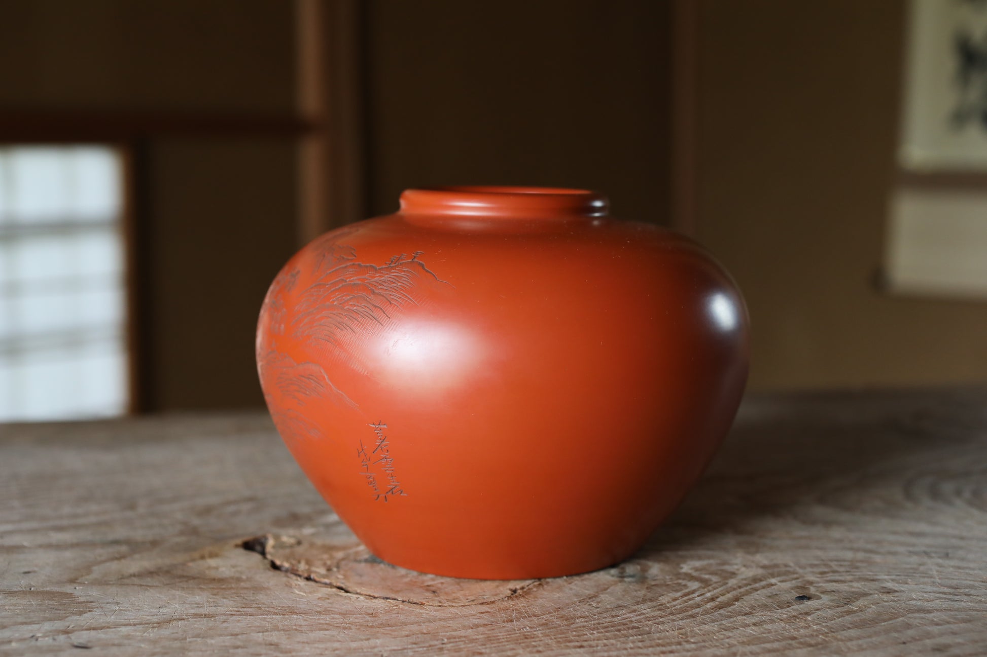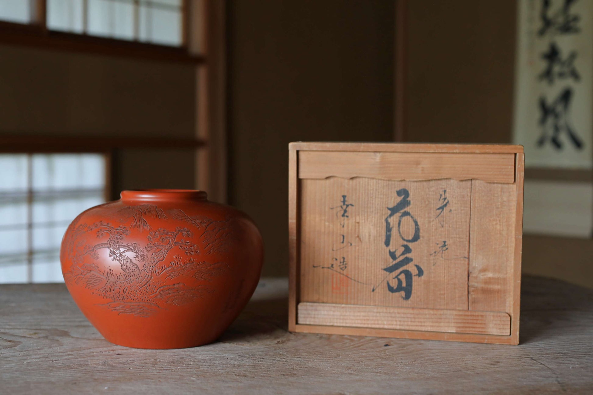 Japanese vintage Tokoname ware vase with a pine tree and hand made kiln craft jar flower vase red clay Kanji signed H5.5×7.9in/H14×20cm