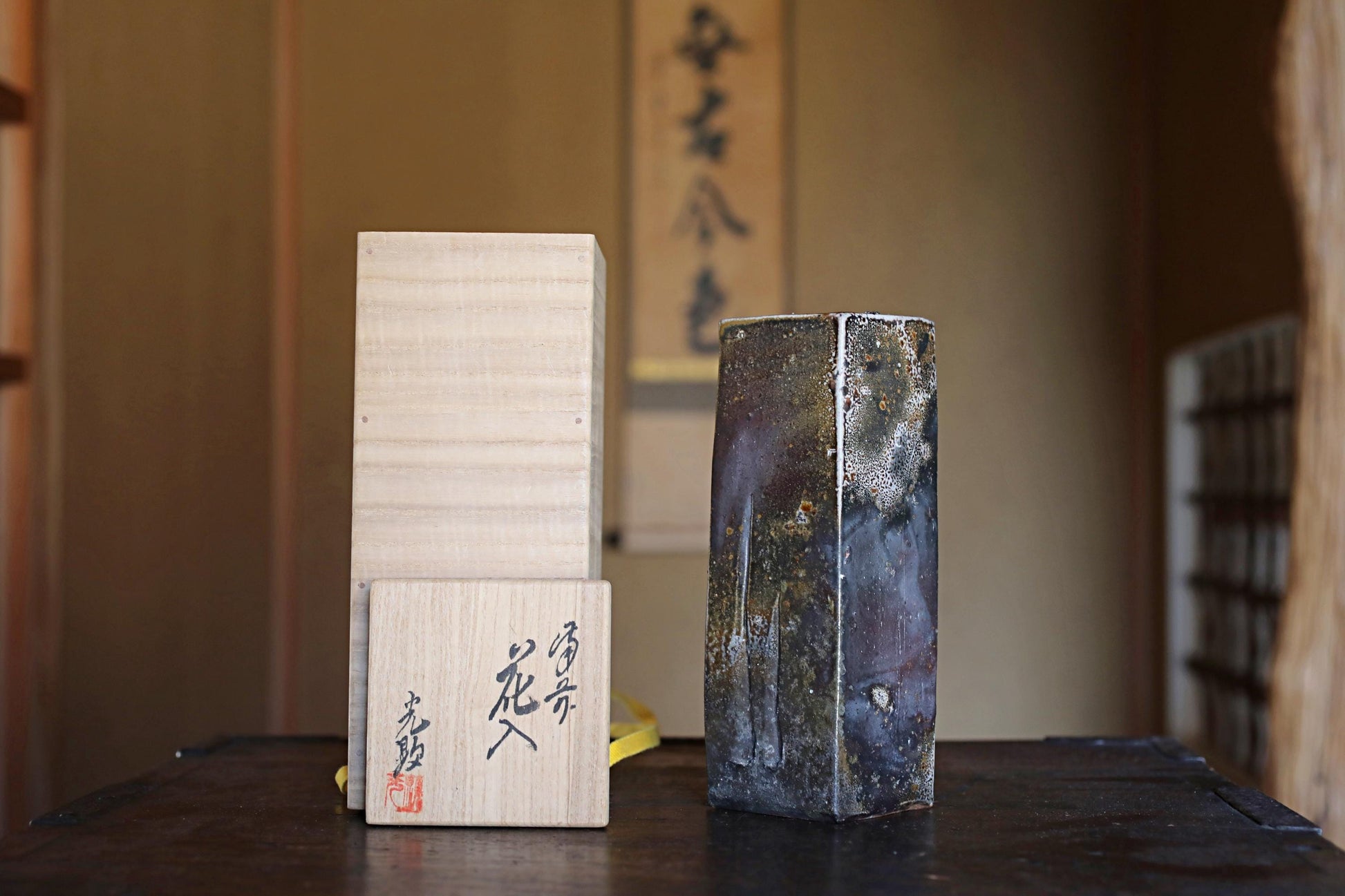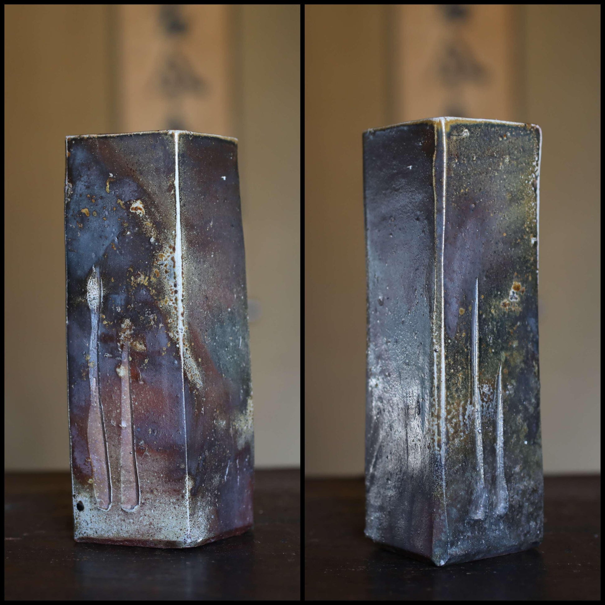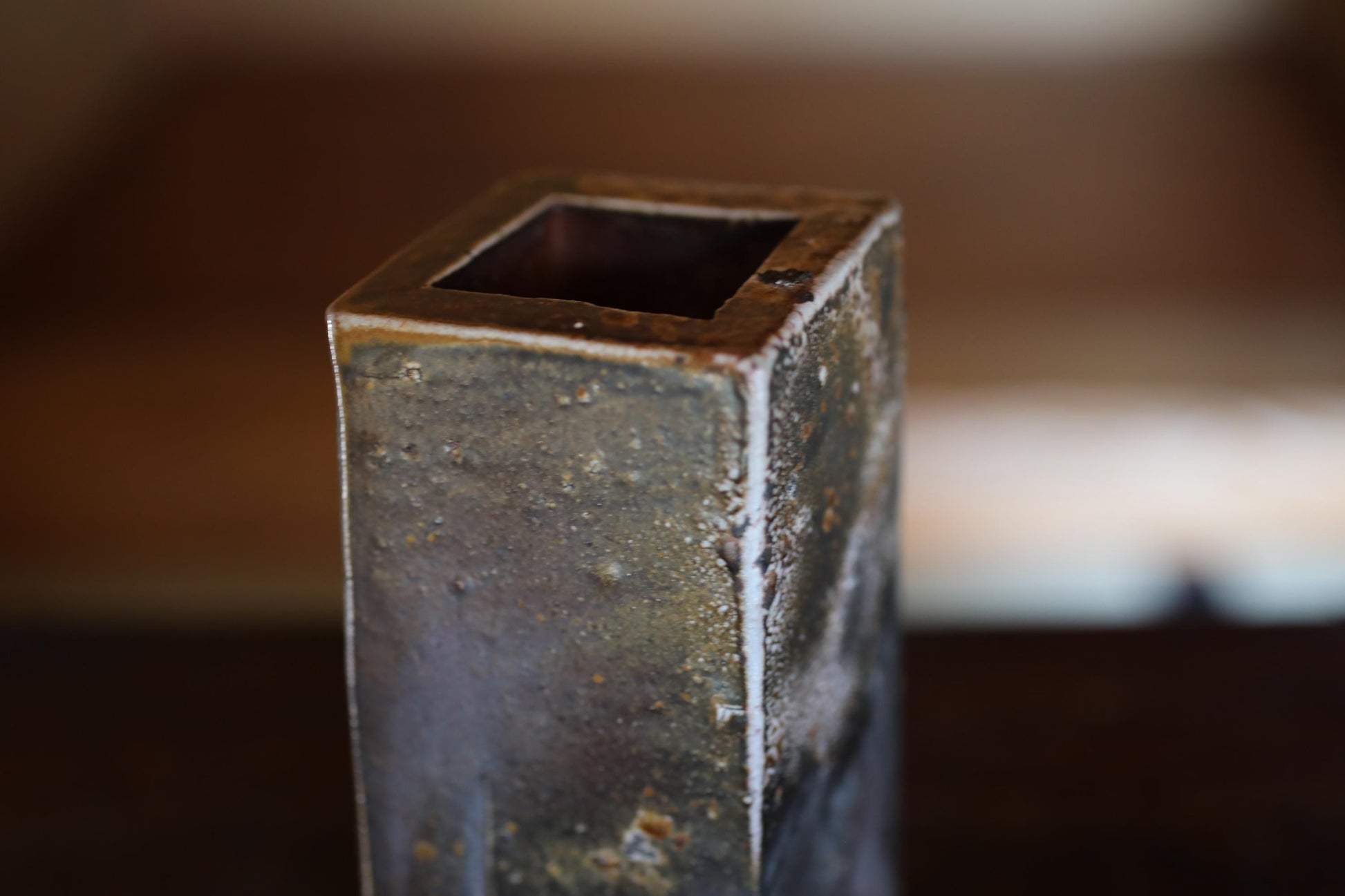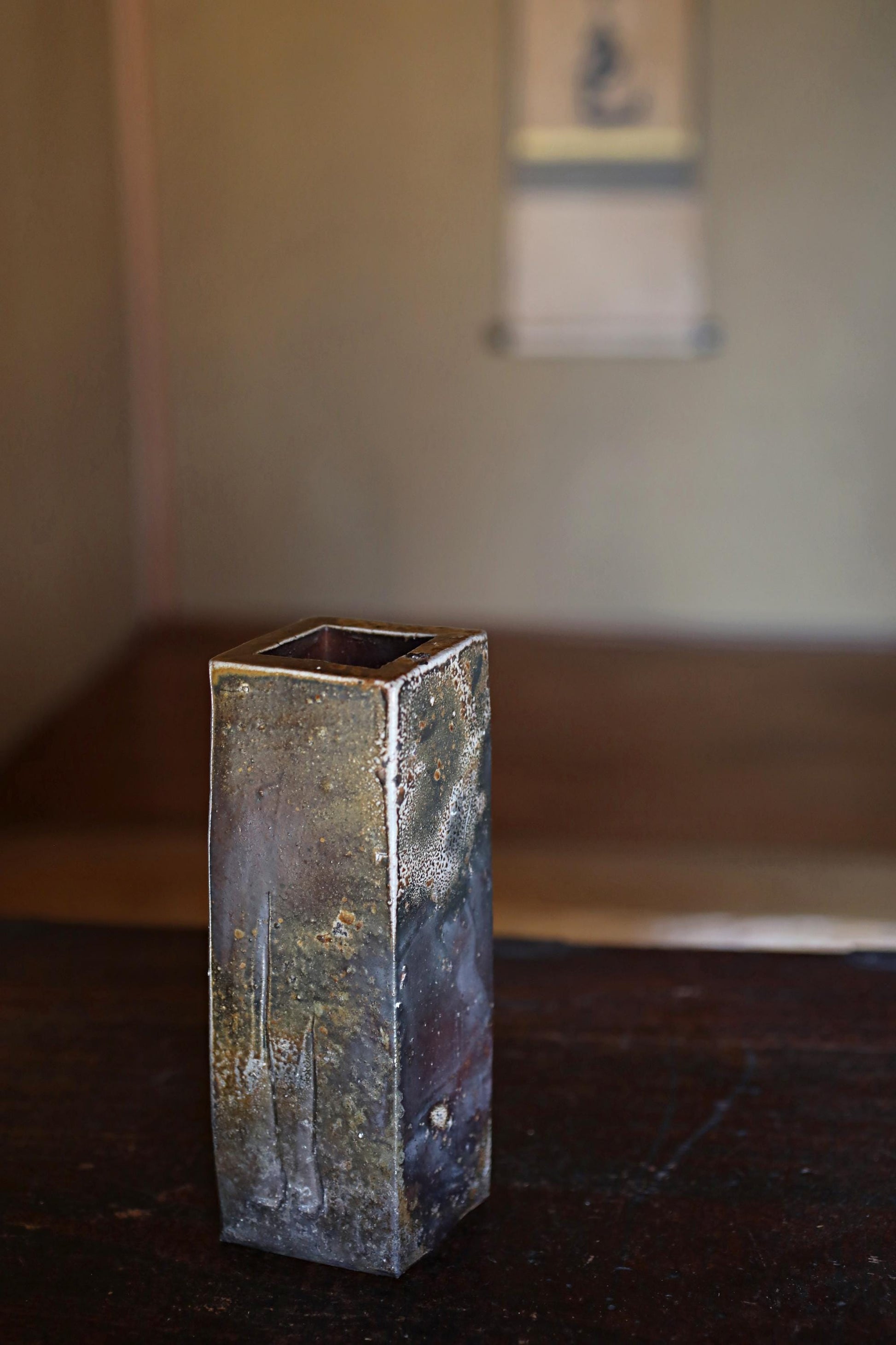 Japanese vintage vase "BIZEN ware" pottery flower vase, rhombus tube shape with a signatured wooden box H7.7xW3.5in/ 19.5x9cm