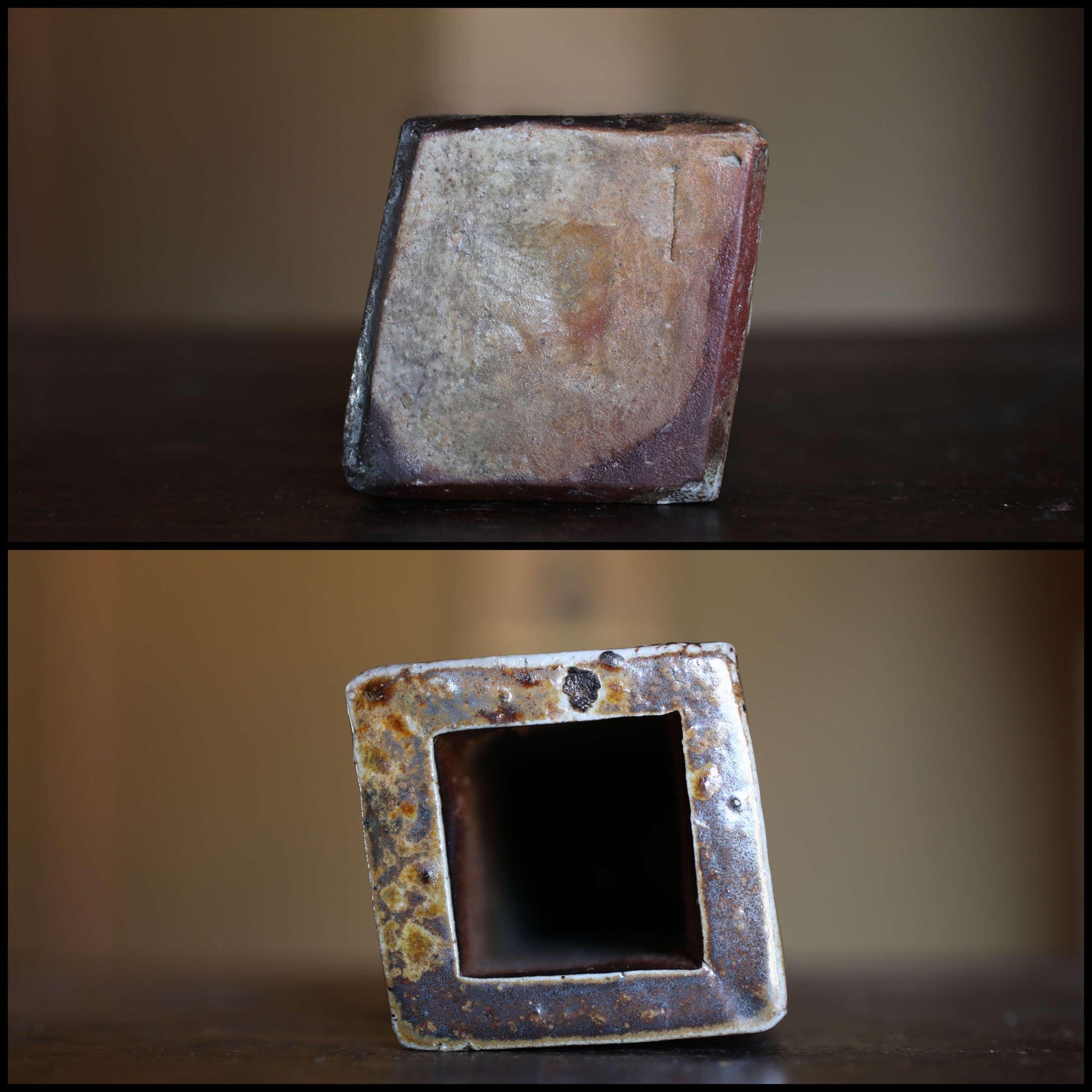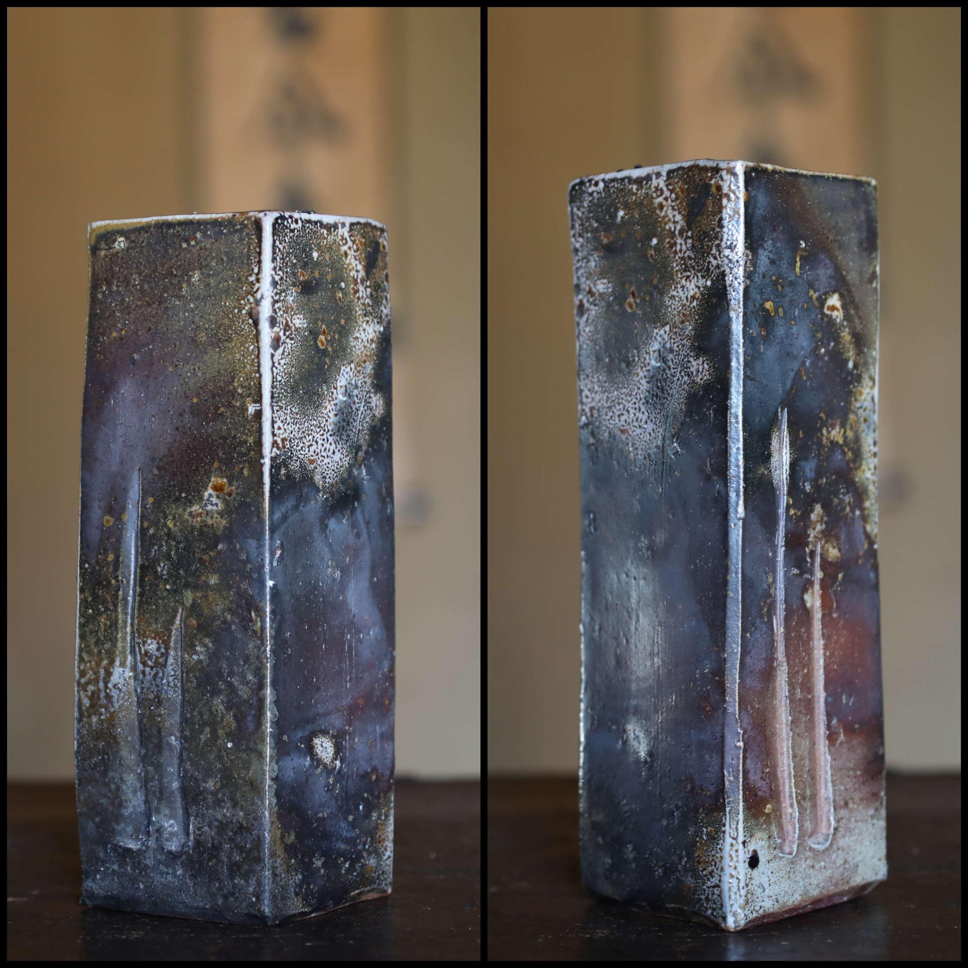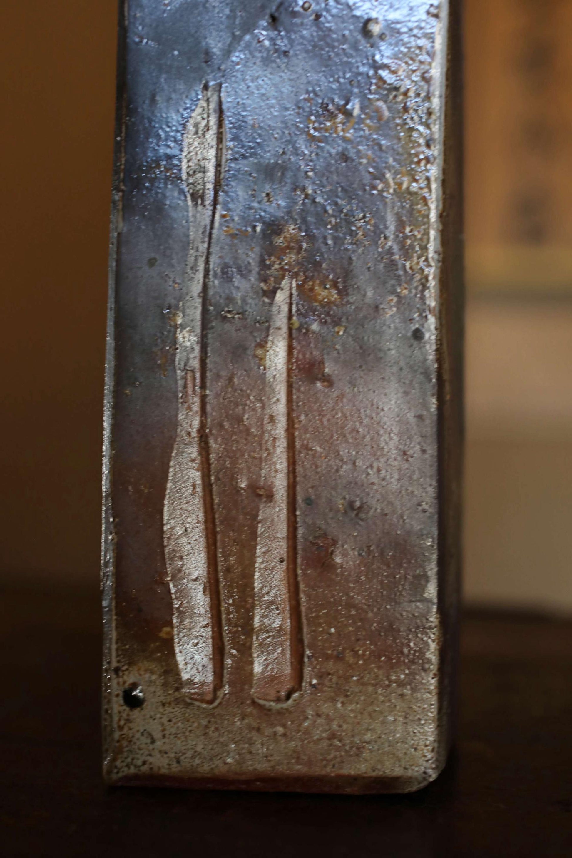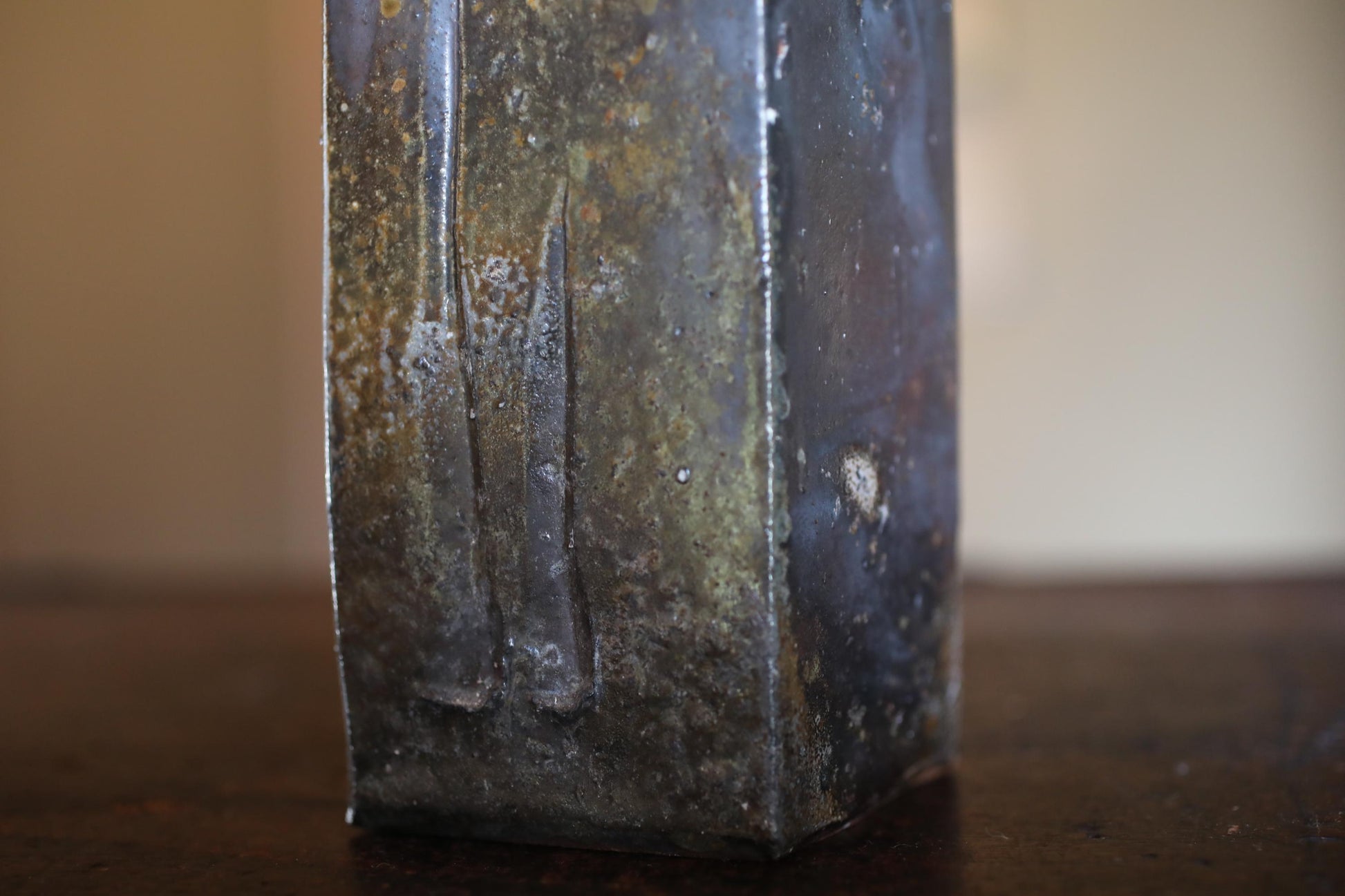 Japanese vintage vase "BIZEN ware" pottery flower vase, rhombus tube shape with a signatured wooden box H7.7xW3.5in/ 19.5x9cm