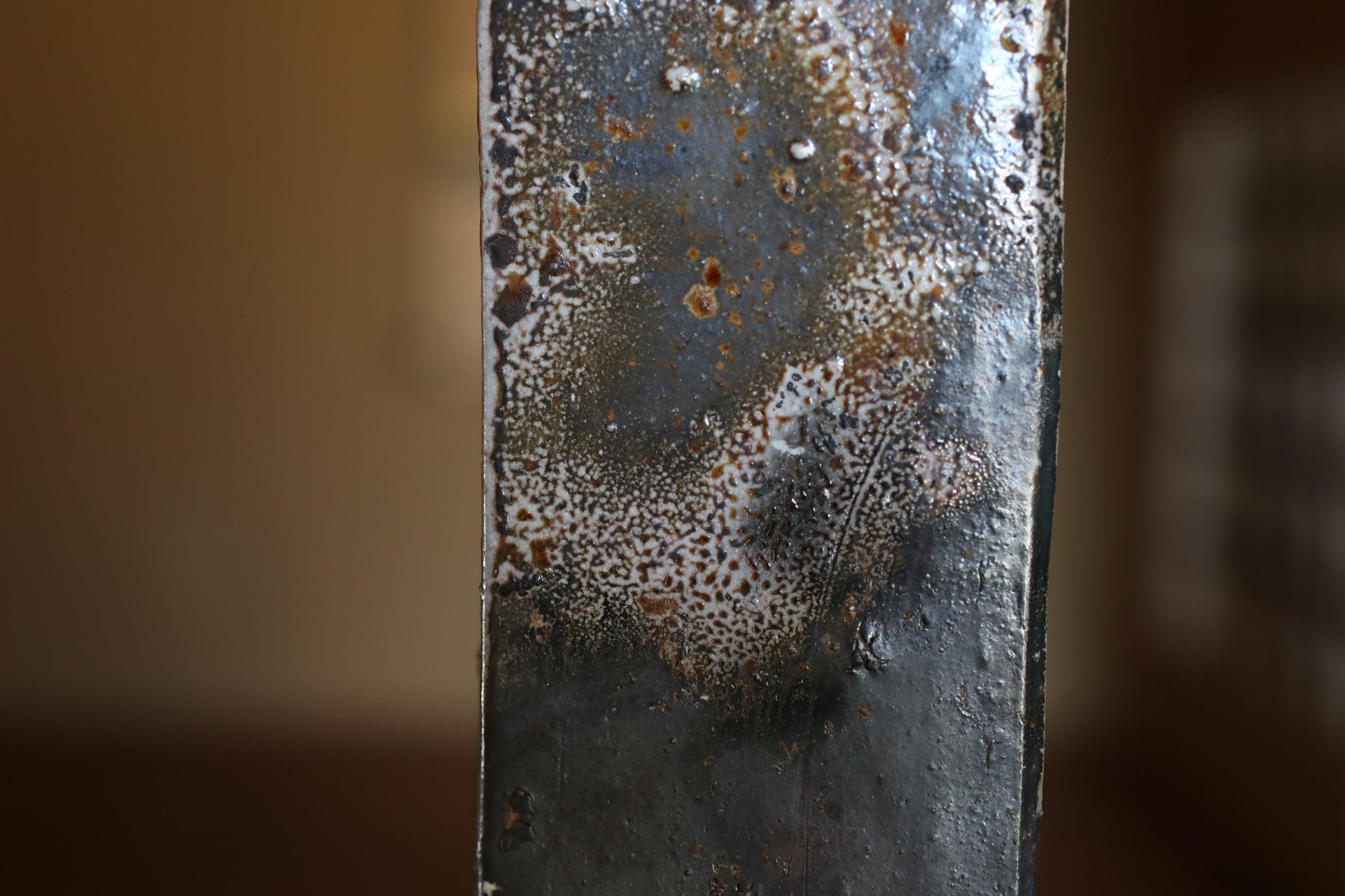 This vase, crafted around the 1960s, possesses a design that seamlessly blends vintage and modern aesthetics, making it a versatile piece that complements any space and harmonizes with any flower arrangement. The rhomboid shape, rather than a rectangular prism, lends a light and airy feel, while the glaze applied to all four sides transforms in the kiln, creating unique expressions that resemble an abstract painting. The bold spatula marks on two sides evoke the image of plants just beginning to sprout from the earth.