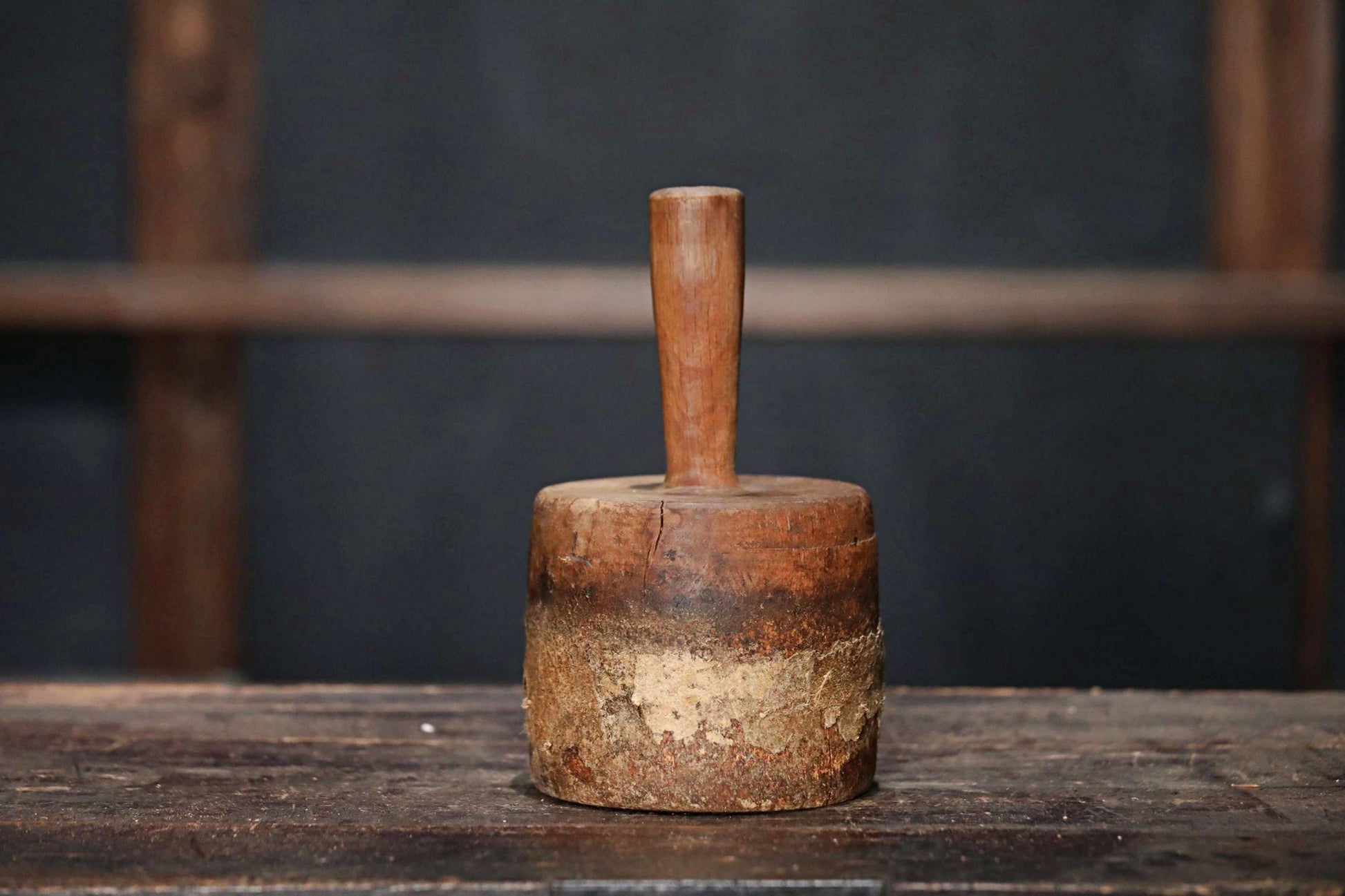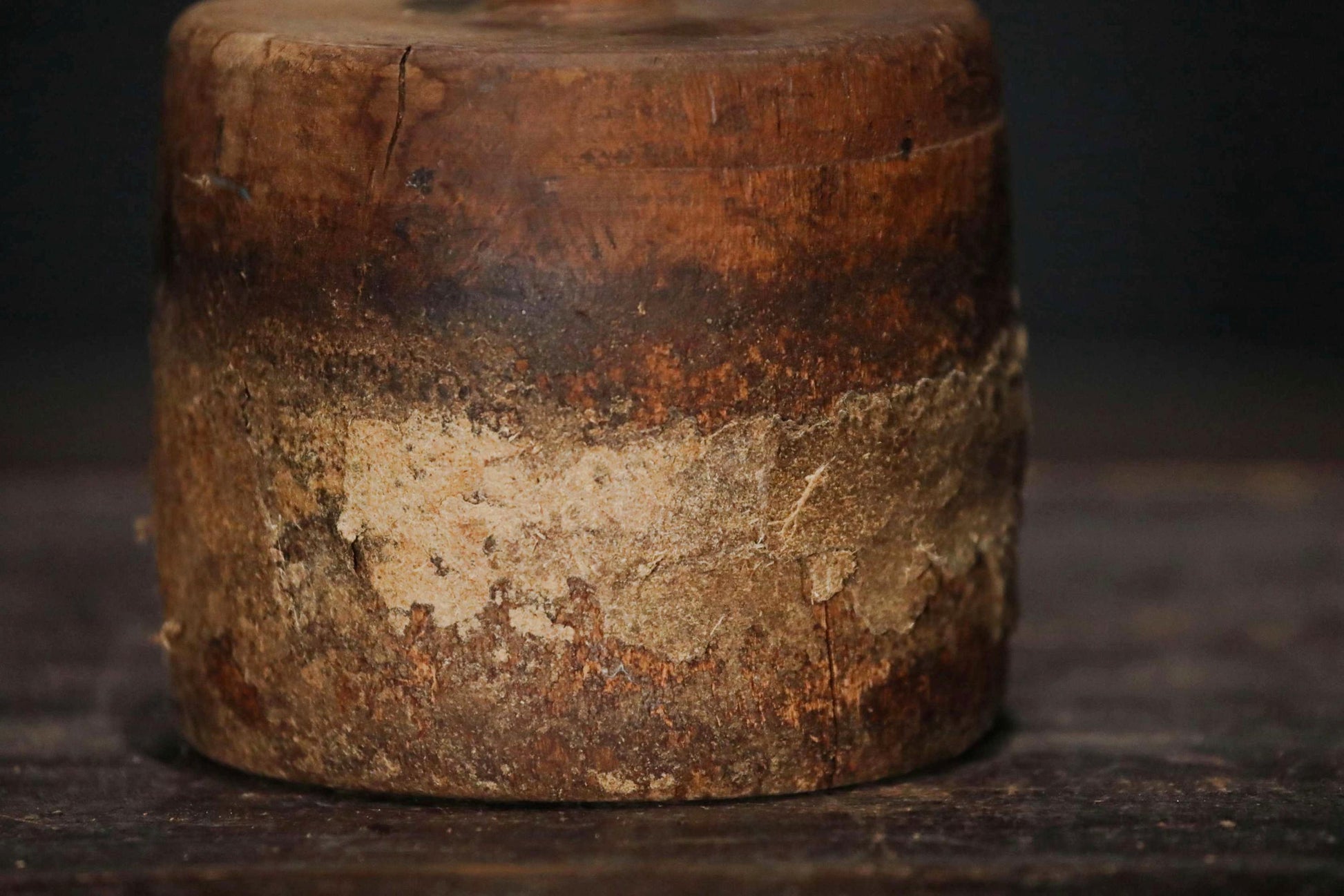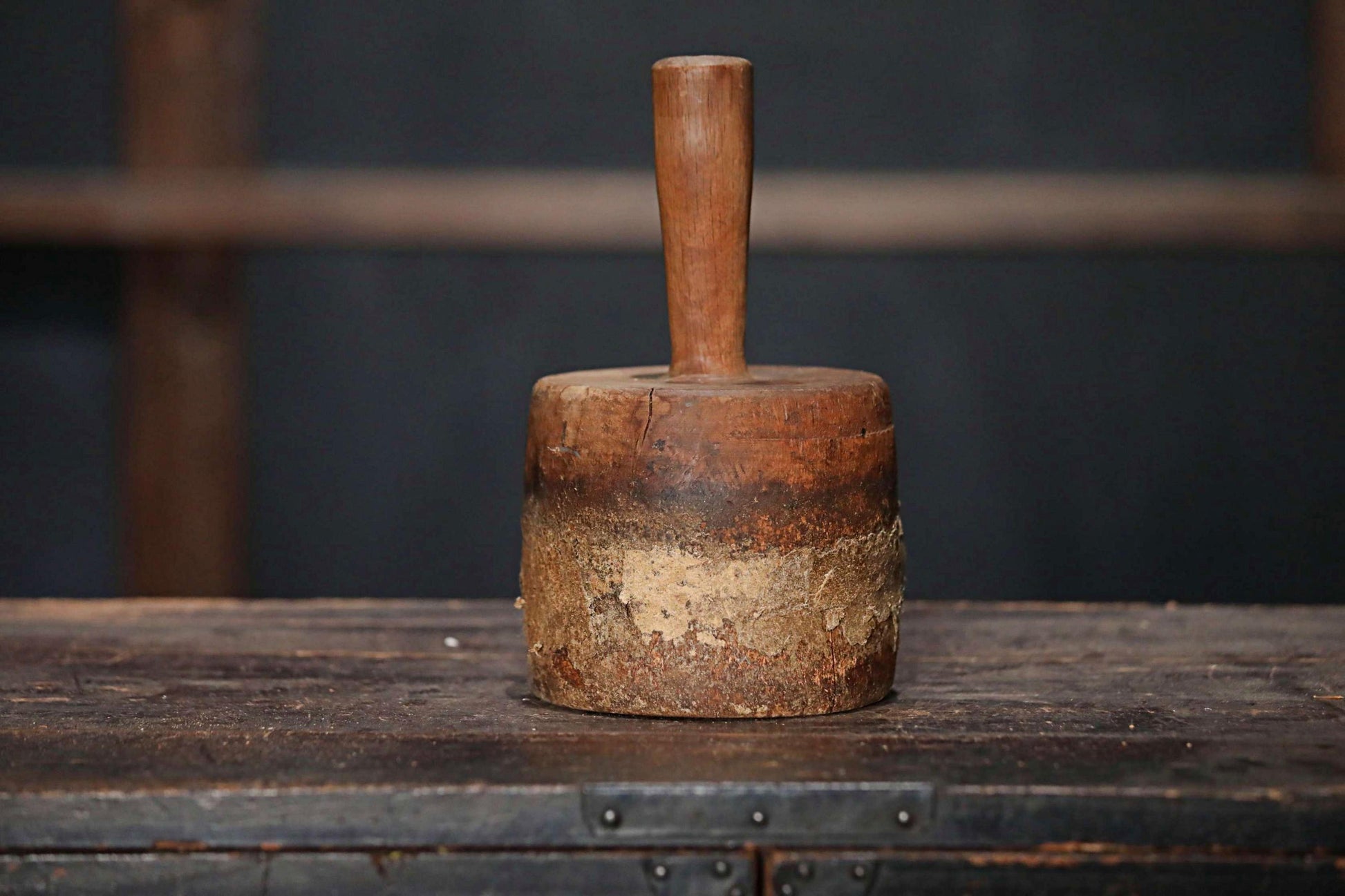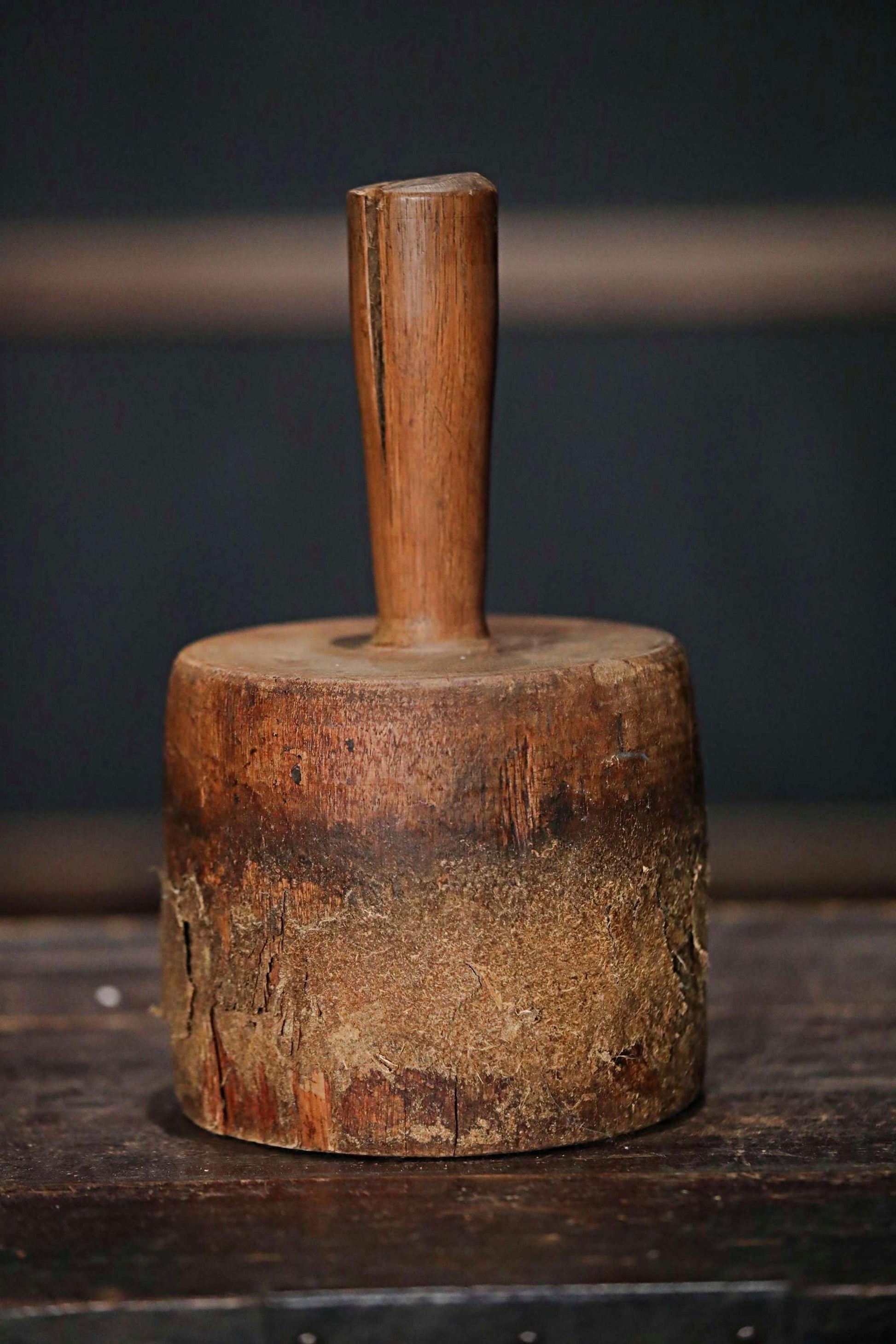 A Japanese tool with a cool, used look and feel, this is called a straw 砧 Kinuta. It is a tool originally used to beat straw to soften it.