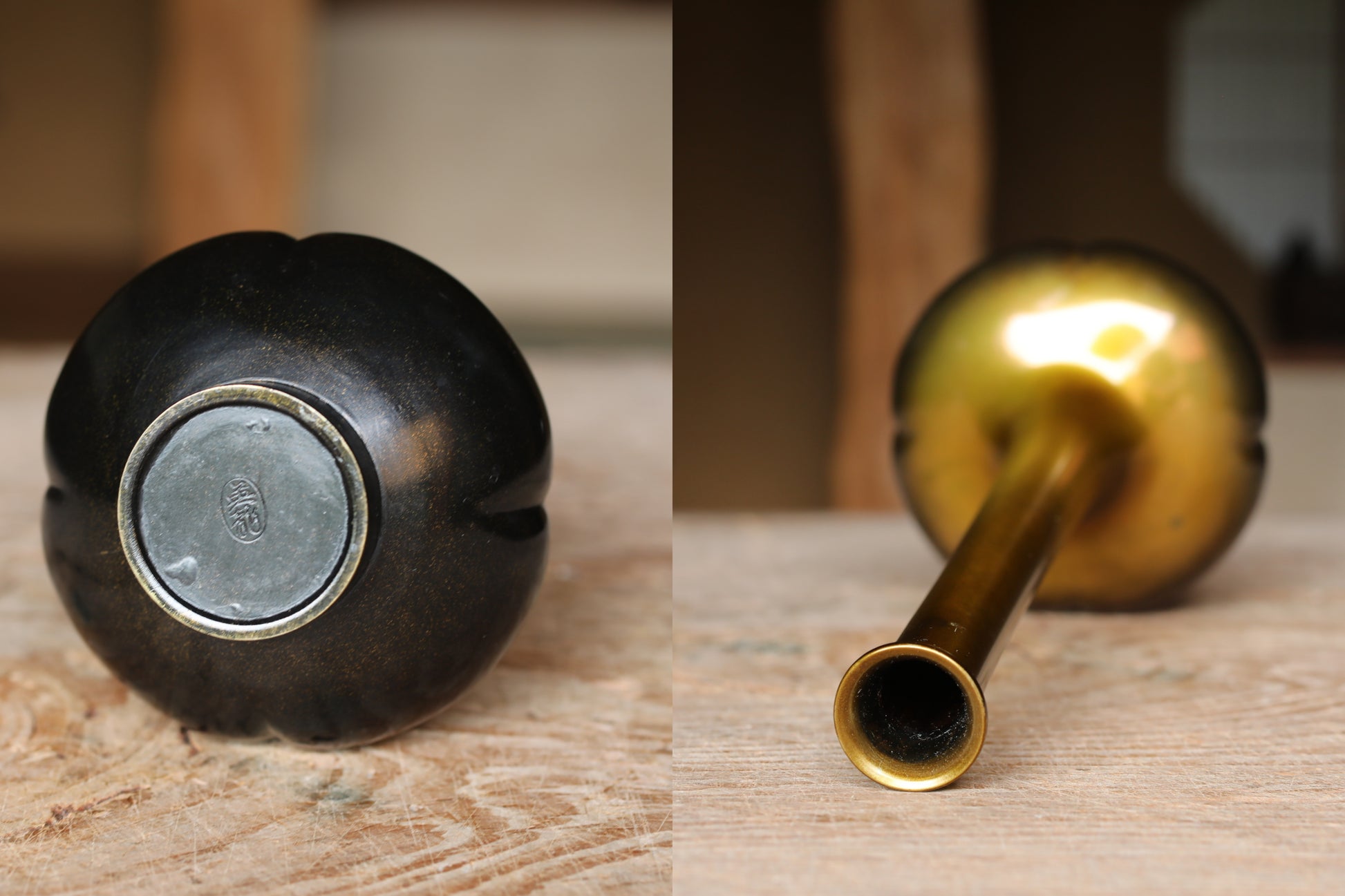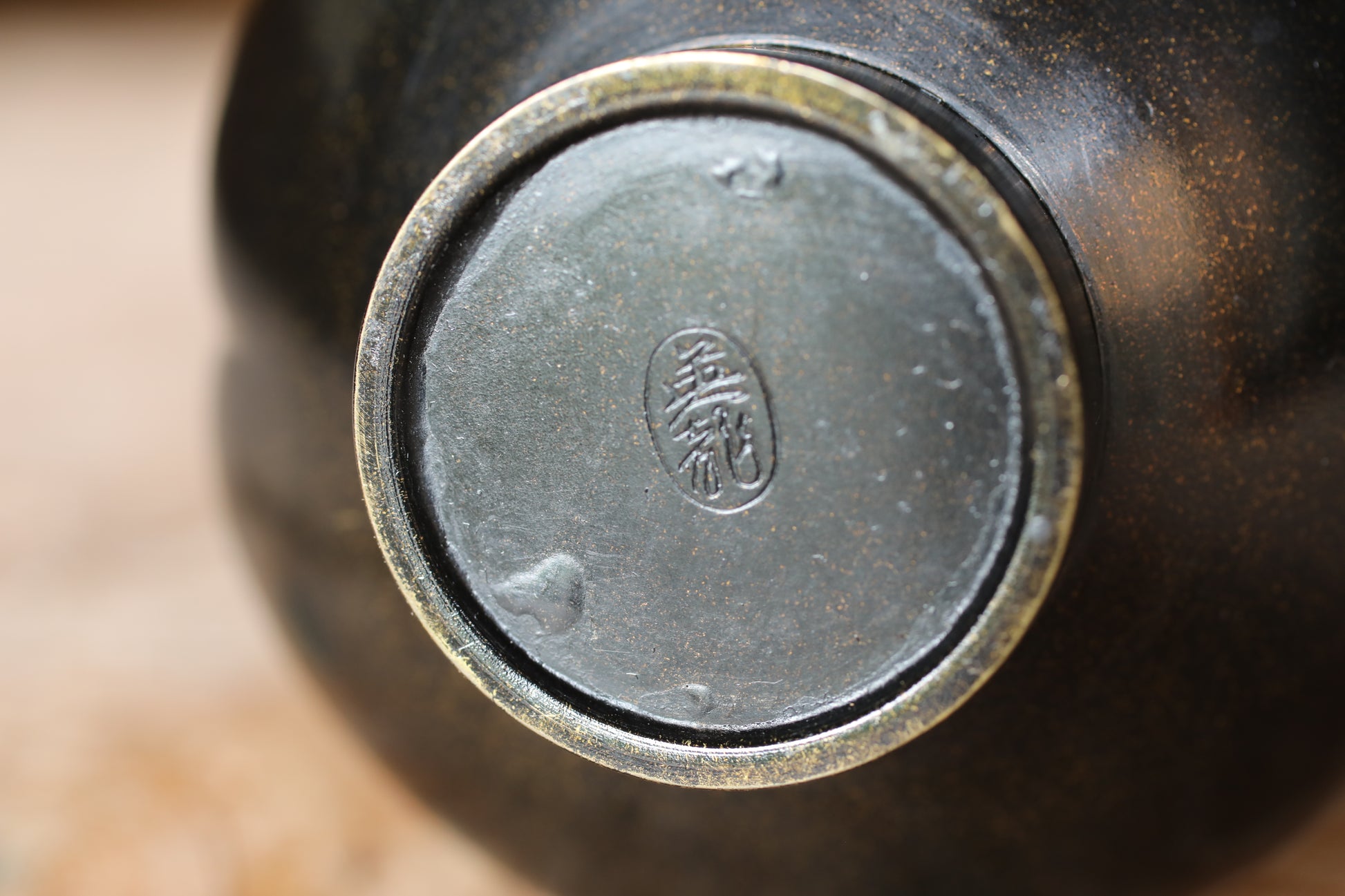This very beautiful copper vase was made by 英龍 Eiryu and his signature is found at the bottom. This form is known as Boke style (Quince Flower Shape). It gets its name from the body, which is gently divided into four vertical lobes, resembling the plump bud of the flowering quince. The voluminous, low-slung girth provides a sense of stability and a low center of gravity, while the neck rises straight and slender, evoking the delicate yet powerful growth of a plant's stem.