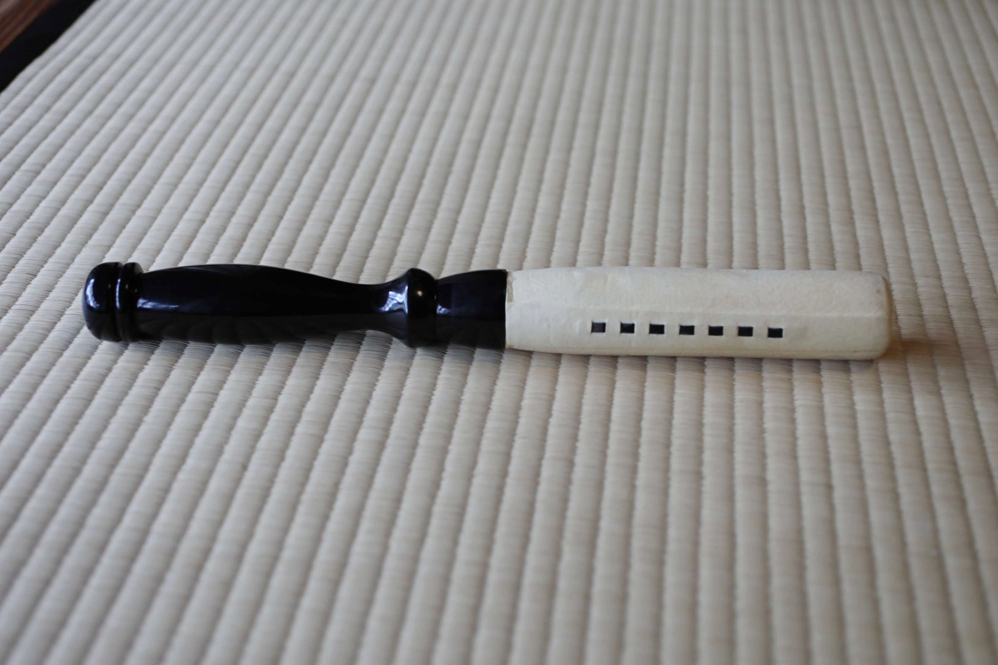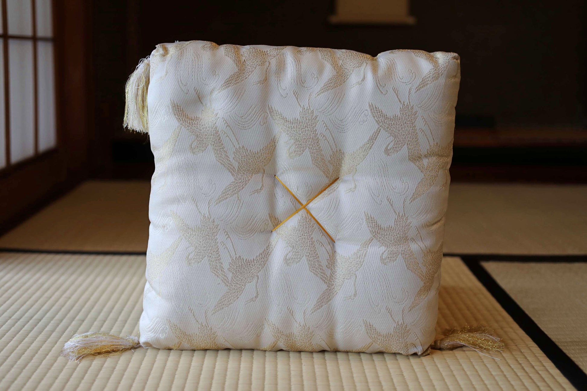 It comes with a silk cushion featuring a crane design in gold embroidery and a floral pattern, along with a wooden, lacquered, and leather-wrapped rod, ready for immediate use. The rod is in good condition and has a resonant presence when struck against the floor.