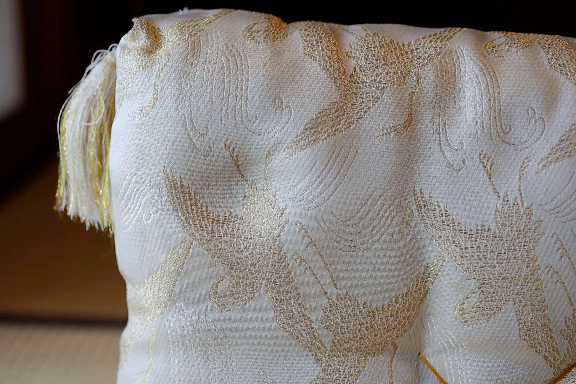 One tassel is missing from the cushion.
