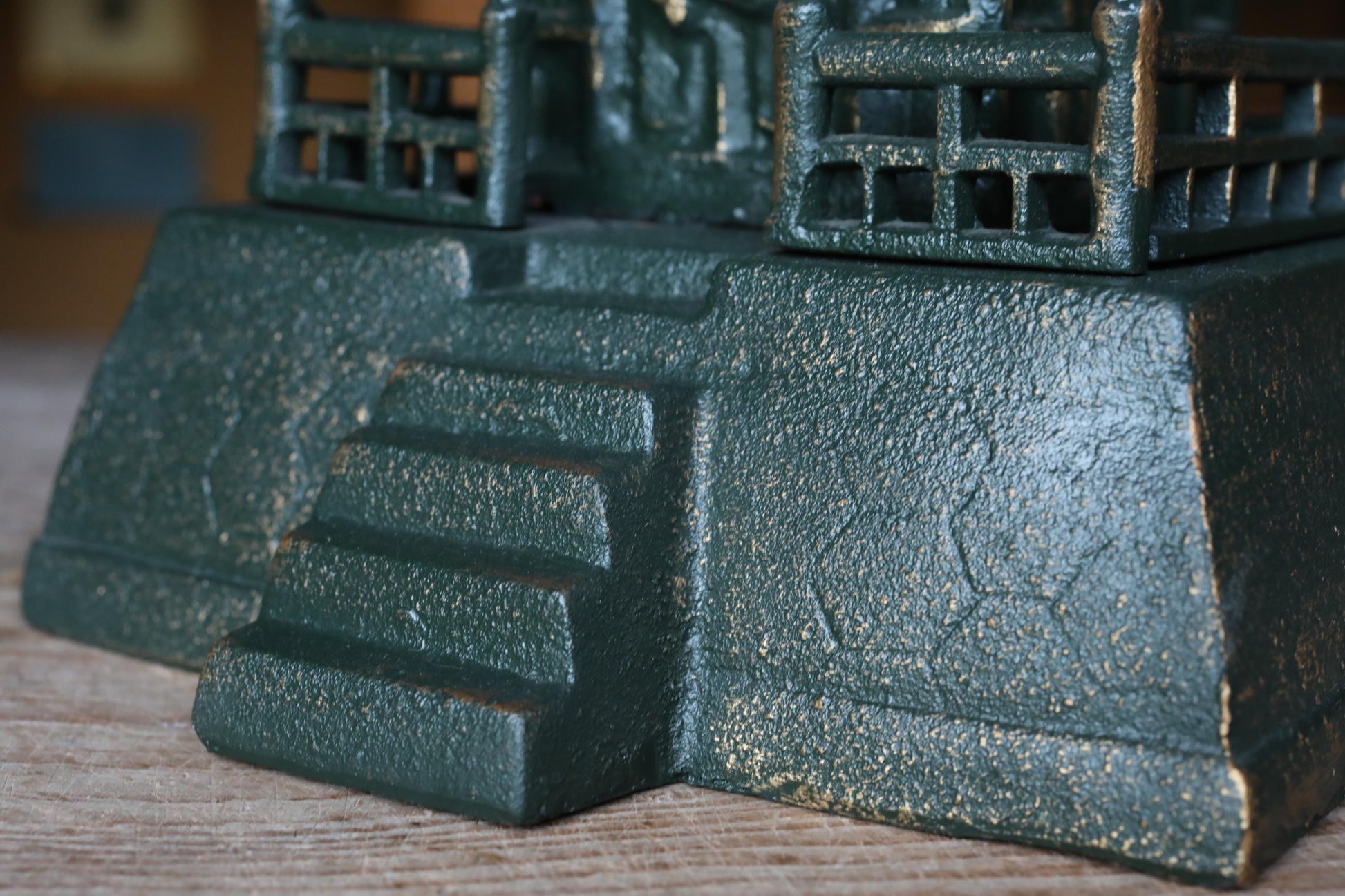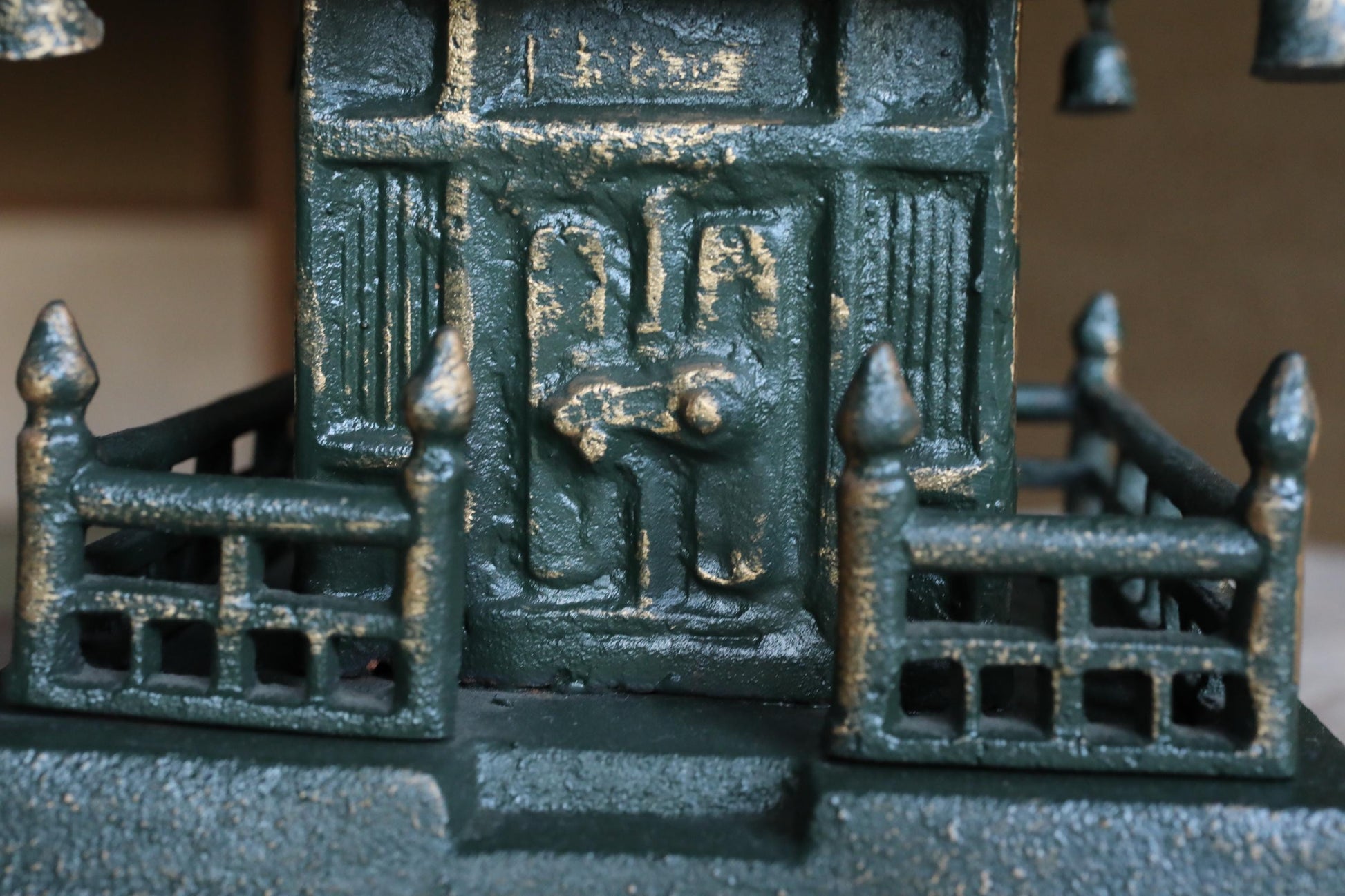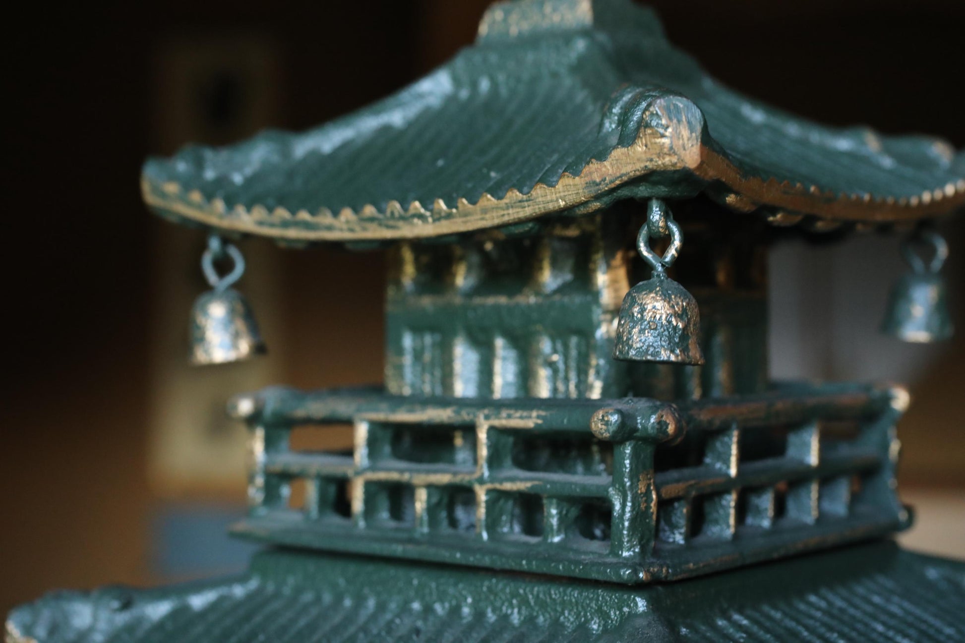 This is a 五重塔five-story pagoda made of cast iron. It is painted green.