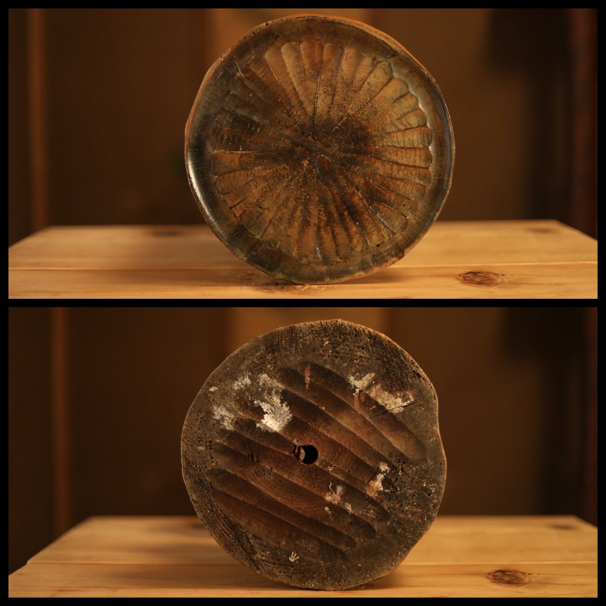 Each work leaves different impression. Some look horrific, some looks charming. This work would give lovely one, a small bear looks up with his hand pushing salmon down on the ground. In spite this motif if popular, the artist made this unique by putting it between two slices of wood whose cross-section looks like an orange. This helps it to be pedestal or kid’s chair.
