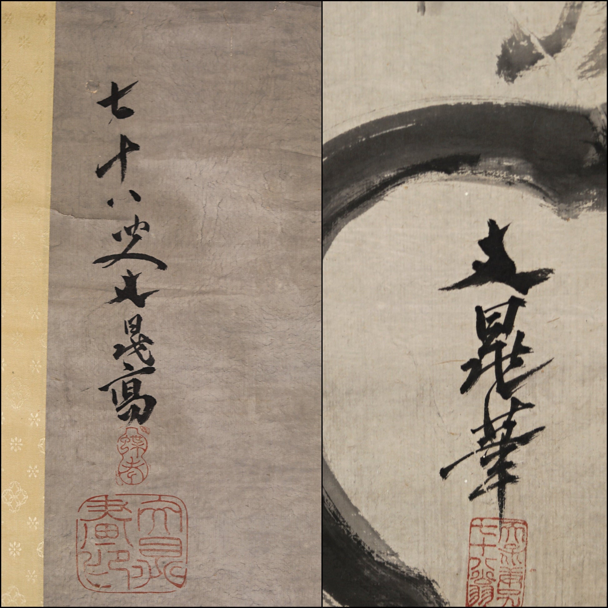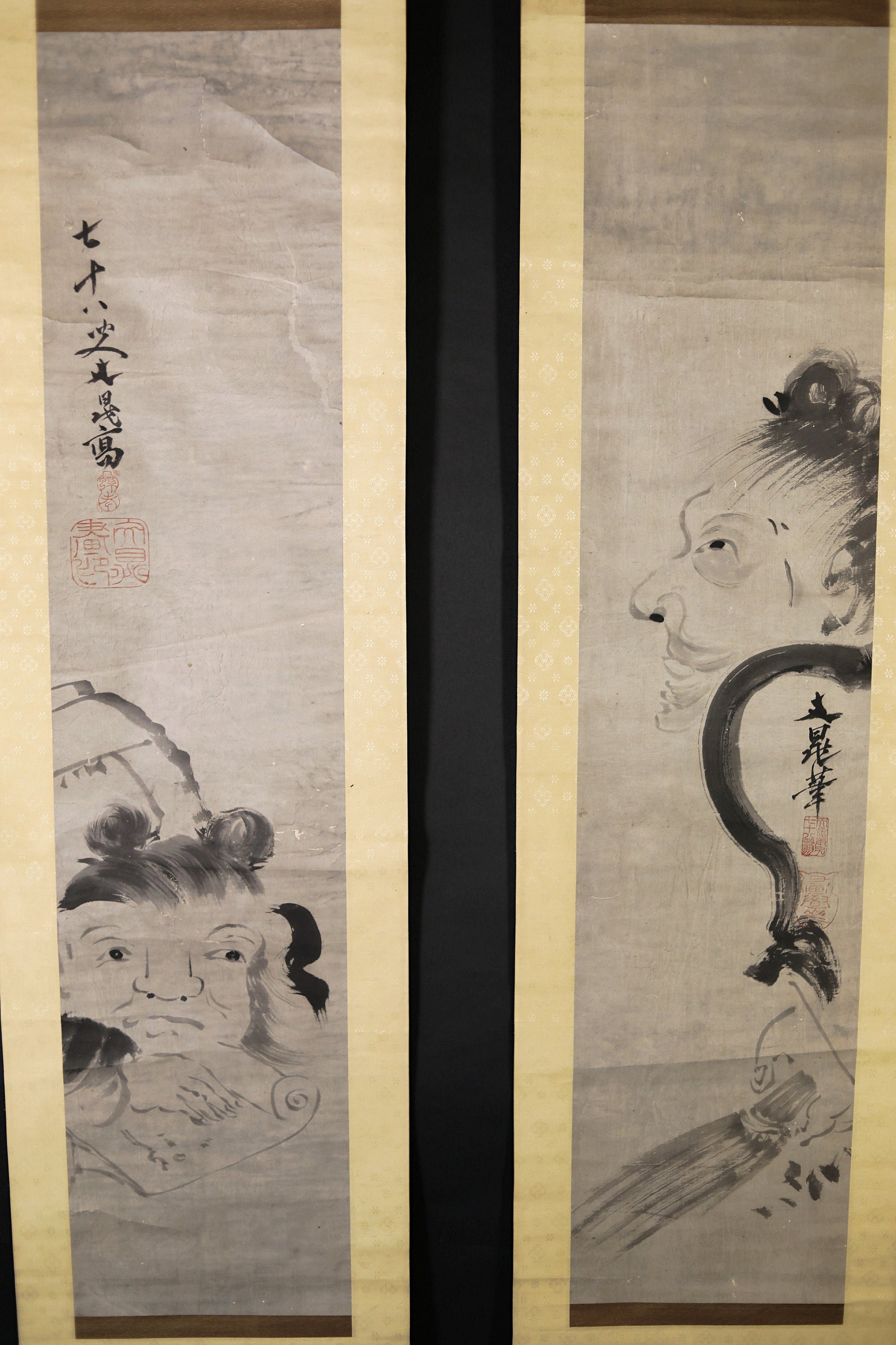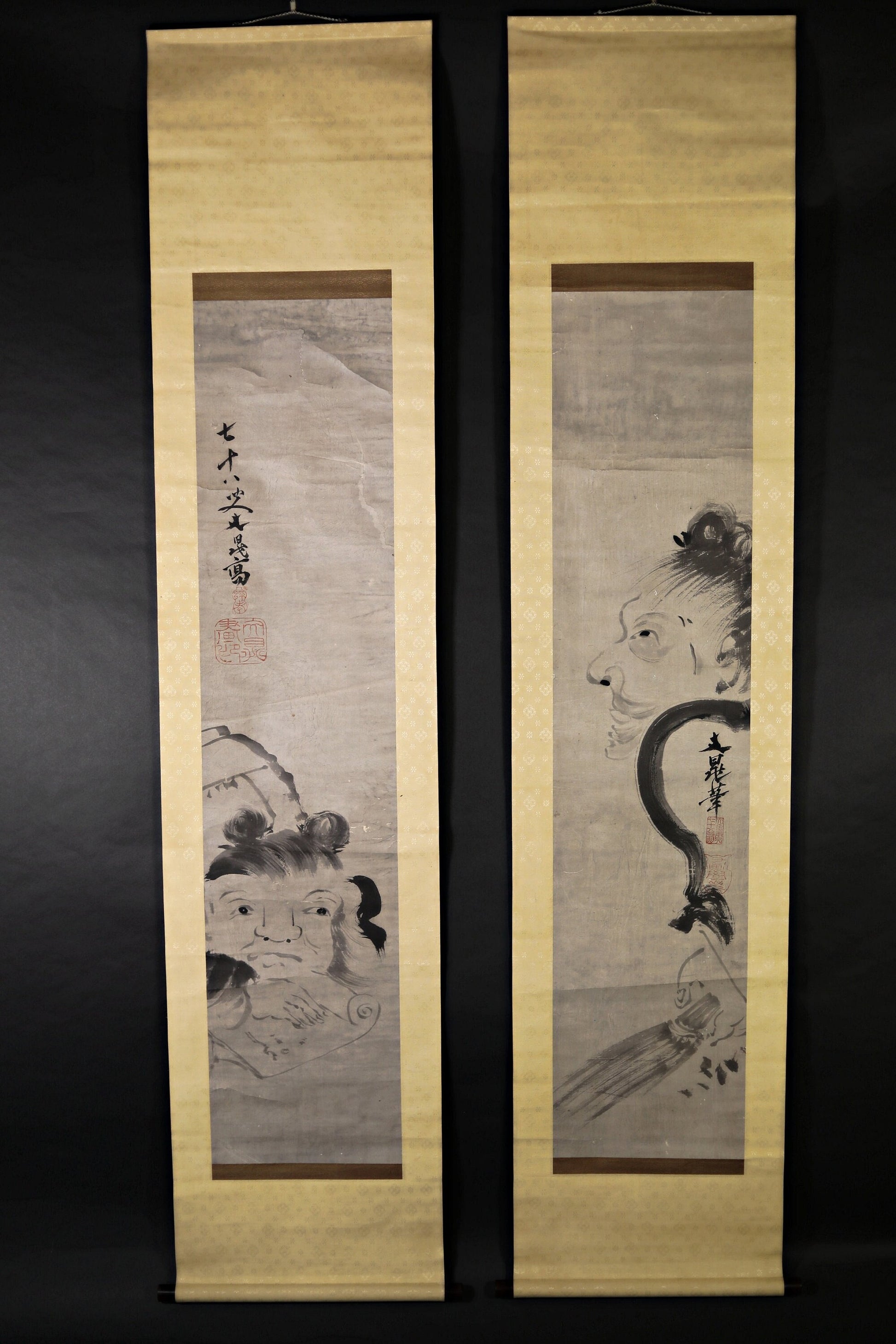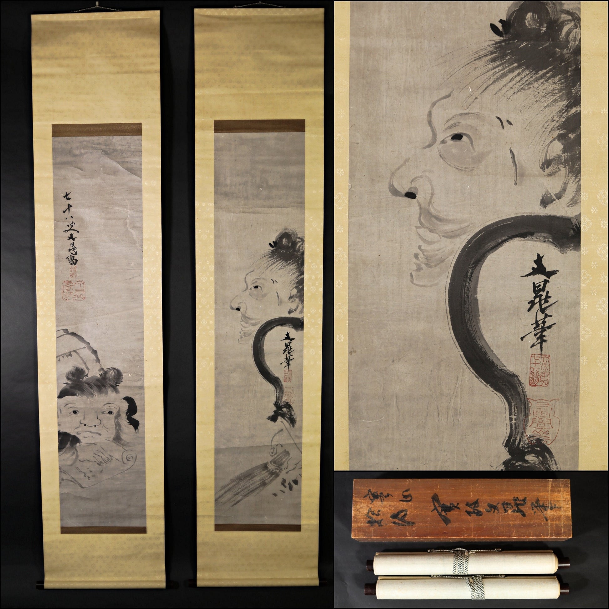 Pair of Japanese antique ink painting scroll Zen Monks 谷文晁, ink and wash hanging scroll Kakejiku with BOX 1900s Kanji sign H74.8in/H190cm