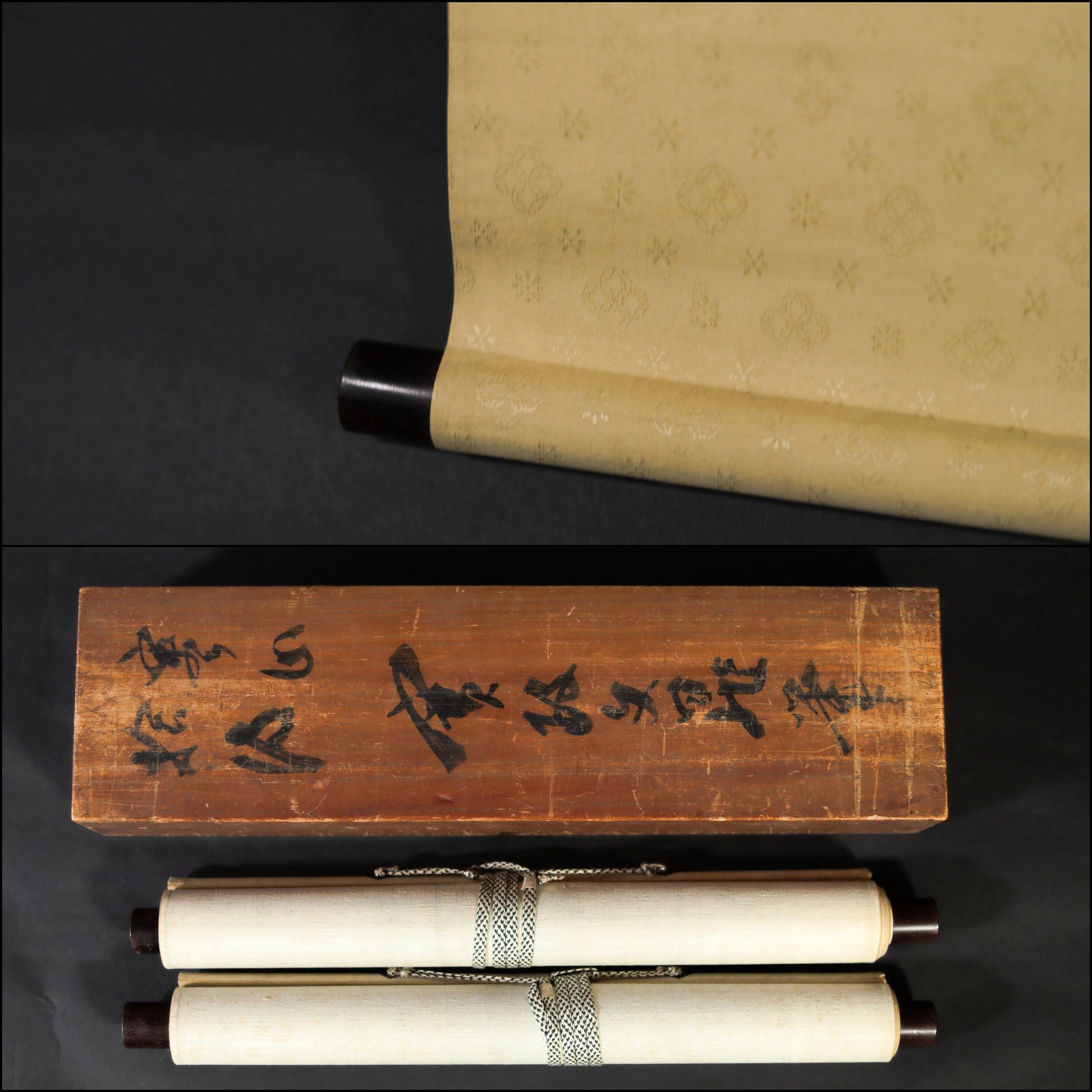 The paper itself has stains, wrinkles, and small holes. However, as a whole, it is clean and can be immediately displayed and enjoyed. It comes in its original wooden box.