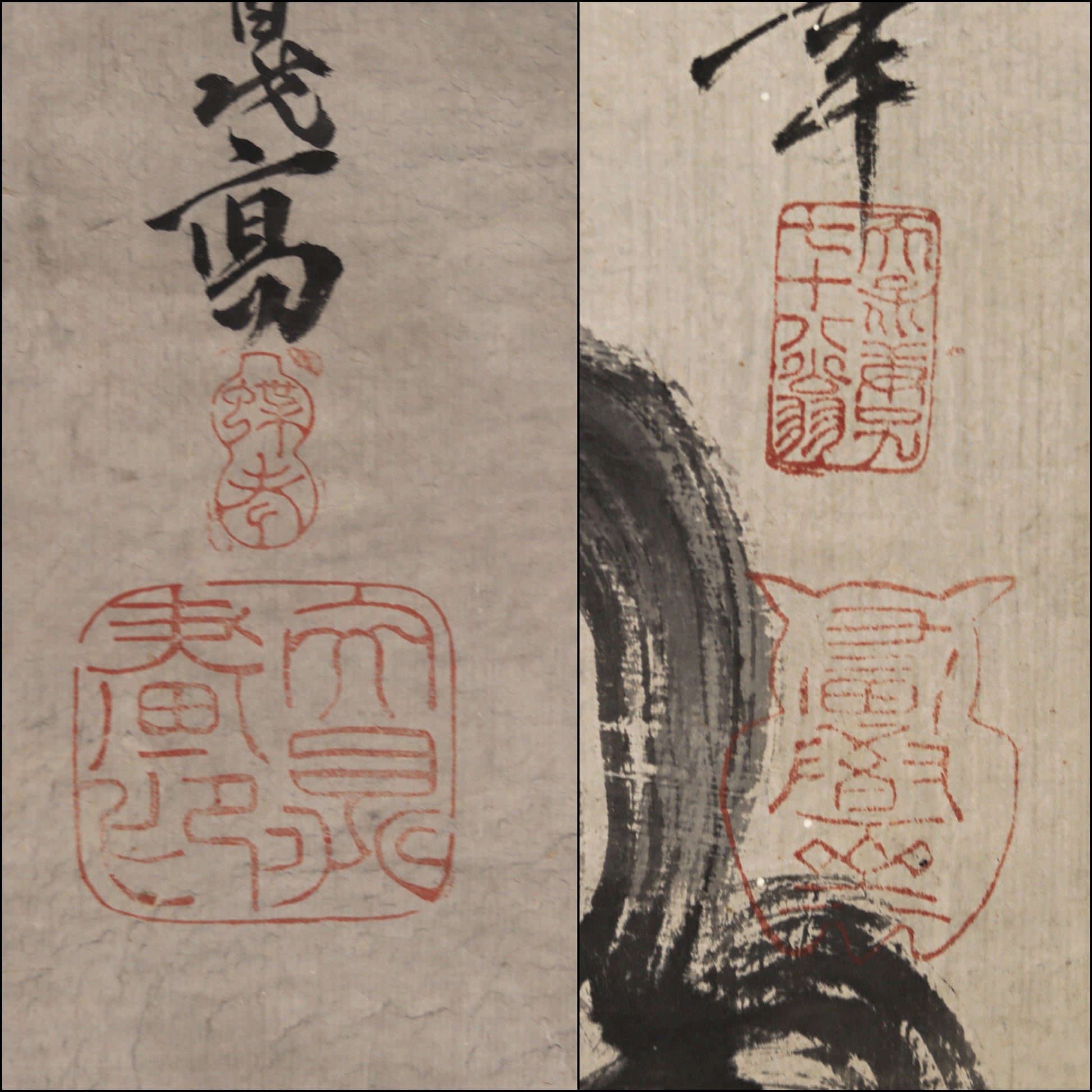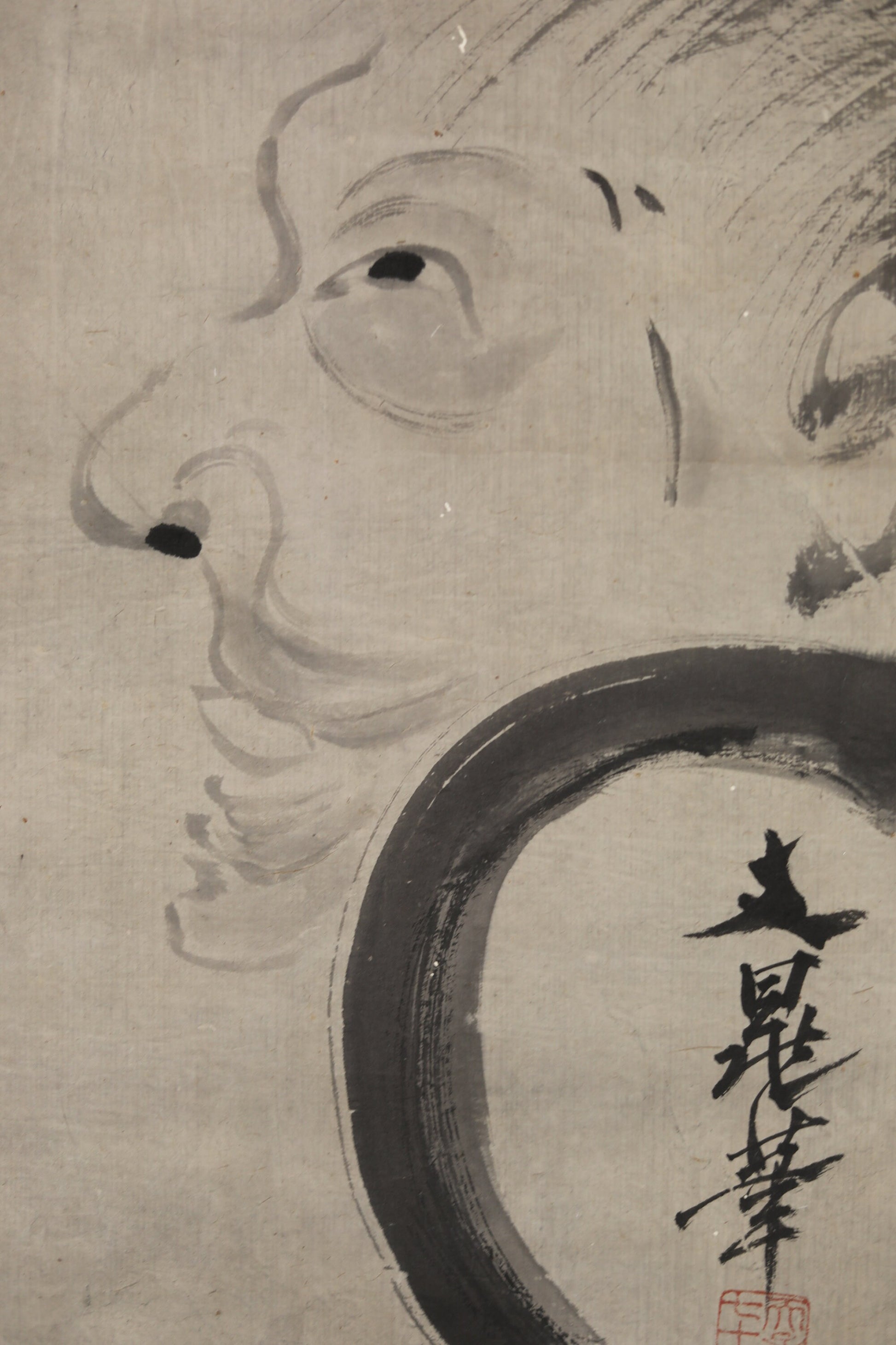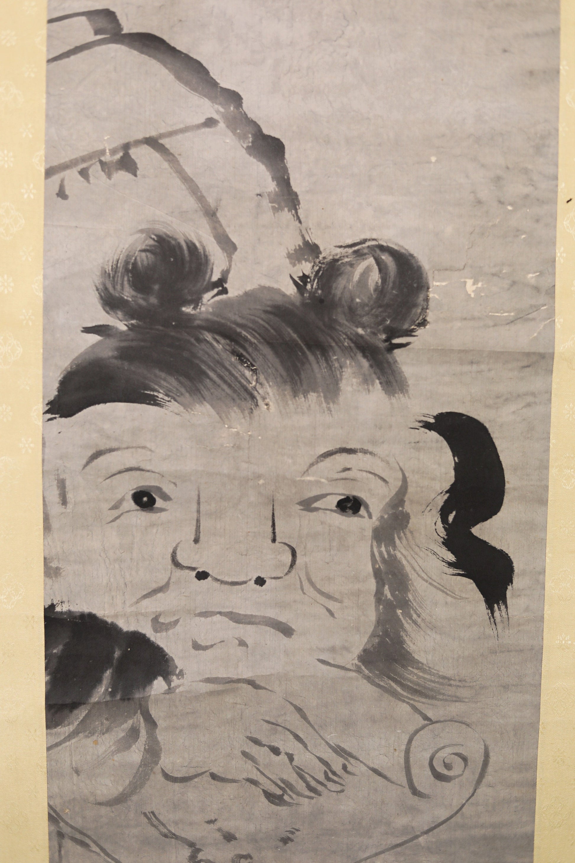 The subject of this painting is called Kanzan Jitokuzu (寒山拾得図), which is often used as a motif in Zen. The motif of this painting is the monks Kansan and Jitoku. These two monks from the Tang Dynasty in China were known for their eccentricities and were called incarnations of Monju and Fugen. Whether they even existed is a mystery, and many Japanese and Chinese painters have depicted them.
