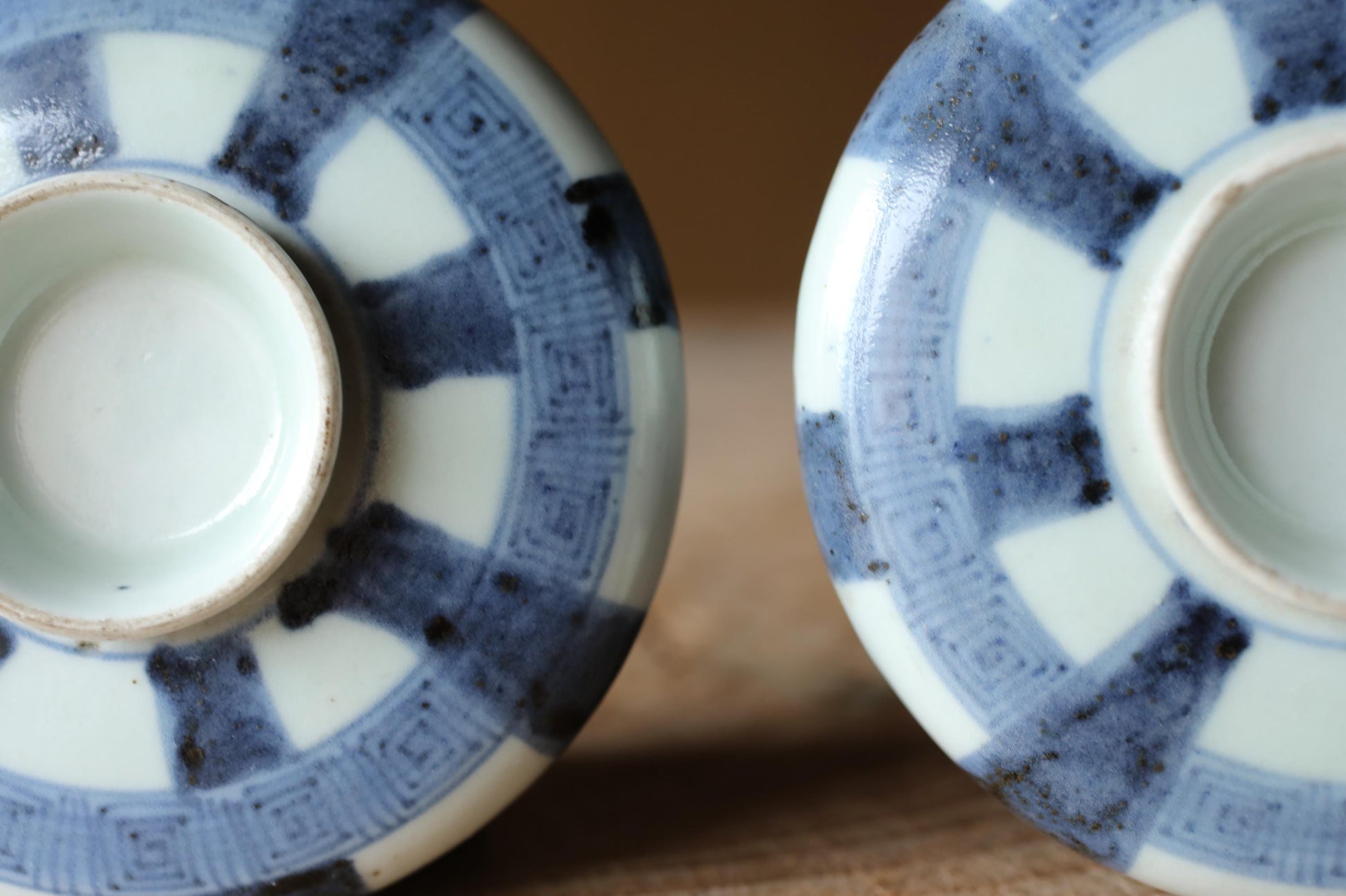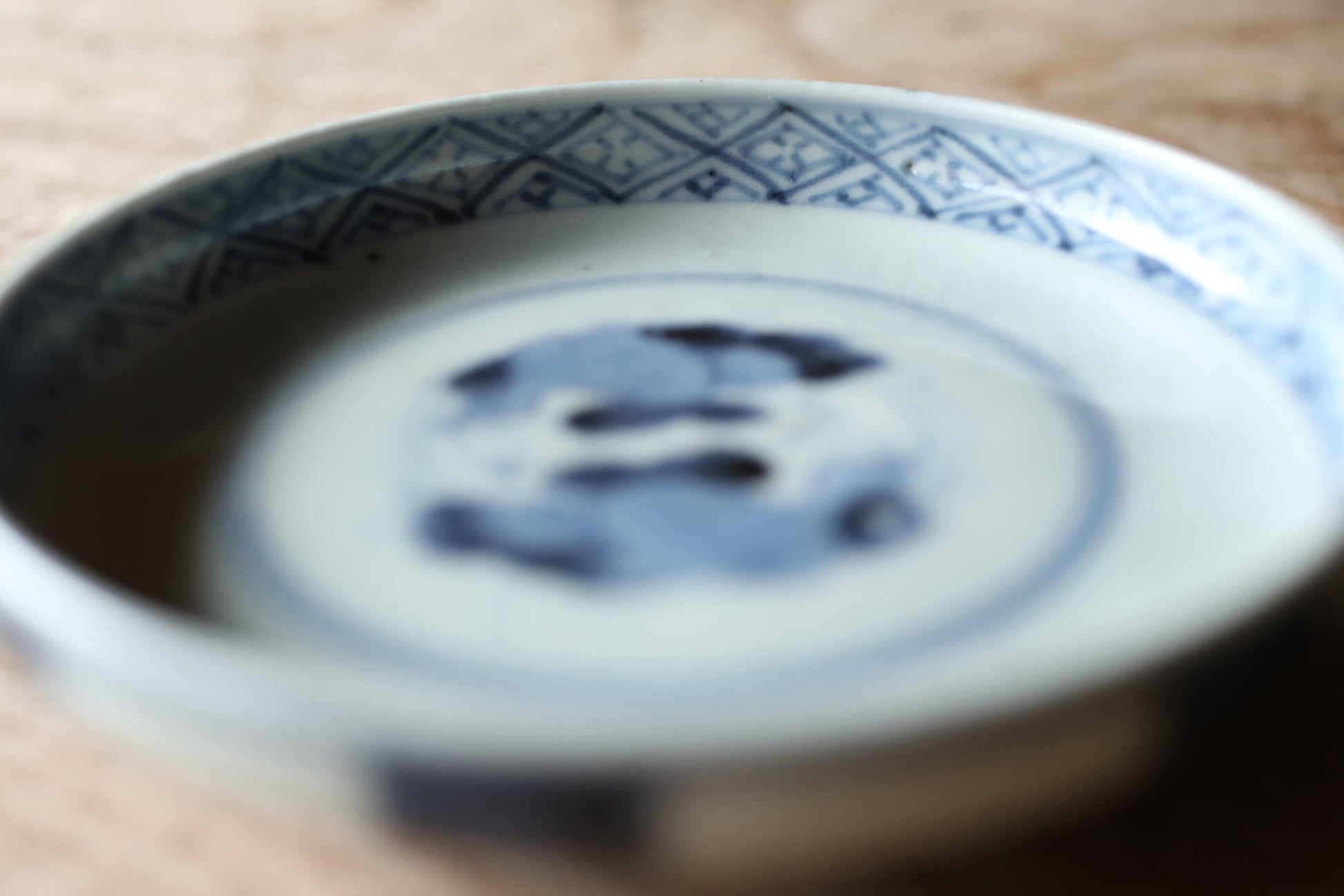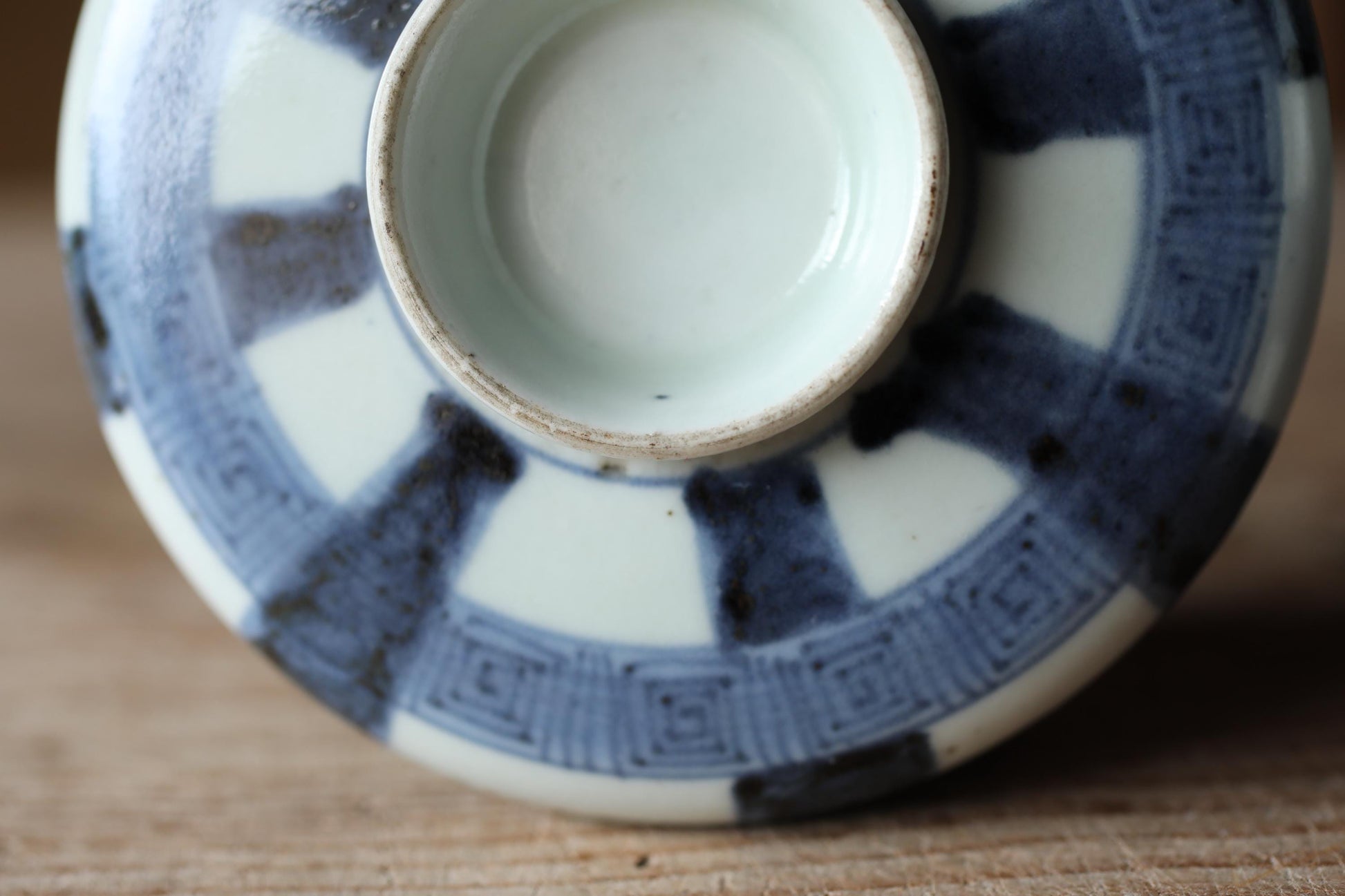The beautiful pale blue and white colors unique to old items are elegant and beautiful. The rim is decorated with a continuous pattern, and the back is carefully painted with a checkered pattern.