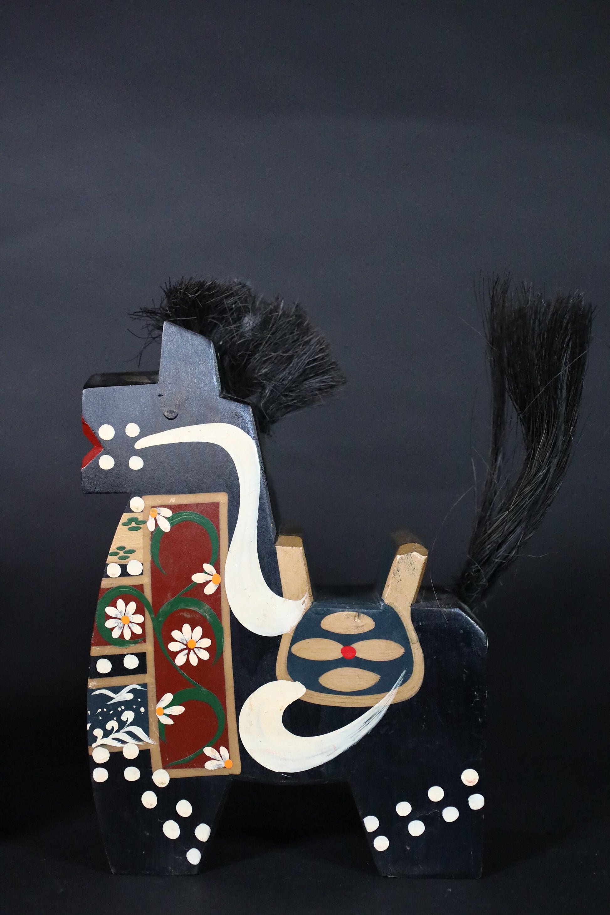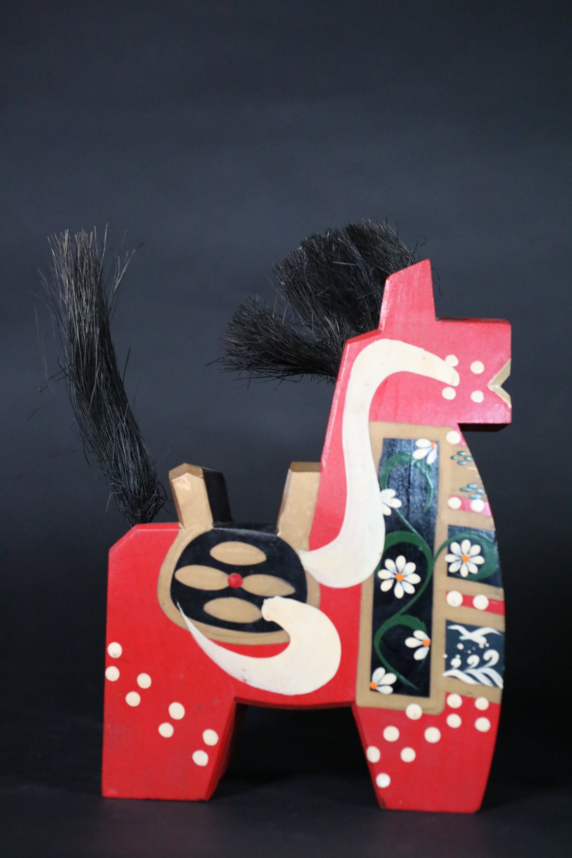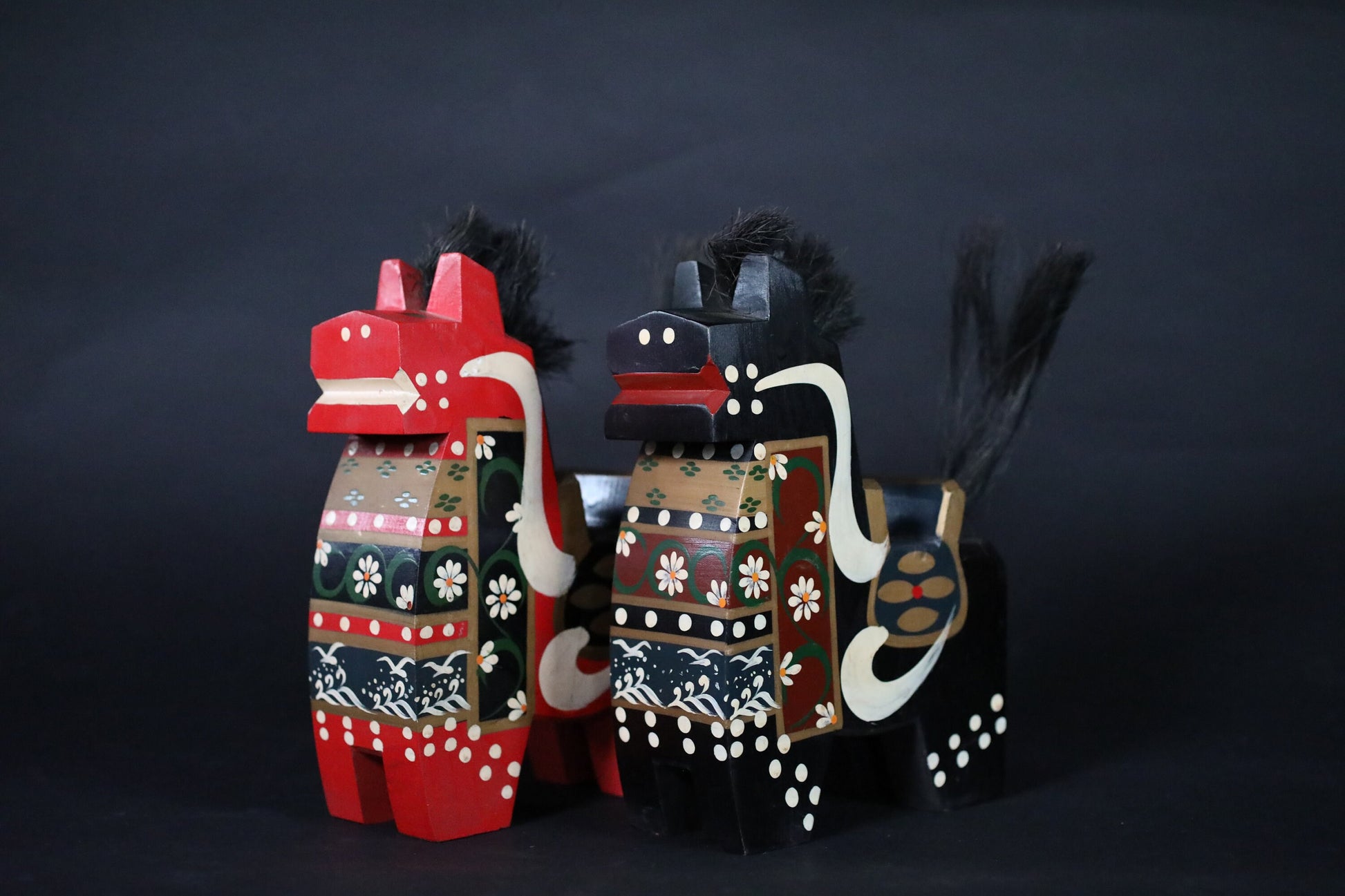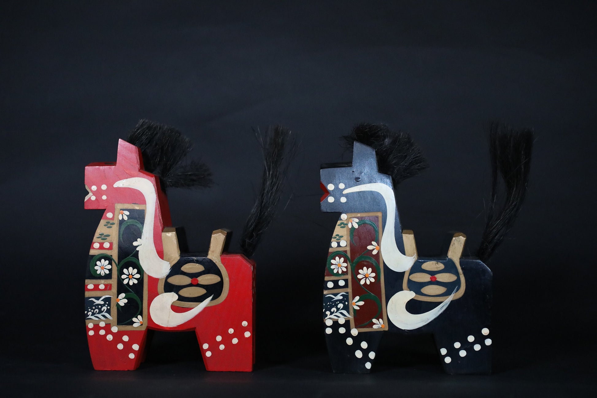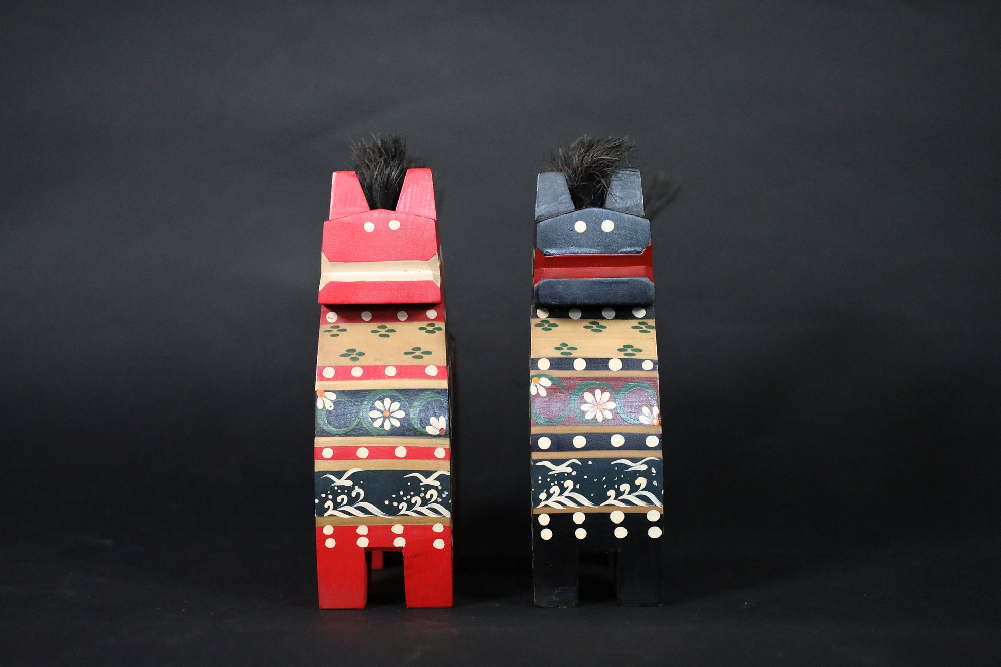 These are called 三春駒Miharu-koma. They are a local toy with a horse motif, and are unusual in that they are considerably larger than usual. The pair is very cute.