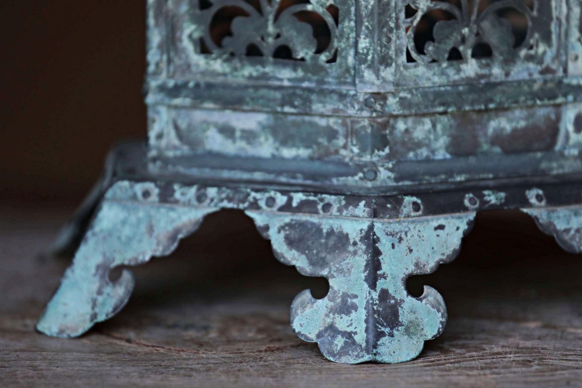 These beautiful lanterns are made of copper and have a large and very old atmosphere. This is called a hanging lantern. It is very cool with its large size and beautiful greenish-blue atmosphere of age. It is ready to use immediately.