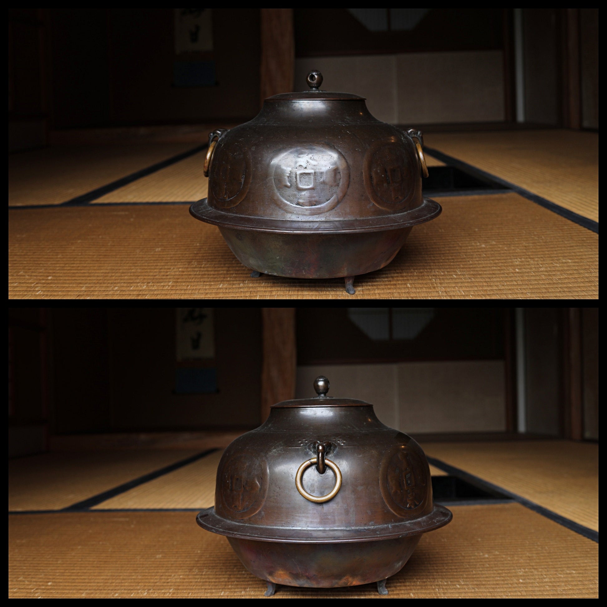 RARE! Japanese antique bronze kettle For Tea ceremony with handle with Japanese Kanji coins design 1800s W11.8in/W30cm