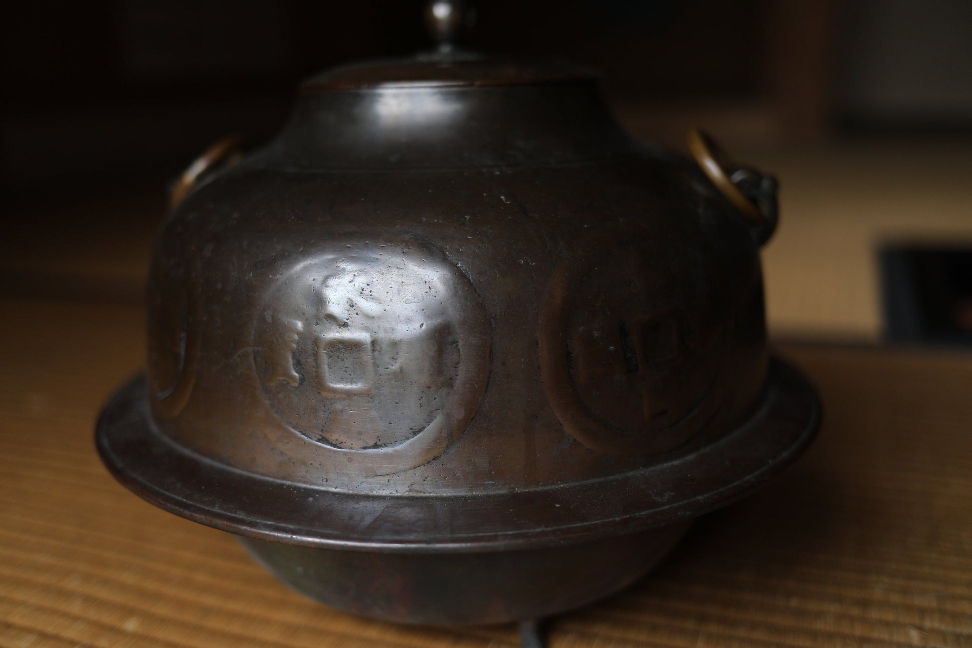 This is a tea kettle that has been used by tea shops in the mountains since the late Edo period. Used and polished for many years, this tea kettle has been cherished. It has a design of a coin with old Japanese kanji written on it.
