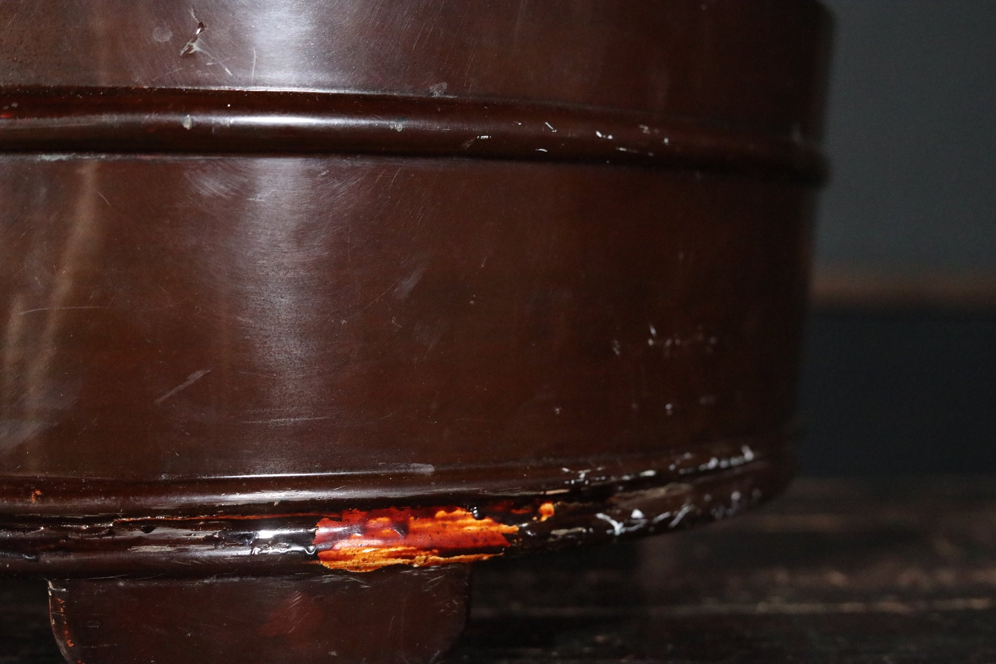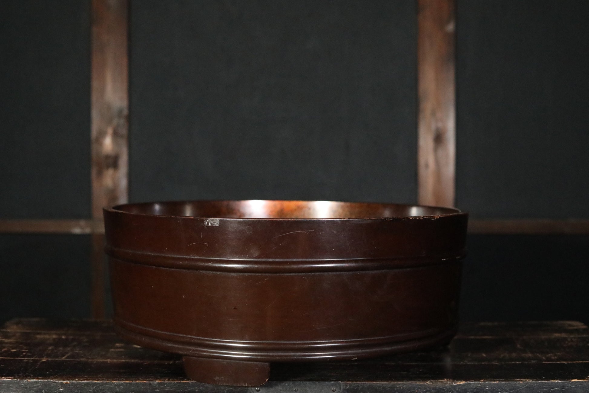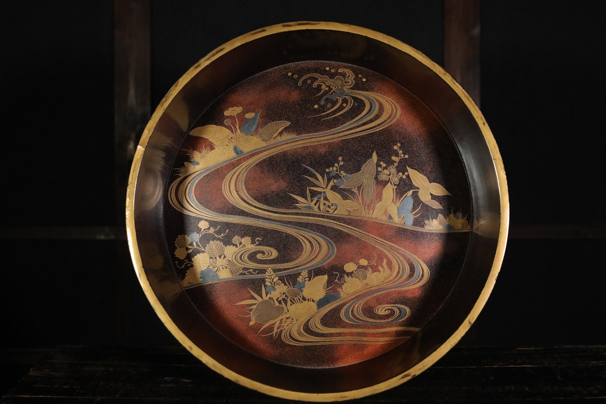 It is in good condition, but there are scratches and dirt due to aging. A transparent coating is applied on the rim to prevent the lacquer from peeling off. There are other areas of restoration as well.