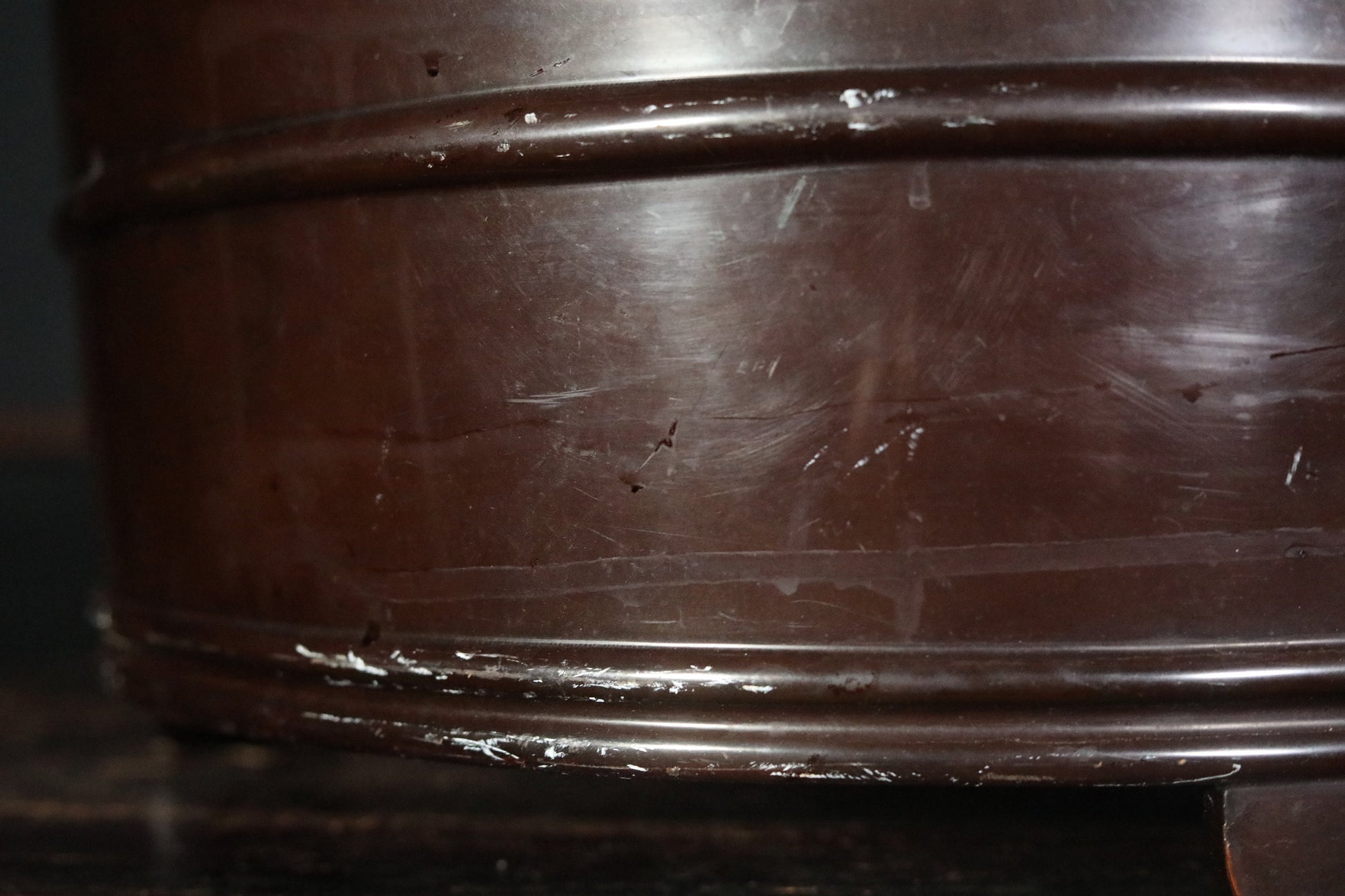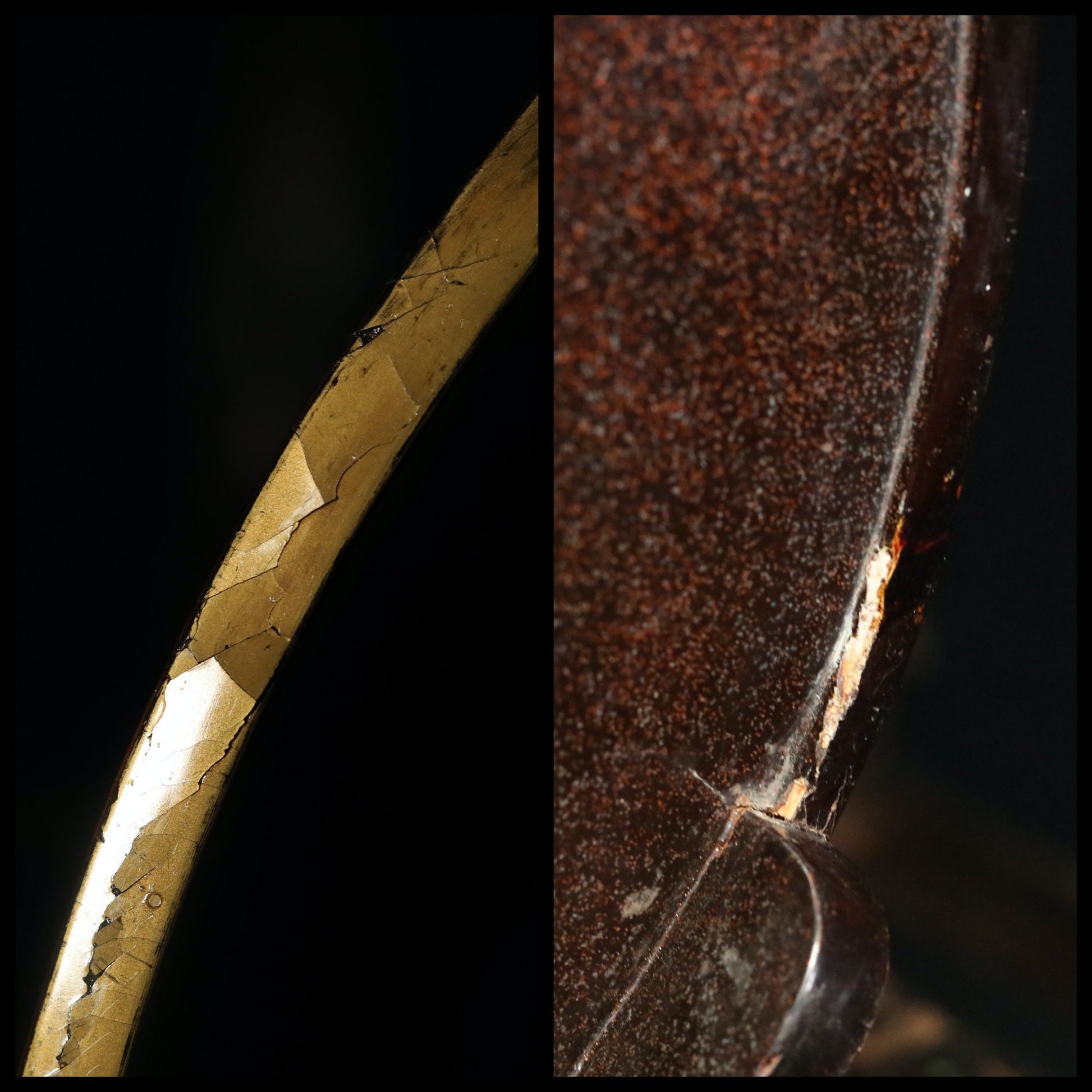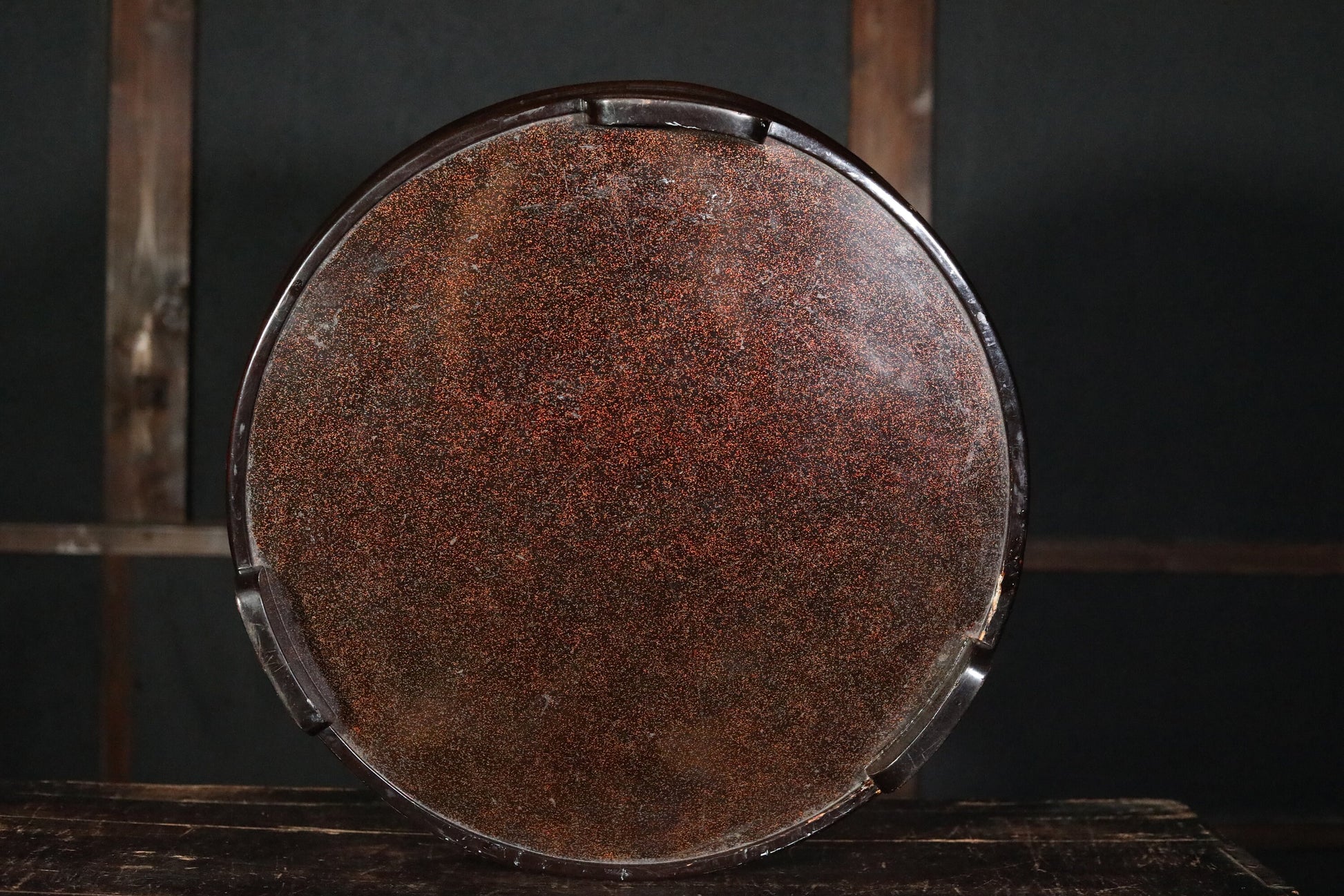 It is in good condition, but there are scratches and dirt due to aging. A transparent coating is applied on the rim to prevent the lacquer from peeling off. There are other areas of restoration as well.